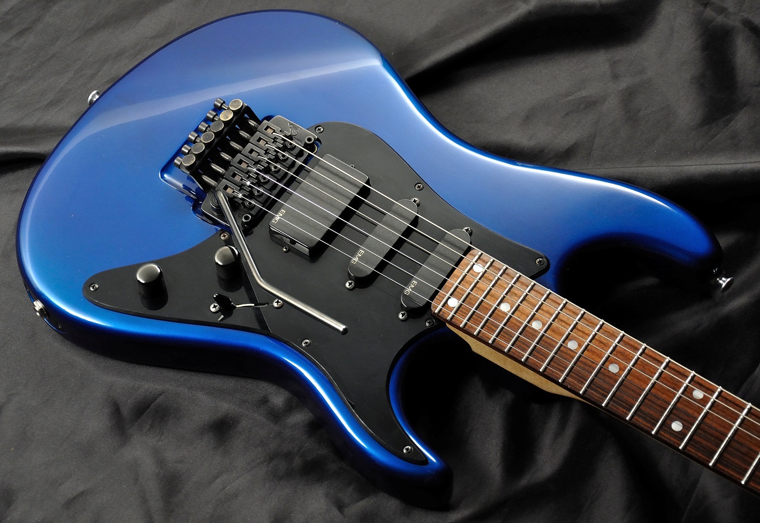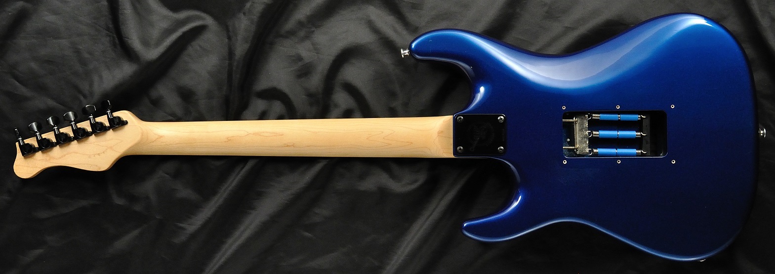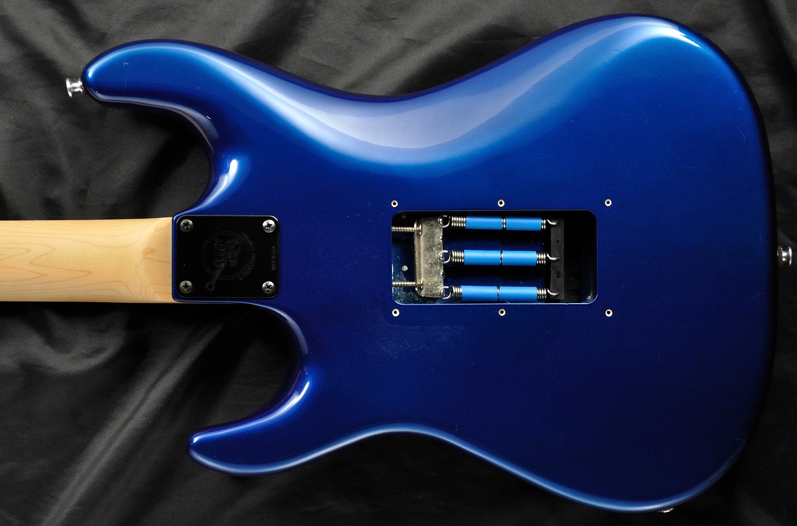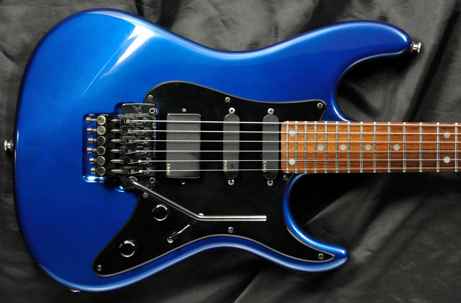 Trans blue, black hardware, Kahler Steeler bridge, Original EMG H/S/S IC SA/SA/85 pickups, full rewiring, stainless steel Jescar medium Jumbo frets, No load pot. Tone.