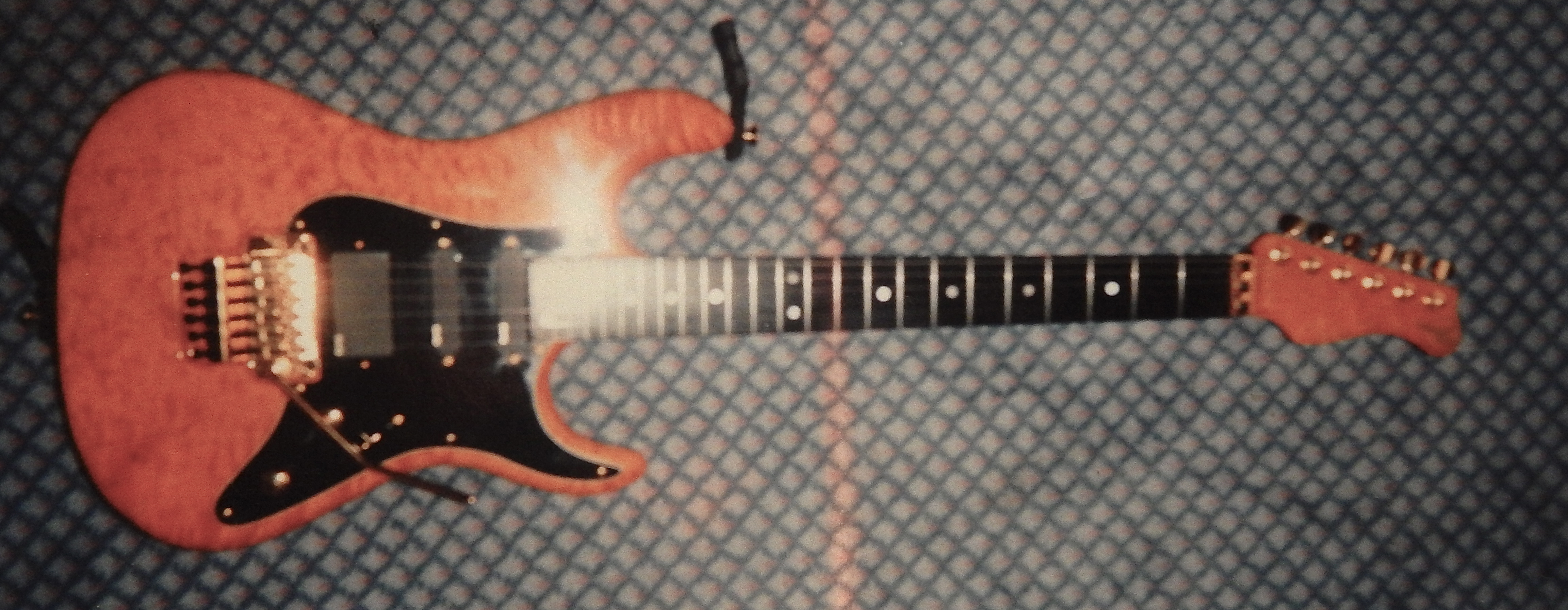 Body, 1 piece quilted maple body, neck in amber finish, ebony fretboard, gold floyd rose trem, EMG 2 x SA 1 x 85 pickups, black scratch plate. Dark wood knot near the (side flat mount) input jack. I used the guitar on many trade show demos for Marshall amps in 1992-93 and there's some video footage attached of one of these demos and a lesson at my home using that guitar.