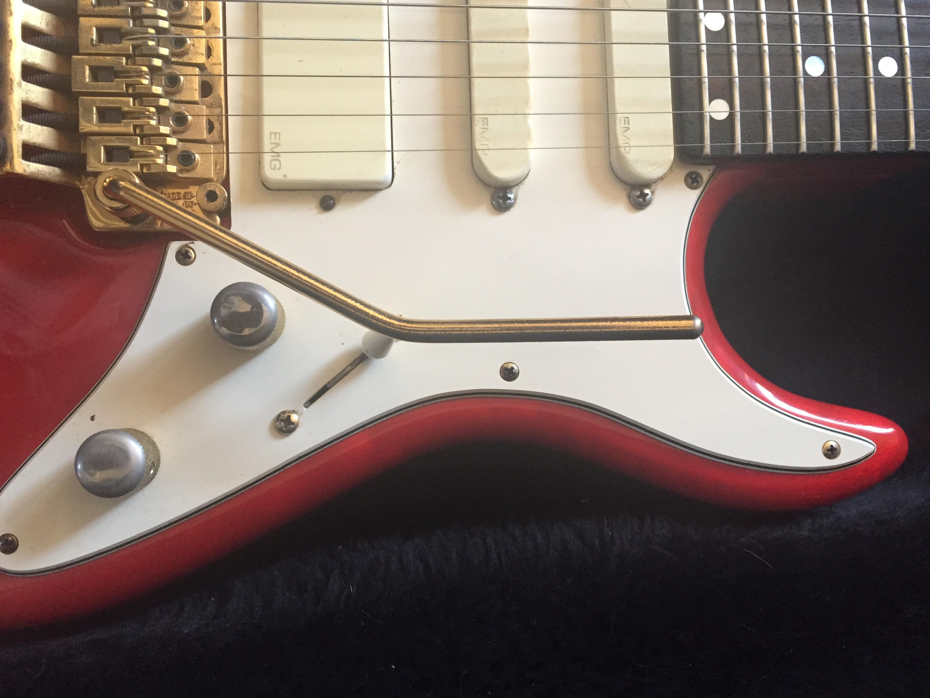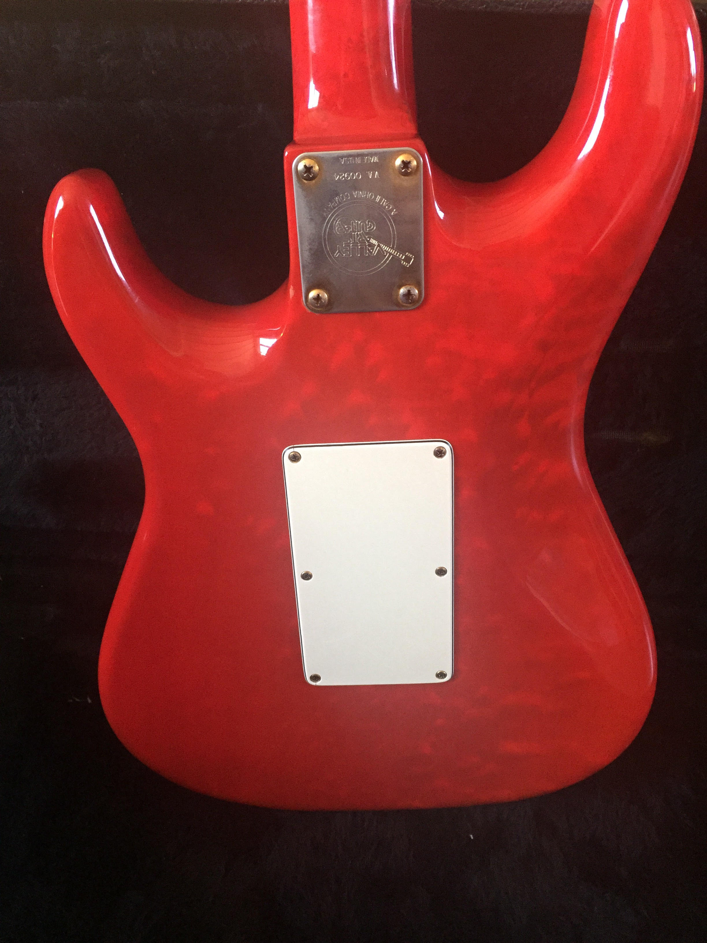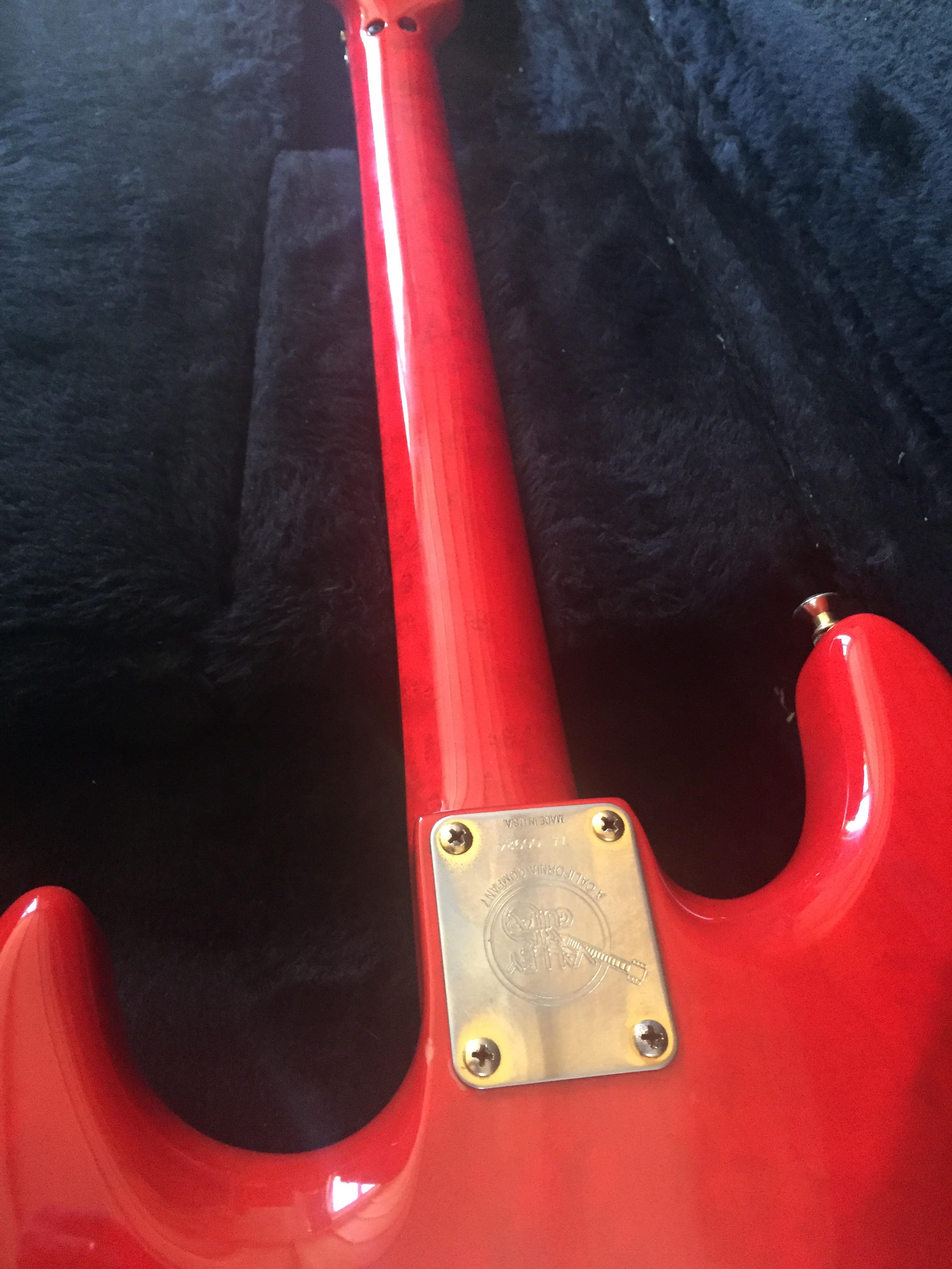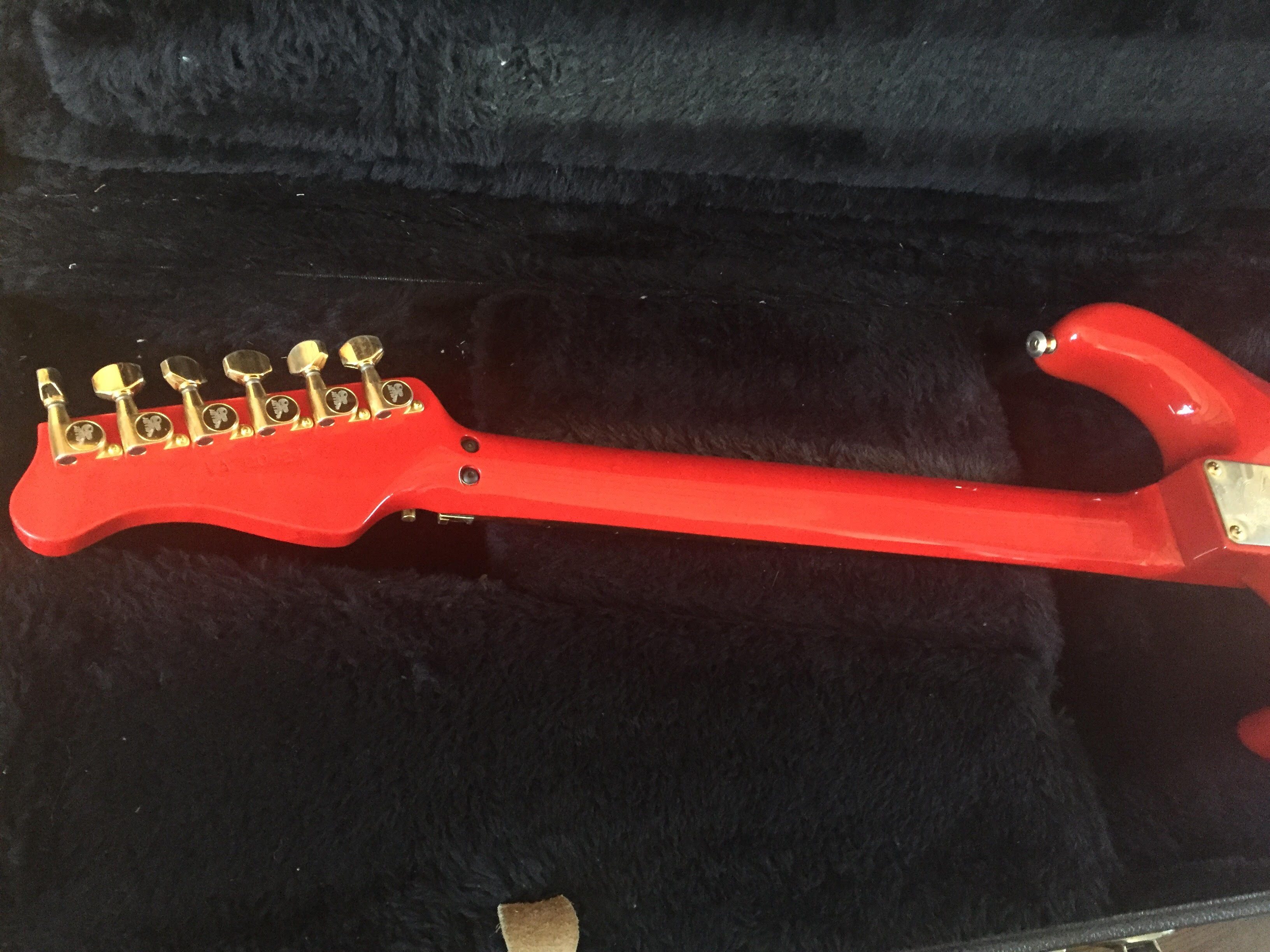 7/8 scale, trans red swamp ash, birdseye-maple neck with rosewood fretboard, Gold hardware, Shaller machineheads, Kahler professional bridge, EMG pickups (S,S,HB), white pickguard and a straplock system Bought this guitar brand new in the actual shop in LA in 1991. Tried several and this one stood out. Never looked back since.