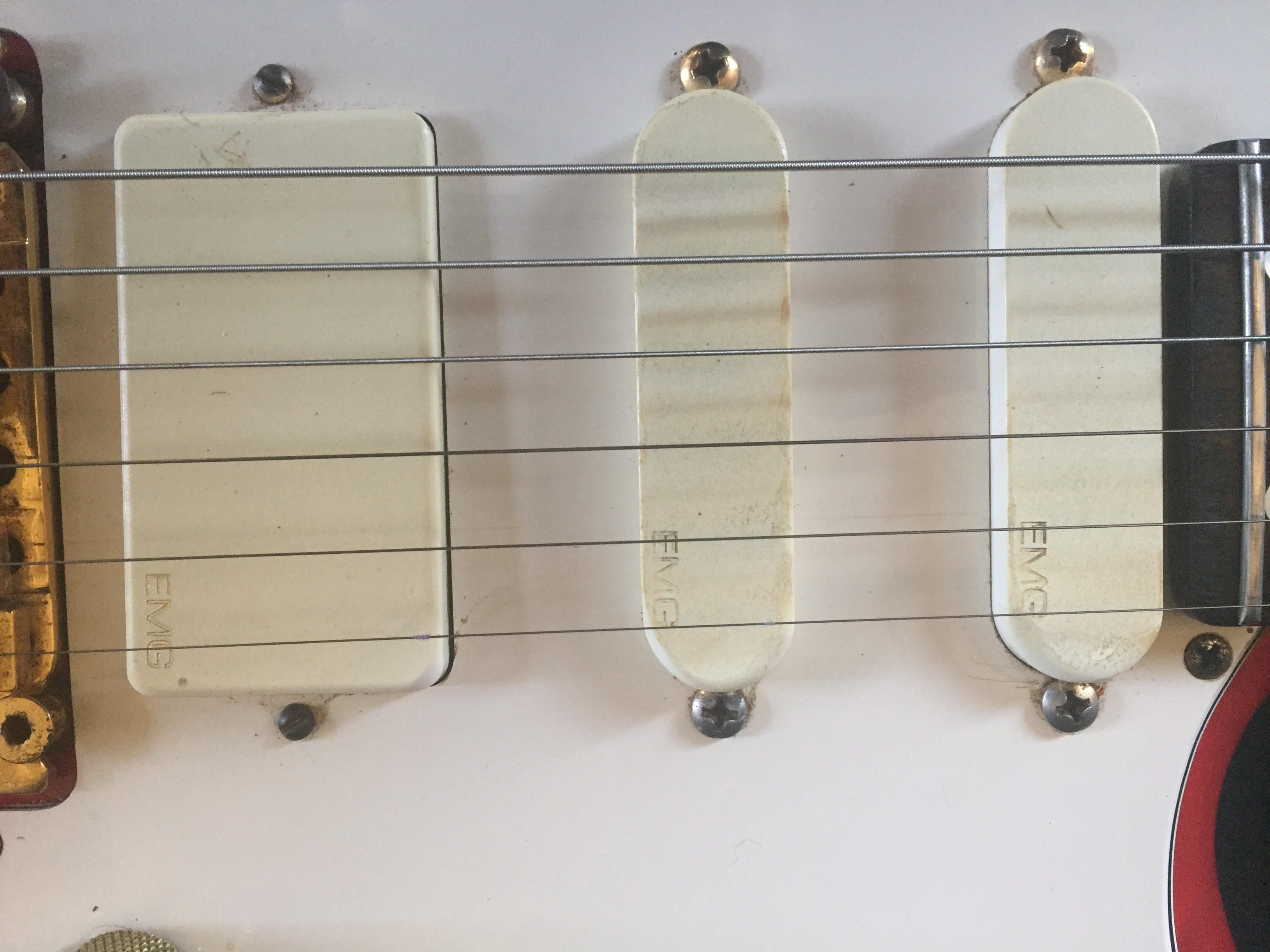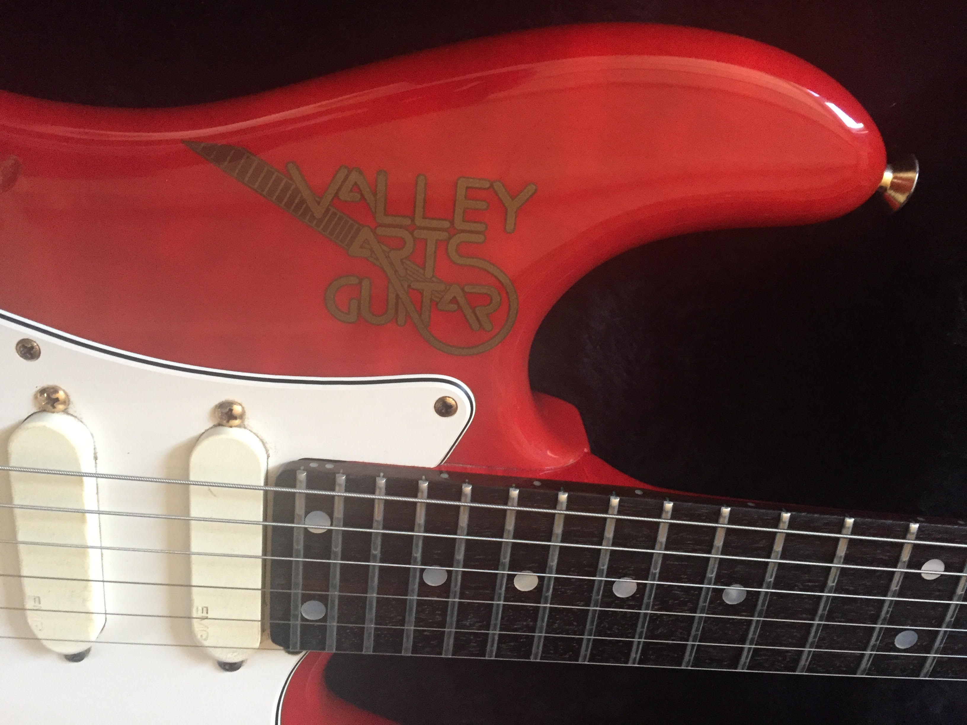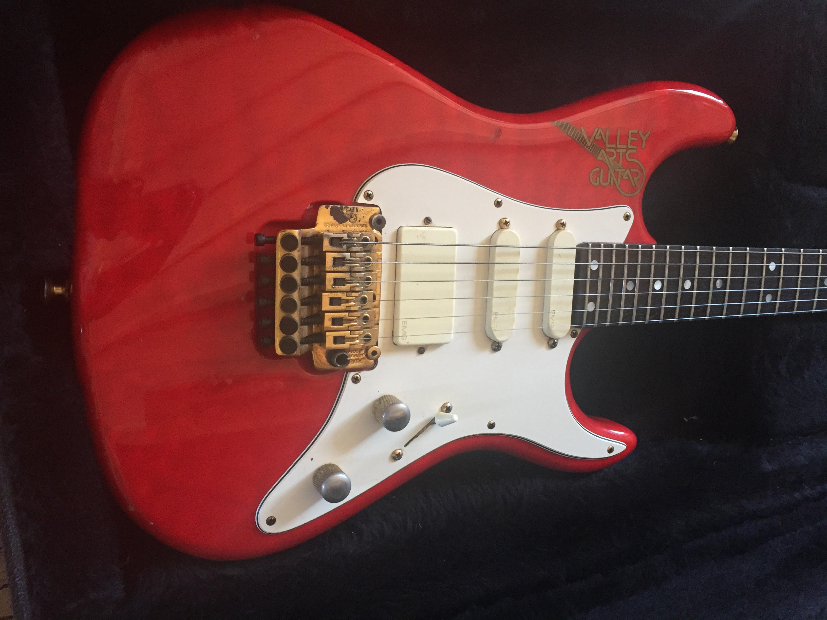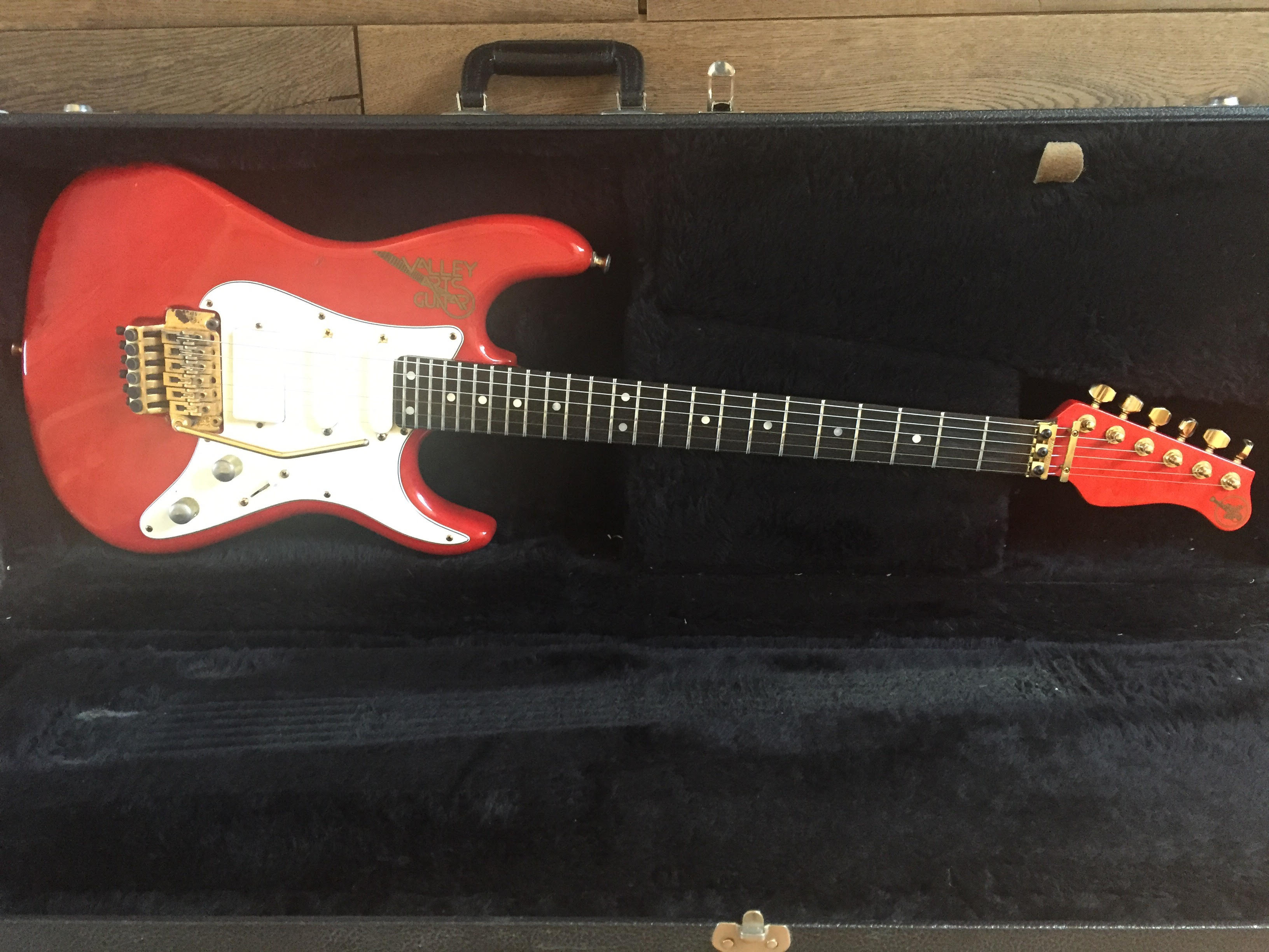 7/8 scale, trans red swamp ash, birdseye-maple neck with rosewood fretboard, Gold hardware, Shaller machineheads, Kahler professional bridge, EMG pickups (S,S,HB), white pickguard and a straplock system Bought this guitar brand new in the actual shop in LA in 1991. Tried several and this one stood out. Never looked back since.
