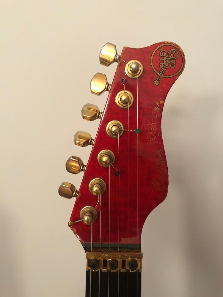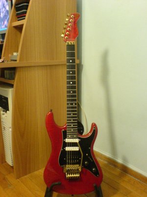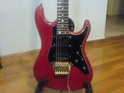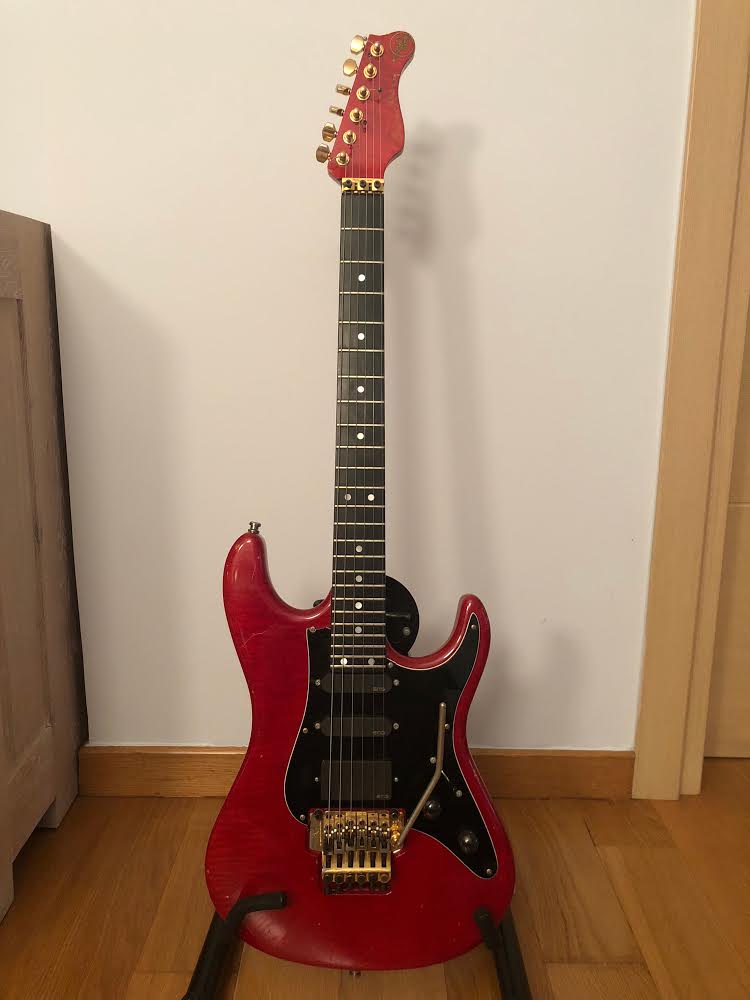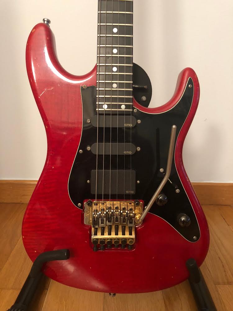Quilted maple body in Trans Red. Birdseye maple neck with ebony fingerboard and matching headstock.Kahler tremolo bridge, gold hardware. EMG SLV/SLV/85 pickups.