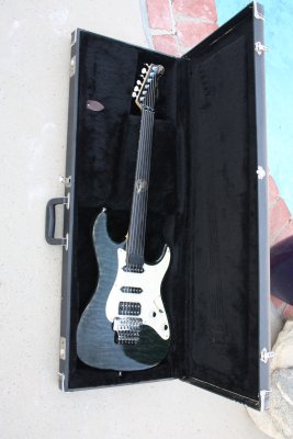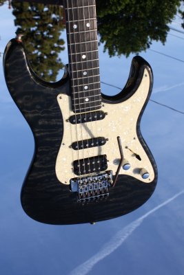 This a full size Transparent Black Bent S with a white M.O.P pickgaurd, stunning maple top with an alder back, Birdseye maple neck with an ebony fingerboard (with the original V.A fret protector), pickups are Hum (proto trem spaced Duncan JB) and to single coils (SSL-1 with the RWRP middle pick up), Chrome Kahler V.A Floyd Rose style locking bridge. All chrome hardware.