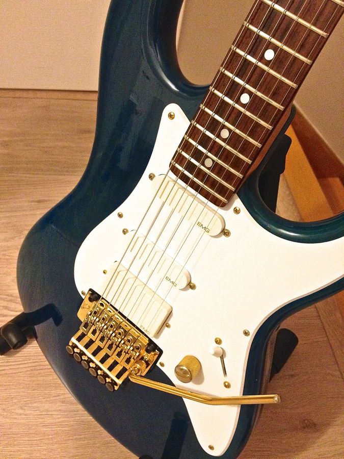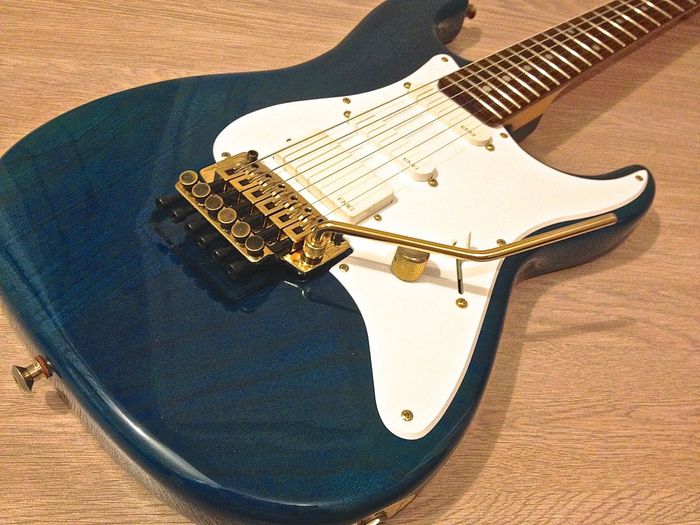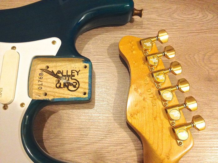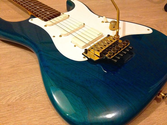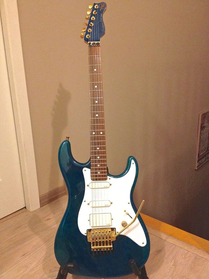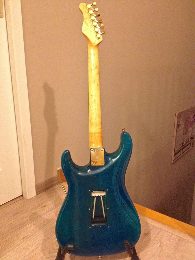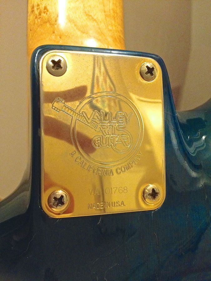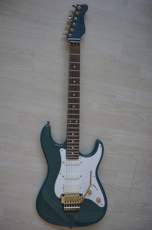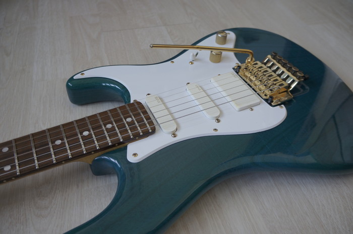 Trans green (faded to teal), ash body, birdseye maple neck, rosewood fretboard, gold hardware, VA logo Kahler bridge, SD pickups.