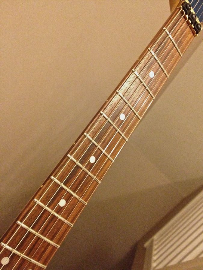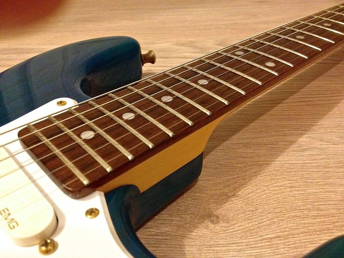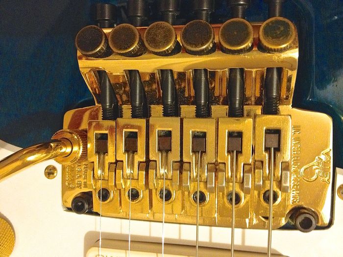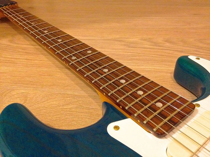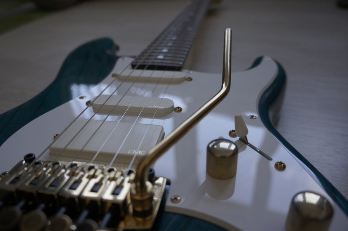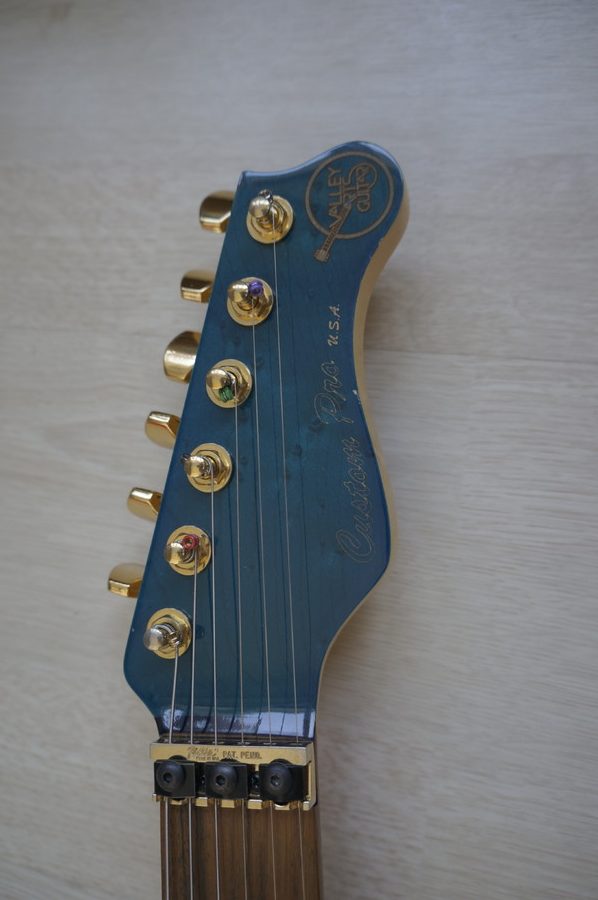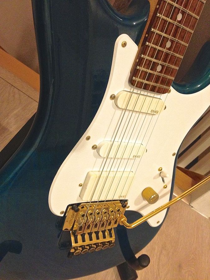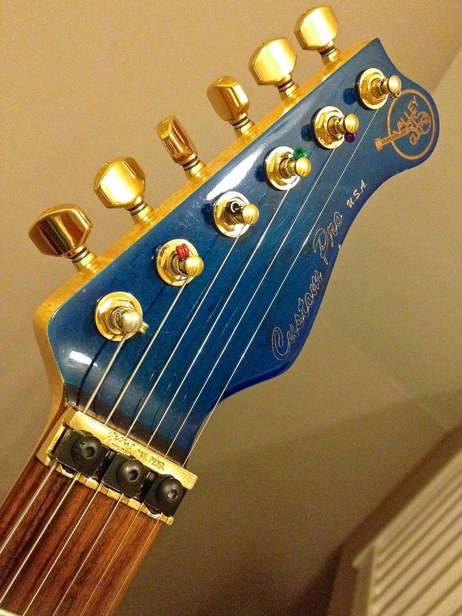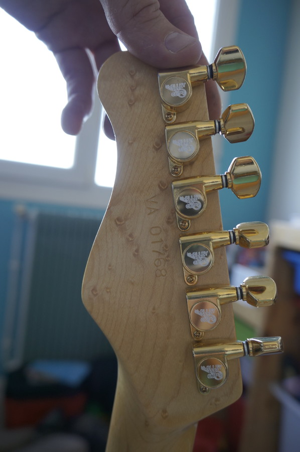 Trans green (faded to teal), ash body, birdseye maple neck, rosewood fretboard, gold hardware, VA logo Kahler bridge, SD pickups.