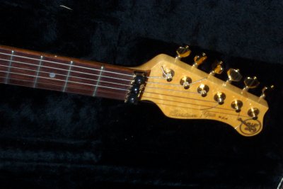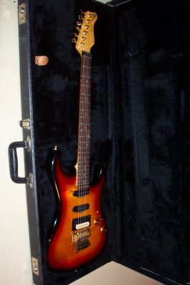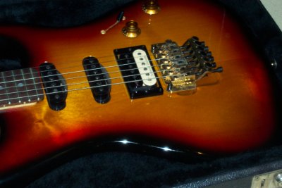 Floyd Rose (kahler) bridge, gold hardware. Seymour Duncan Humbucker, single coils? Not the original owner.
