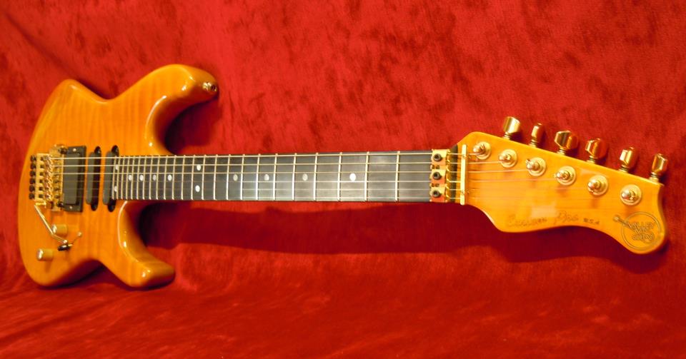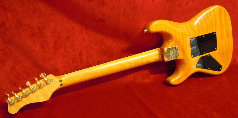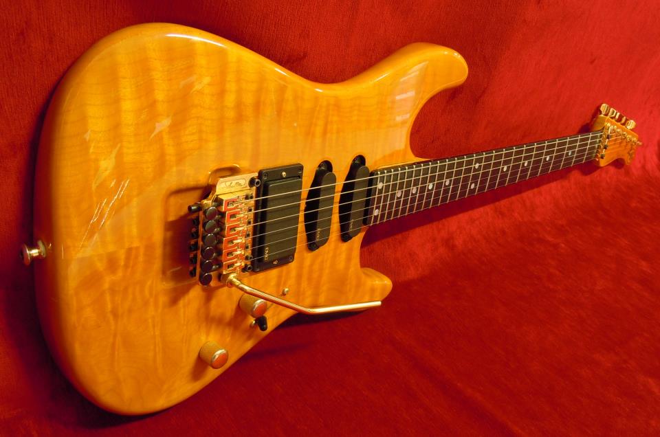bird eye maple with ebony fretboard, body 2pieces of hard figured maple, gold hardware, khaler (floyd lic. ) bridge, SSH emg pick/up. All original parts.