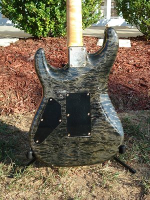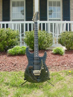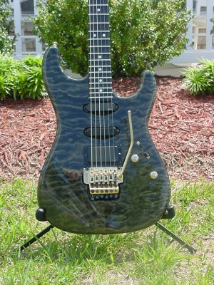 Trans black quilted maple body, birdseye maple neck, ebony fretboard, gold Kahler tremolo with locking nut, SA/SA/81 EMG pickups, Mike Mcguire signature, OHSC.