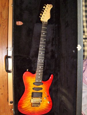 Ebony fingerboard, EMG, kahler floyd... I'm the second owner, it's all original ! I've purchased my VA custom pro about six years ago. The seller used to work for the only guitar-importer of Valley Arts in Holland. Now, it's very hard to get a Valley Arts in Holland so I was very lucky to come across one. The guitar has Seymour Duncan pickups and a Kahler/Valley arts bridge. It's all gold hardware. I've changed nothing so I think everything is original. I won't sell the guitar. The guitar plays great and looks awesome. I'll keep it forever I think.