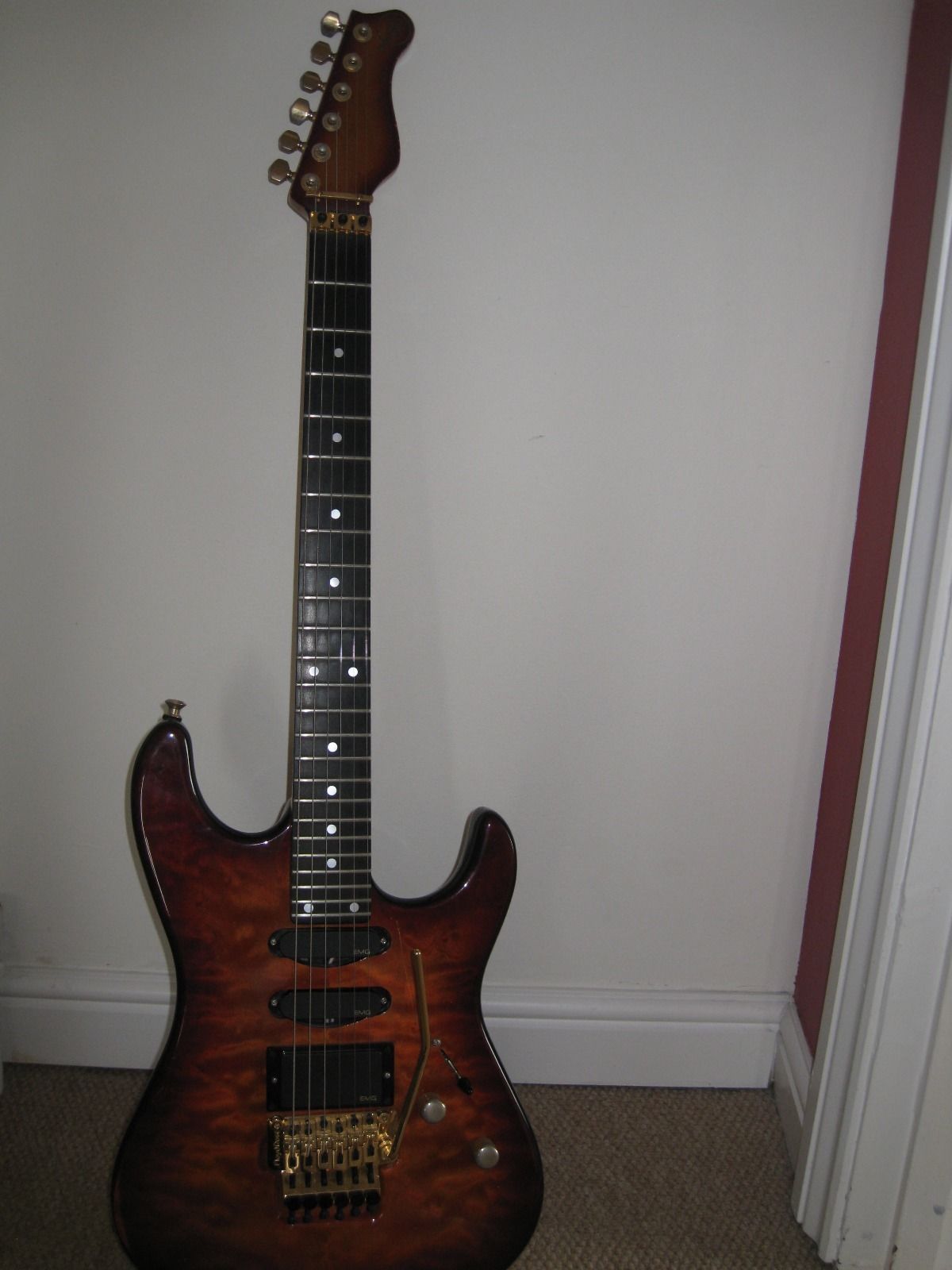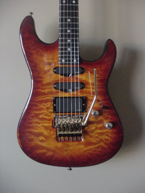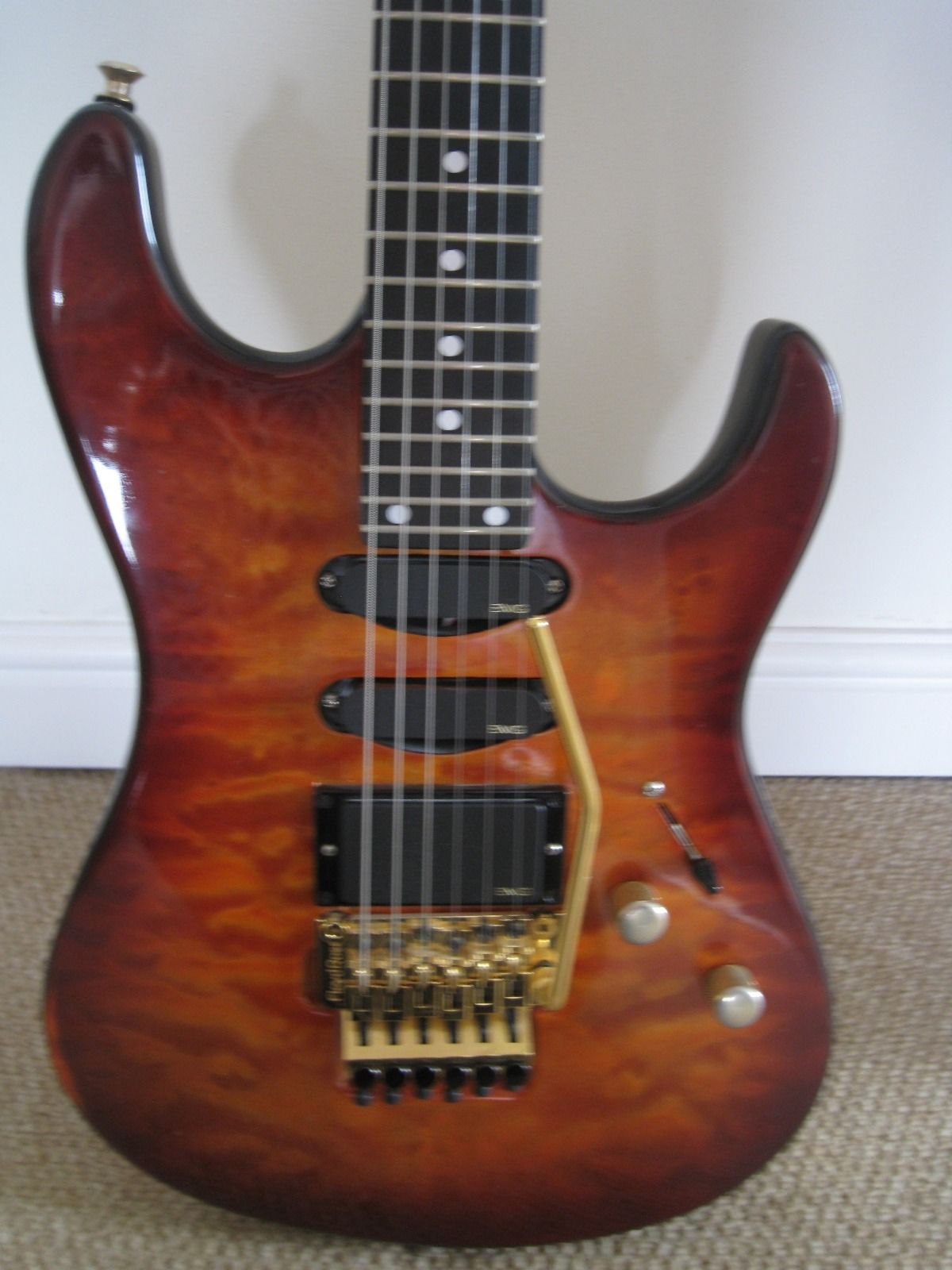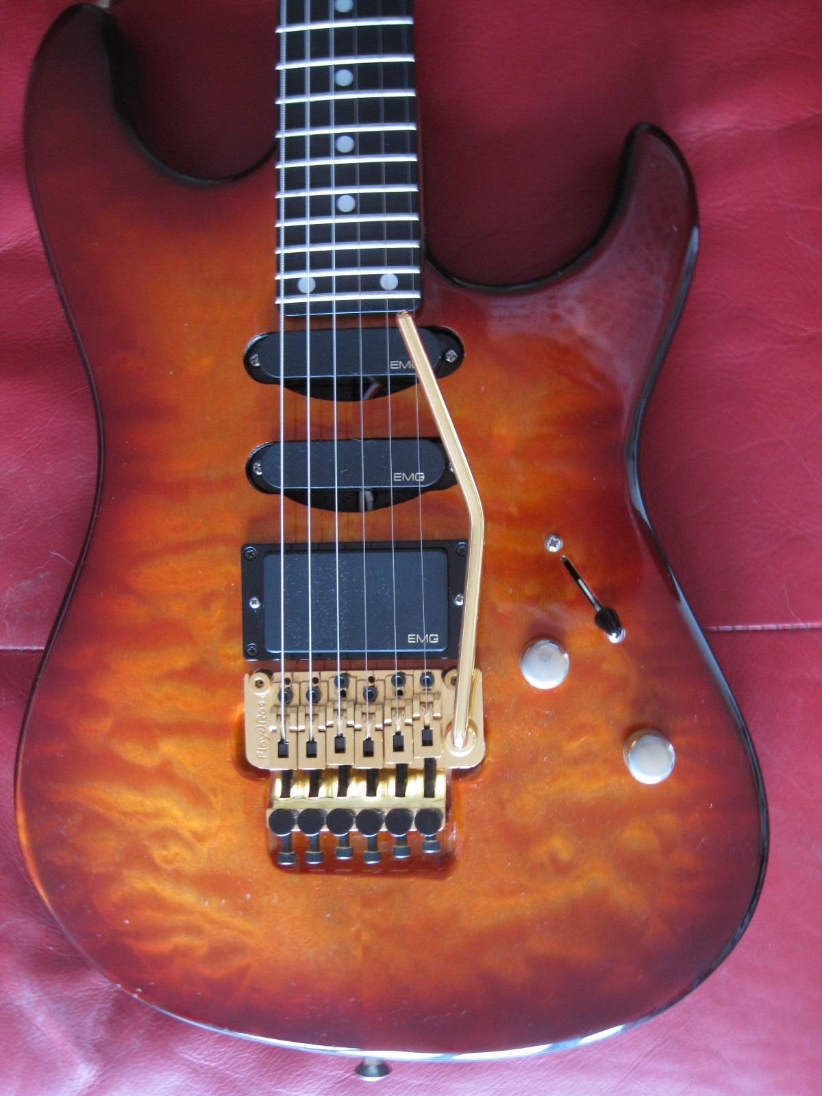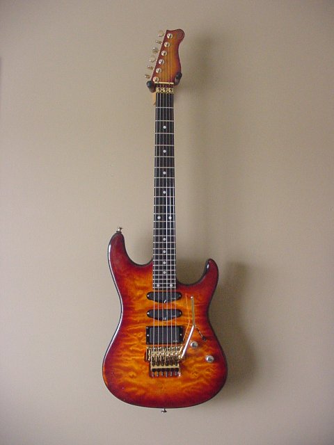 7/8 basswood body, bent S Quilted maple top, vintage burst finish, Floyd Rose, ebony fretboard, birds eye maple neck, SLV/SLV/85 EMG pickups. All gold hardware.
