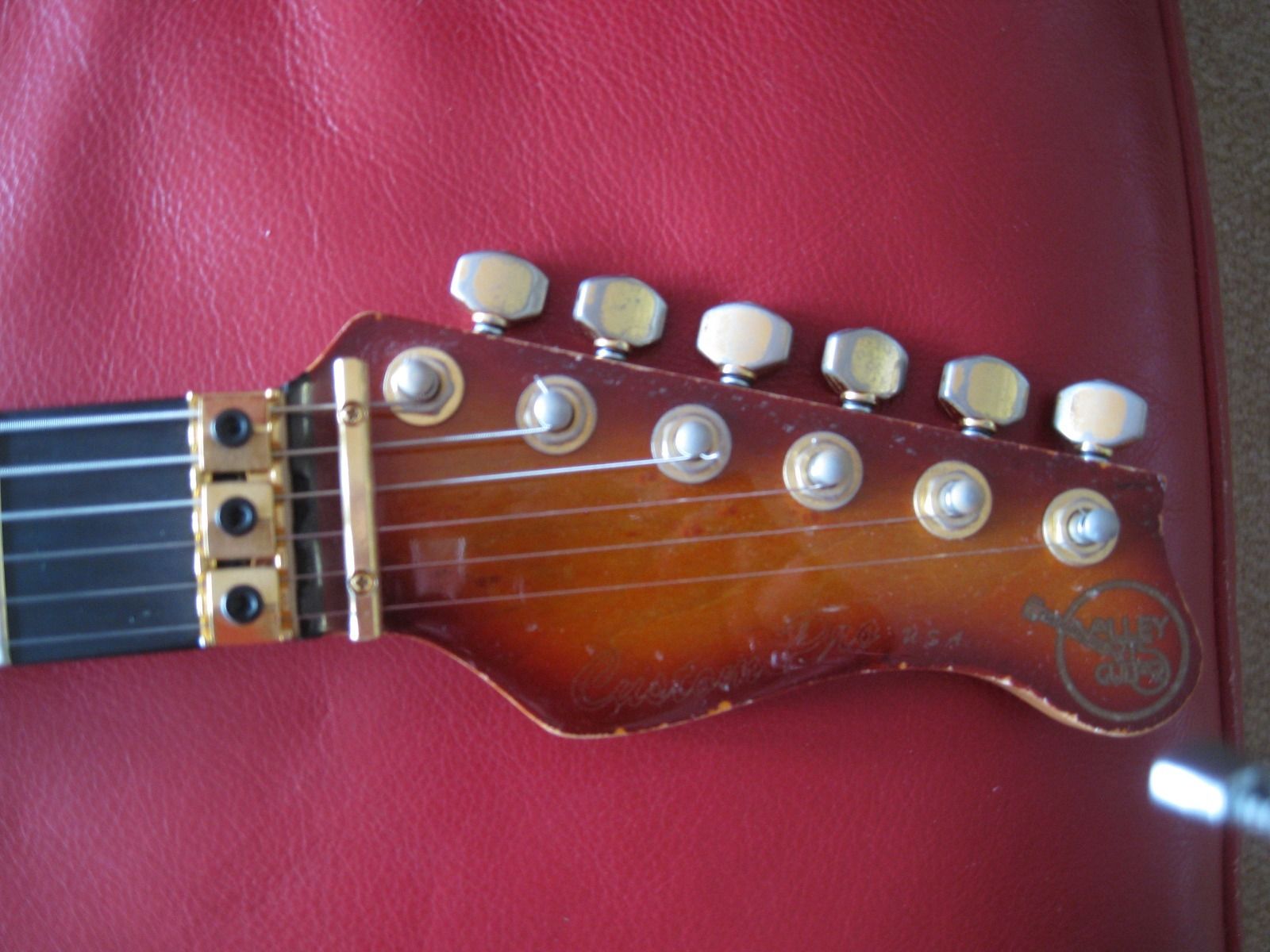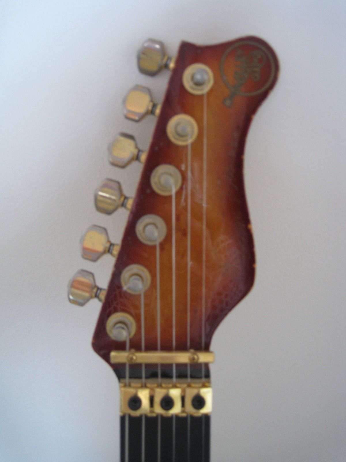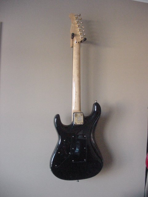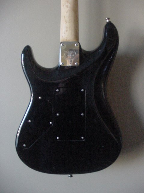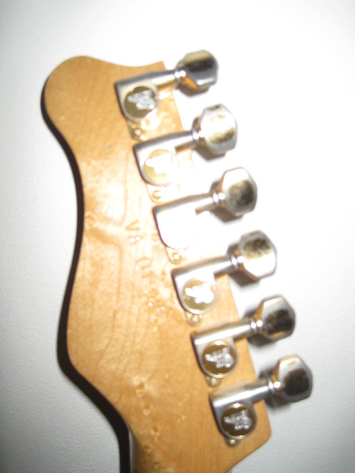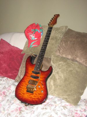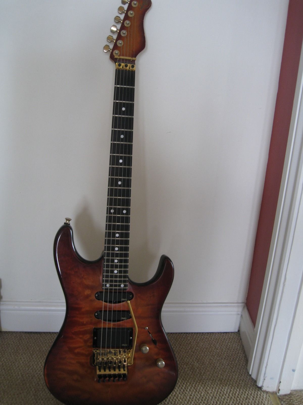 7/8 basswood body, bent S Quilted maple top, vintage burst finish, Floyd Rose, ebony fretboard, birds eye maple neck, SLV/SLV/85 EMG pickups. All gold hardware.