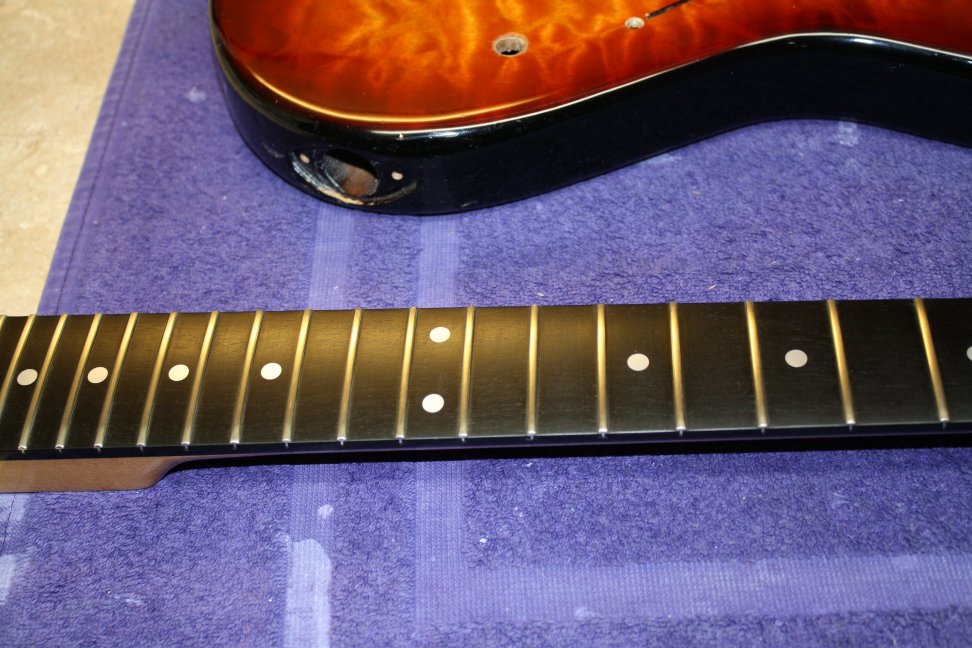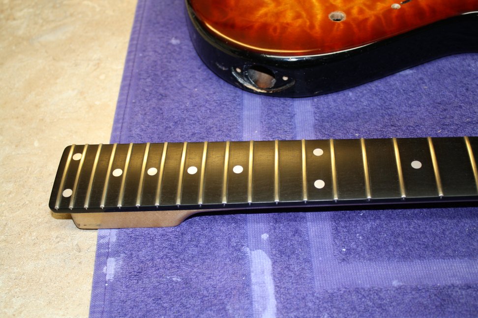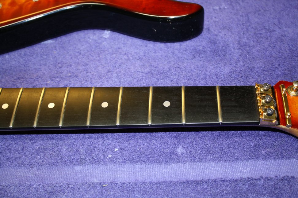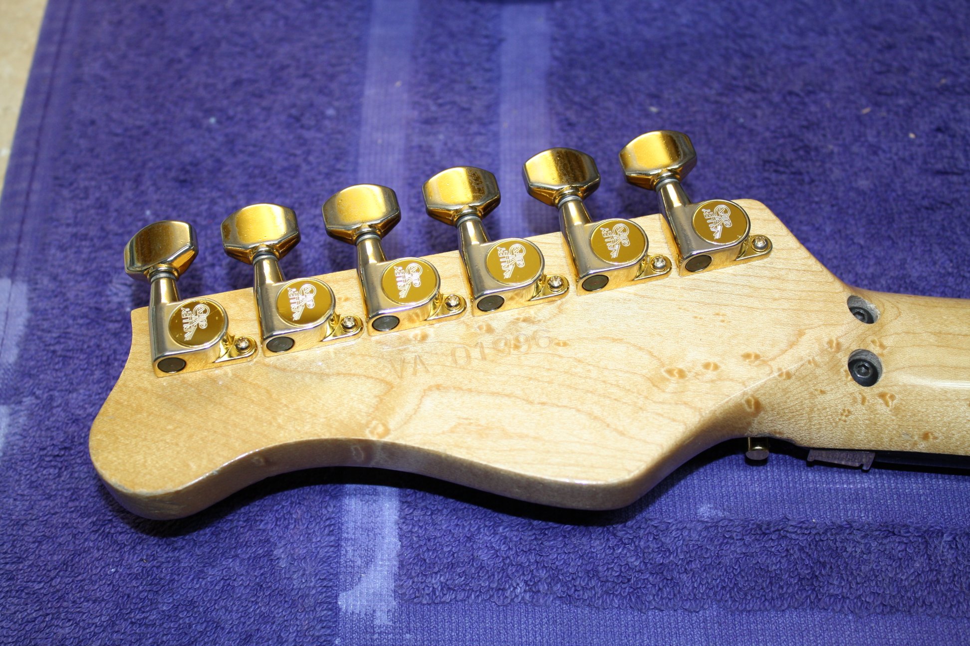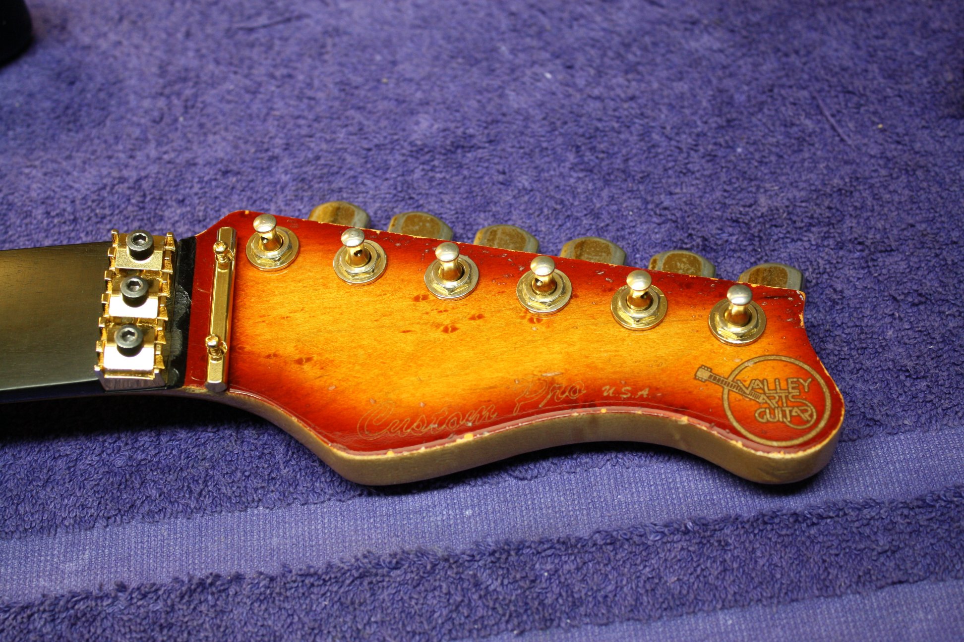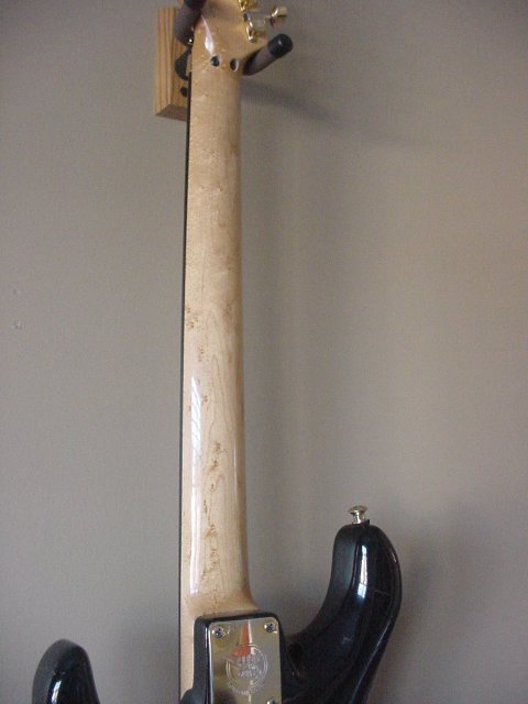 7/8 basswood body, bent S Quilted maple top, vintage burst finish, Floyd Rose, ebony fretboard, birds eye maple neck, SLV/SLV/85 EMG pickups. All gold hardware.