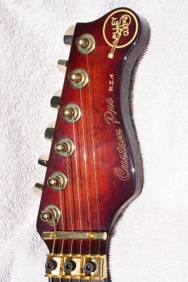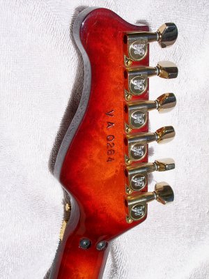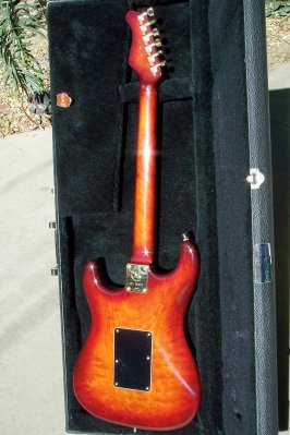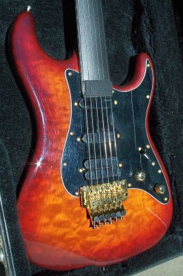 Lightly flamed maple body, light birdseye on the maple neck. Floyd Rose trem. Ebony fret board. Gold hardware. Evans pickups, rear one tapped. Emberglow finish