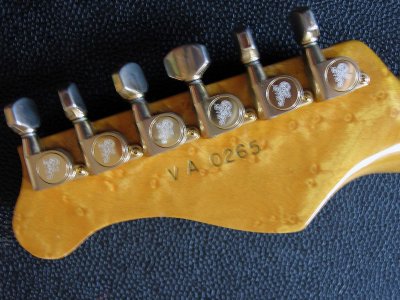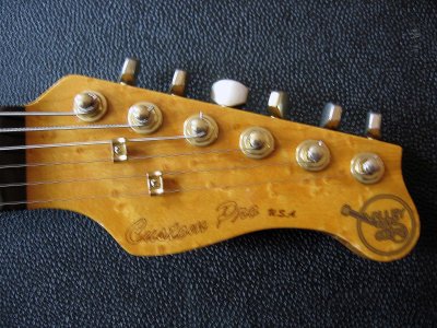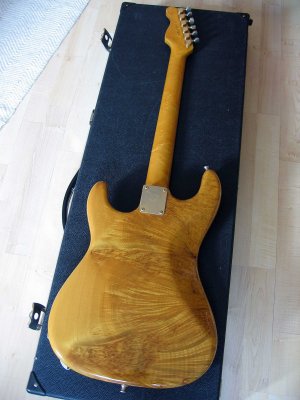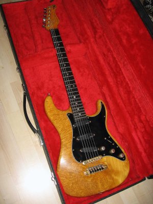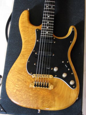 The body of the guitar is one piece burl maple birdseyes. The neck is although in one piece maple birdseye. The fret board is black ebony with pearly inlays. EMG active singlecoils. Gold Hardware. The sound and the sustain from this guitar is perfect. The guitar were used from some musicans for several studio records and the result from recording was perfect.