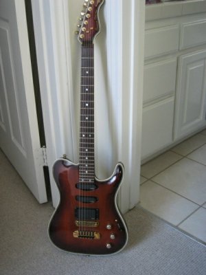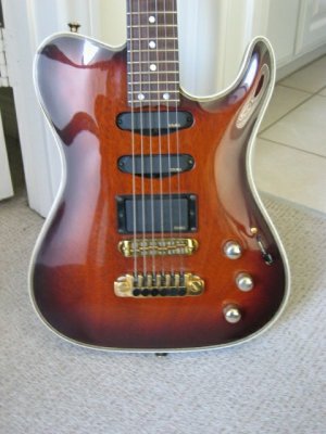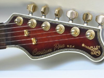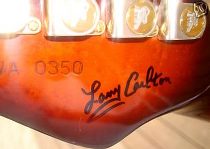 This is a rare Custom Pro model that Mike McGuire named “the Micker” after his son, it wasn’t created for Larry Carlton but Larry fell in love with it and ordered one, he toured with it extensively and it was also used it in his album “On Solid Ground” with Larry holding it on the album cover. I spoke this year to both Mike McGuire and Al Carness (now with Gibson) which told me that less than 10 of those guitars were made but they weren’t sure of the number, Al remembered that besides Larry, guitarist Andy Masters owns 2 and Vince Gill also owns one. Specs: This was the first VA model to feature the “Inter-lock” system patented by VA using no screws or bolts to hold the neck in place, the heel was also contoured as if it was a one piece instrument. The guitar is a mahogany body & neck, with a hand carved top and herringbone binding , EMG pickups (SA,SA,85) Tailpiece and bridge (tuneomatic)bolted to body with tuning wheels at tailpiece for fine tuning, the switch is a 5 way with volume, tone and mid-boost. Fretboard is ebony with mother of pearl dots and hardware is gold ... all original. The previous owner had this guitar signed by Larry Carlton.