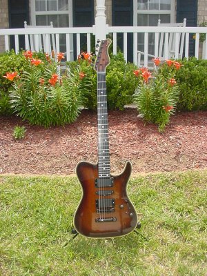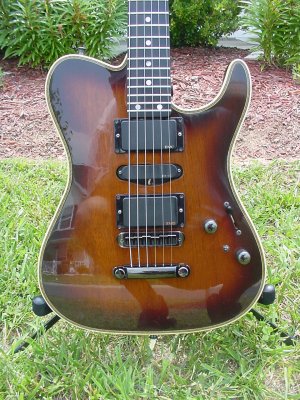 Tele brownburst, mahogony body, herringbone binding, birdseye maple neck, ebony fretboard, interlocking neck, EMG pickups. tele brownburst, interlock neck