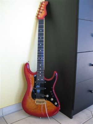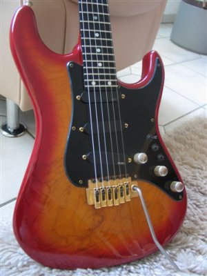 7/8 Size ,1 Piece Quilted Maple Body, Birdseye Neck with Ebony Fingerboard. Treble/Bass Boost ( I forgot the Name - SPC, SPX ??). Switch on/off for every P.u. I became the Guitar with a Vintage Tremolo by Di Marzio because I don t wanted a FR or Kahler. The other altenative were a Stop Tailpiece, but its looks too strange for me on a Strat. So I ve asked for a normal Tremolo. A few years later I changed to a Wilkinson VS-100.