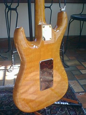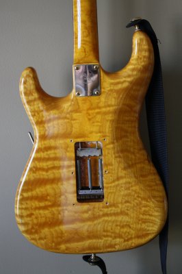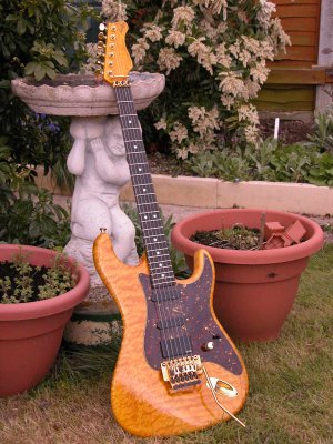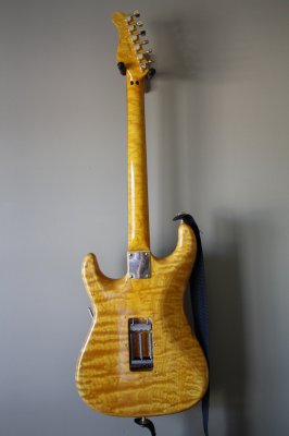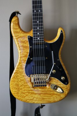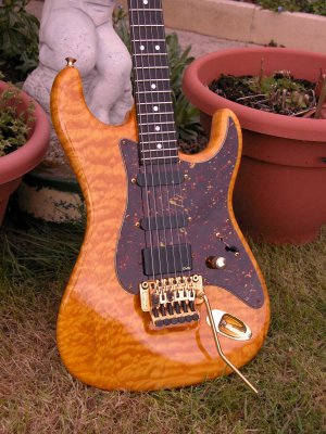 I got this guitar third hand from my good friend, Lee Slater. This guitar was originally bought from the Valley Arts shop in California. The original owner had completed the warranty card but never sent it back to the shop. Lee christened it hunnybunny due to the colour. Opening the case for the first time is a visual treat rarely experienced, especially if you like figured maple. The grain and finish make this guitar stand out above the rest. The EMG pickups (SA/SA/85) are very consistent at all venues. The body is heavily contoured and the neck profile is very comfortable. Id say a cross between a C shaped Fender neck and a 1960 sunburst Les Paul. So, not too fat and not too chunky. The huge slab of Ebony that makes up fingerboard contributes not only to the feel of the neck but also the tone. Most Custom Pros appear to be quite dark acoustically but when you plug them in they come alive! This one is no exception. The guitar weighs in at about 8Ib 4oz. Thats pretty heavy for a Strat shaped guitar but remember, that body is a solid lump of maple.