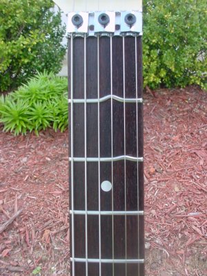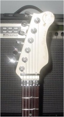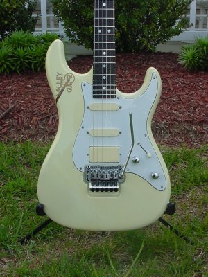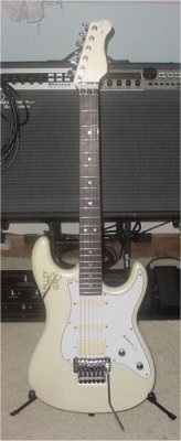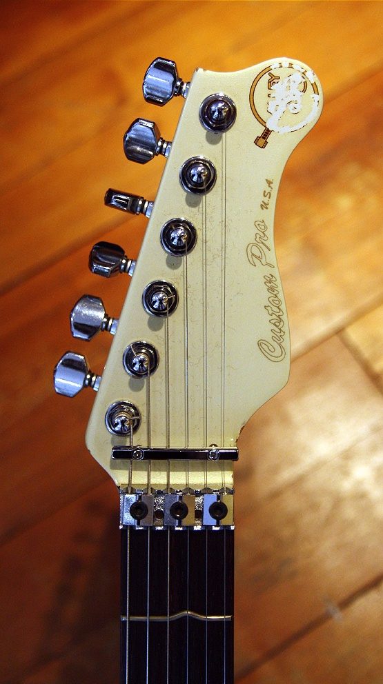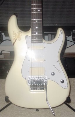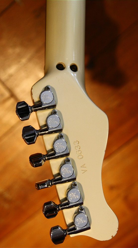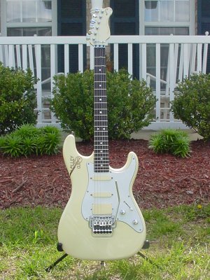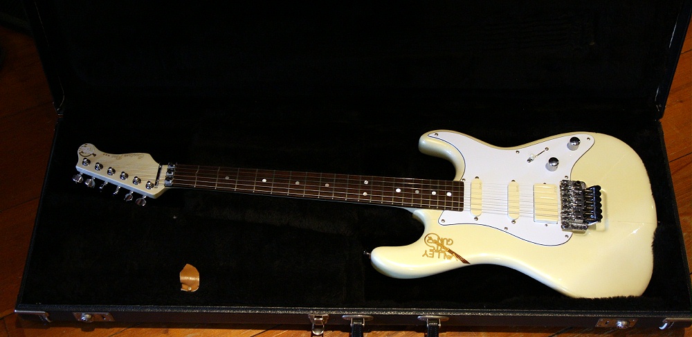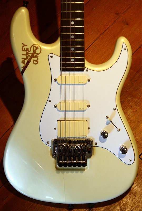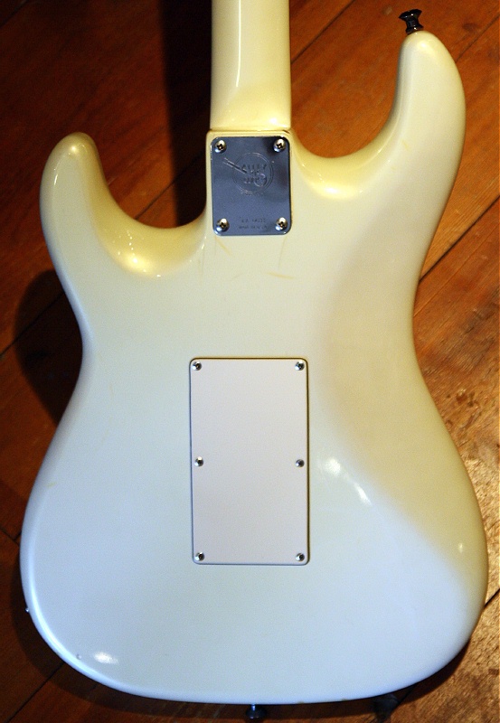 Pearl white finish with body decal, White active EMG pickups (SSH), Chrome Schaller bridge with locking nut, Fretwave system installed (see 'image3' below), Rosewood fretboard, OHSC. Martin: "This was run #2, completed March of 1990. There was 20 guitars in this run of which most went to our Australian Distributor, MUSIC LINK. Your guitar should be PEARL WHITE, alder body, 25.5 scale length, maple neck with rosewood fingerboard, chrome hardware, EMG pickups, white/black/white pickguard, with a body decal. Your guitar was completed and went through QC on February 23, 1990. We also wrote it in the neck pocket and on the neck. The date will be different there because this date was during the building process."