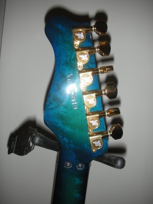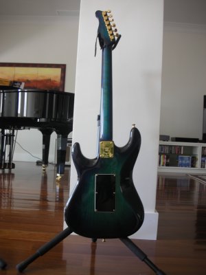 Blueburst finish; swamp ash body; rosewood fingerboard; EMG pickups (SSH); locking tremelo; gold hardware; HSC; no modifications