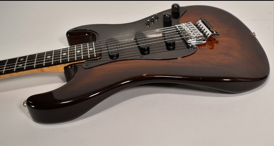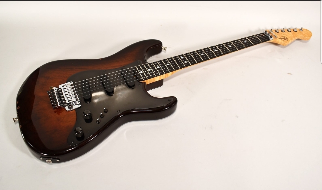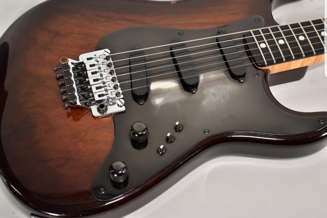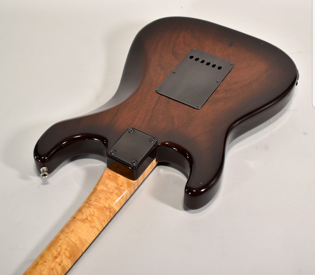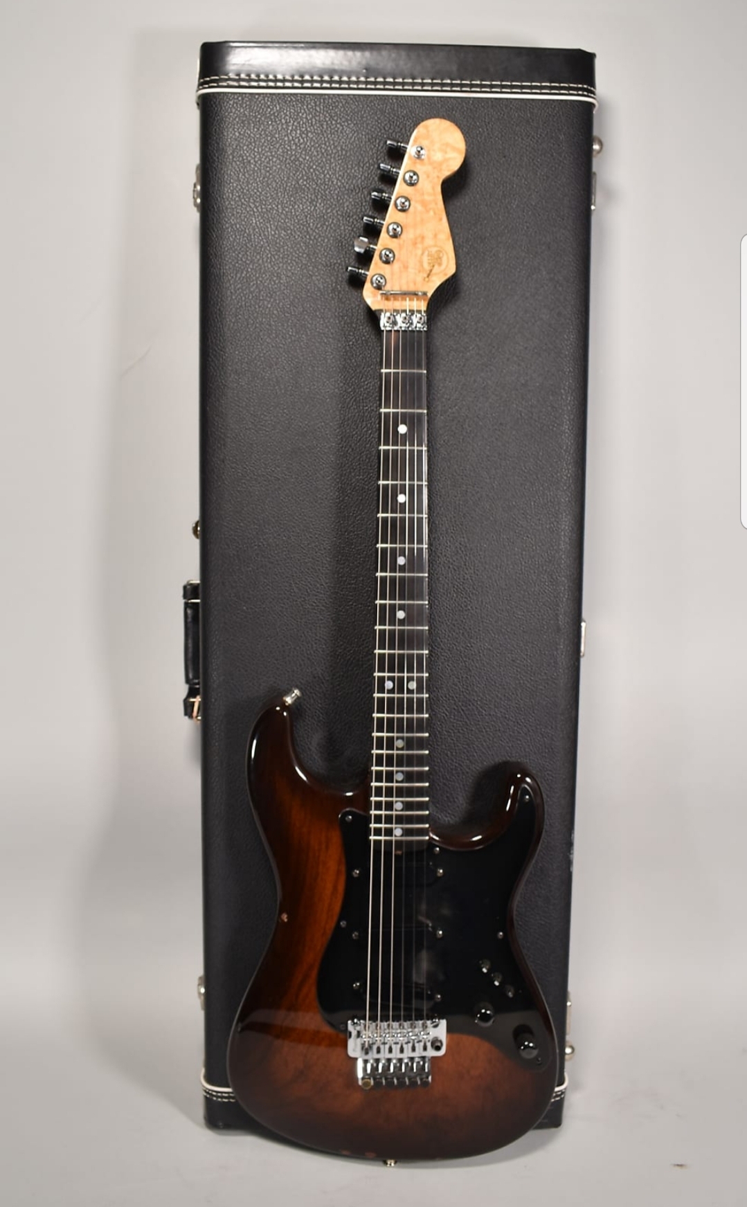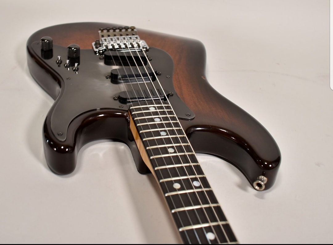 Rosewood Body, birds eye maple neck, ebony fingerboard, Schaller tuners, Passive Seymour Duncan stacks, volume & tone, 3 position switches, on-off-phase, Floyd Rose Trem.
