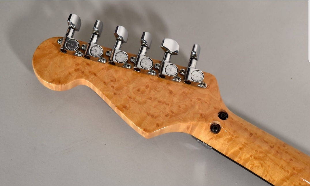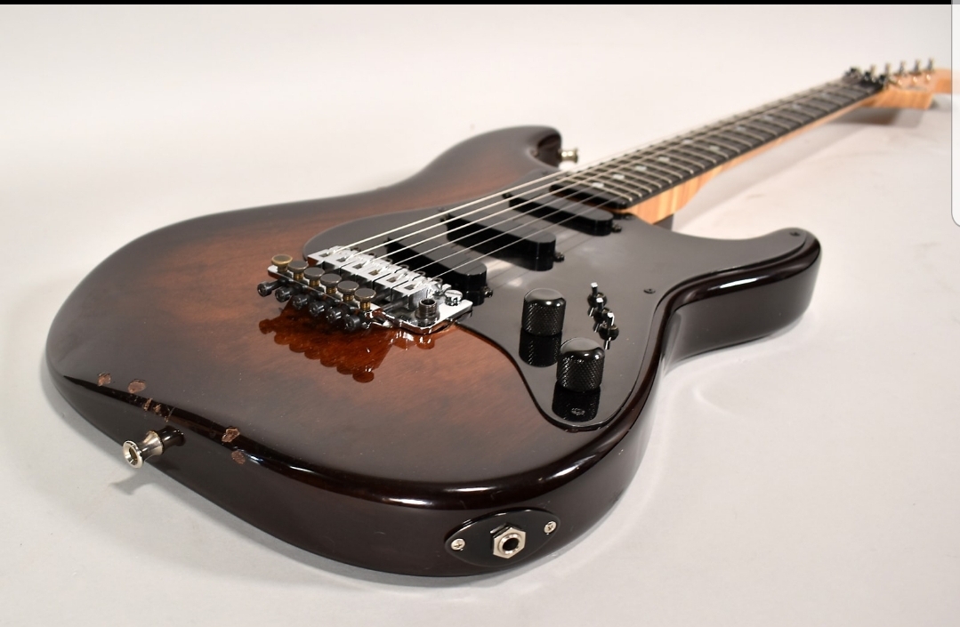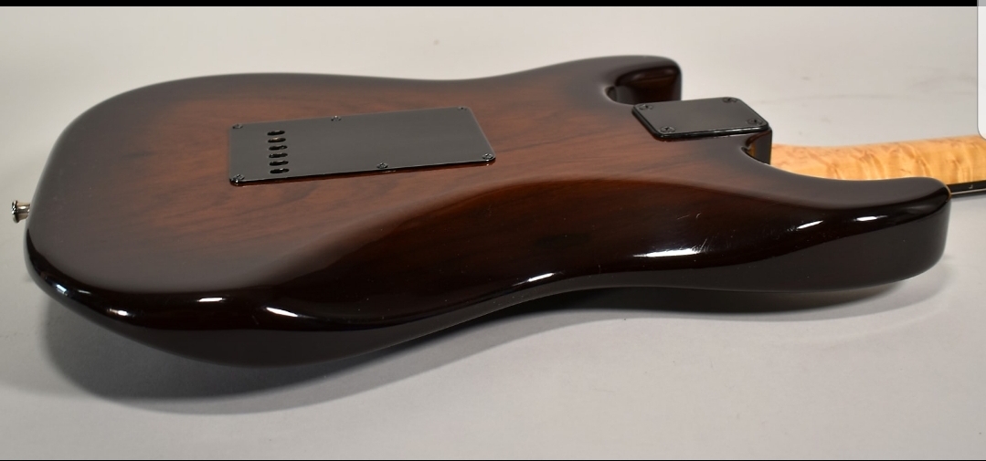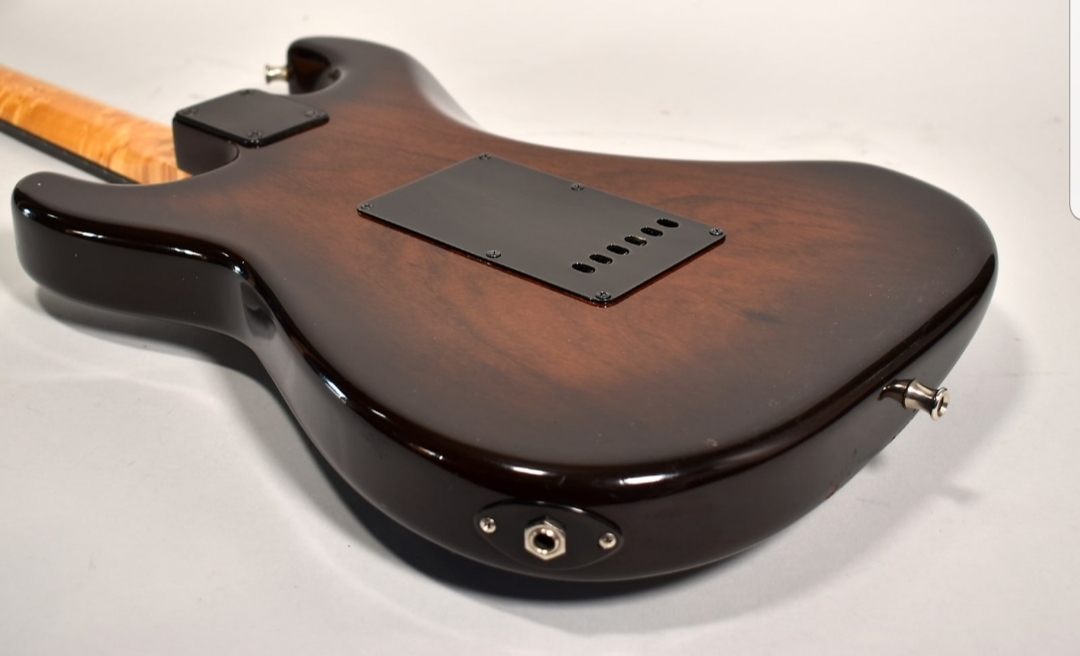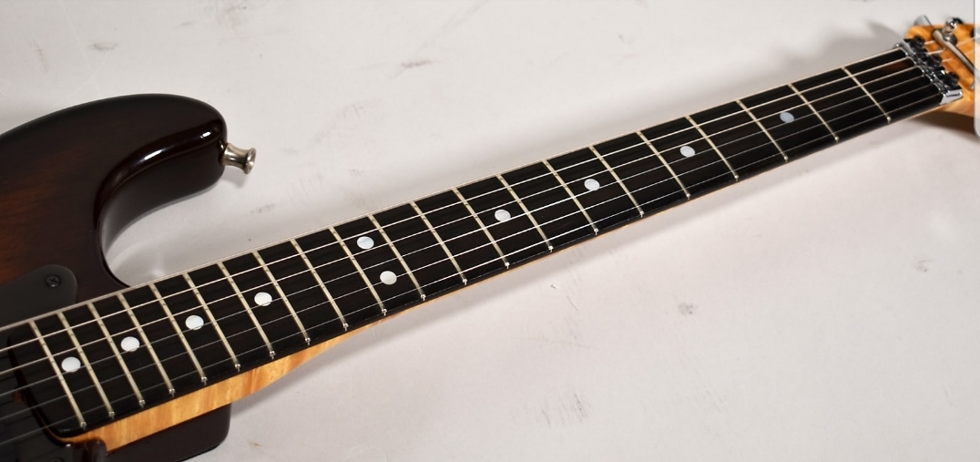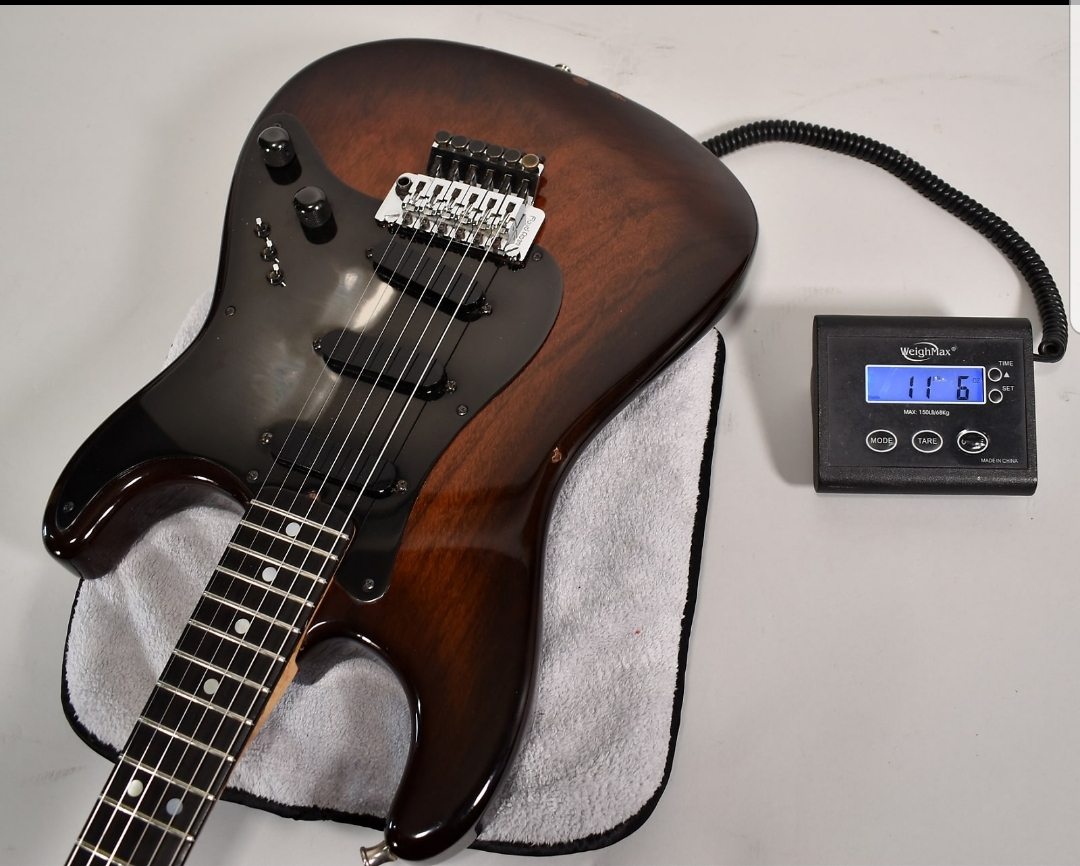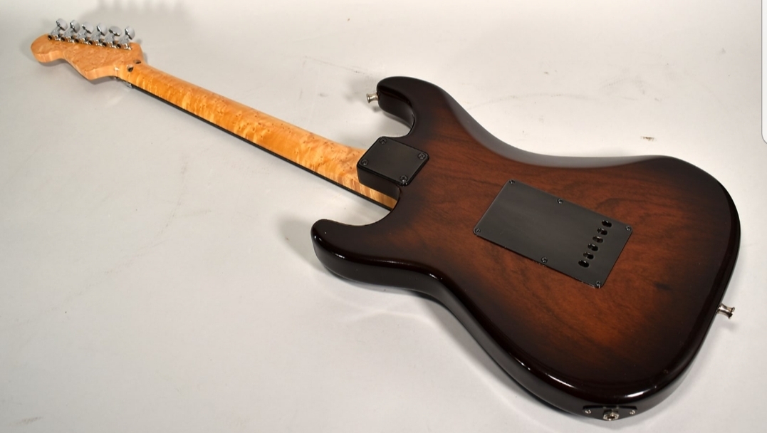 Rosewood Body, birds eye maple neck, ebony fingerboard, Schaller tuners, Passive Seymour Duncan stacks, volume & tone, 3 position switches, on-off-phase, Floyd Rose Trem.