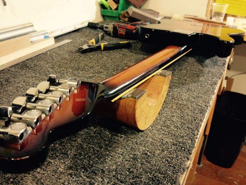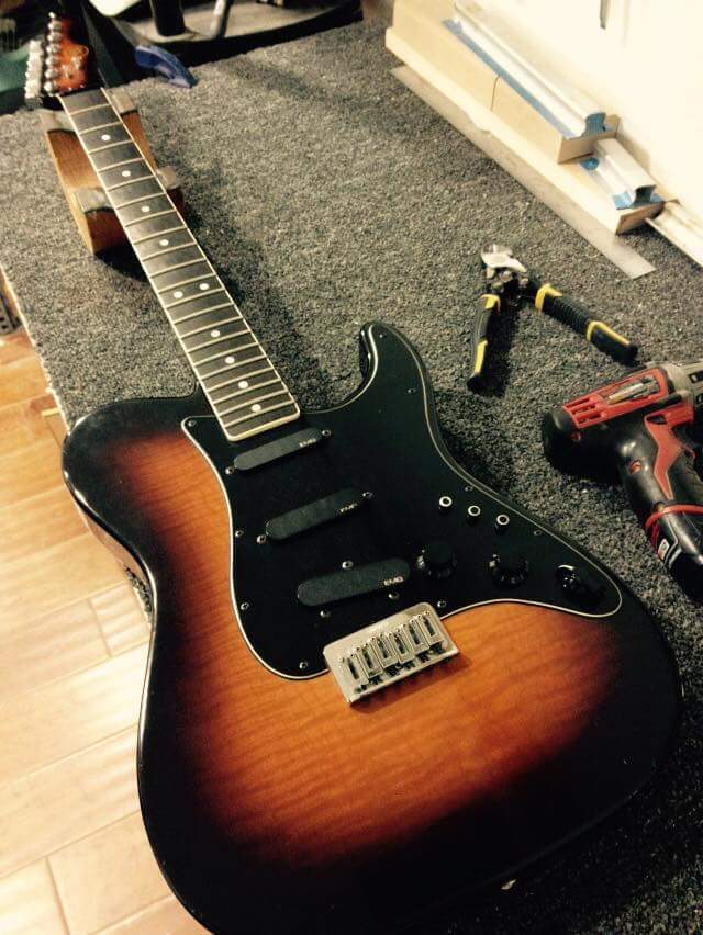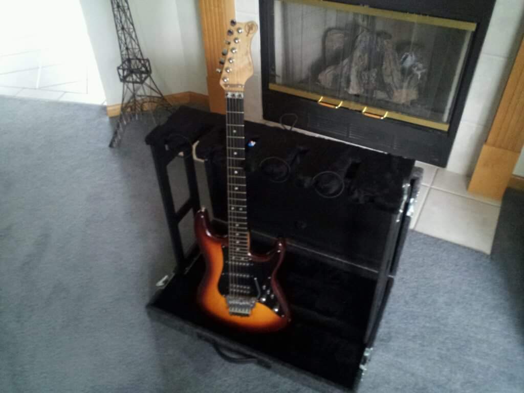 A true piece of craftsmanship made by VA employee Robert Kerr! Body is one piece, flamed maple, finished in Dark Tobacco Burst. Neck is also one piece Flamed Maple in Tobacco w/ a bound Ebony fingerboard. Mother Of Pearl Dot inlays w/ Jumbo frets make this a dream to play. Finished with Schaller Mini Tuners, an EMG Telecaster set of pickups w/ 3 button switching and chicken head tone knob. Bridge is a Dimarzio fixed Stratocaster style w individual saddles. The guitar is in overall excellent plus condition with no modifications or issues.