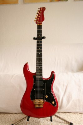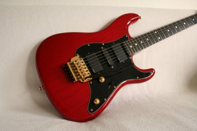 Feels and look like a one piece swamp ash 8/8 body, Trans Red, Maple neck, ebony fretboard with 22 frets, loaded with 85/SA/85 EMG pickups, Gotoh Floyd Rose Tremolo, gold Hardware, Everything in original and very good condition, Very versatile with it's H-S-H Setup, rocks like crazy!