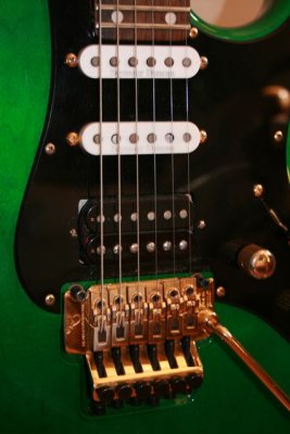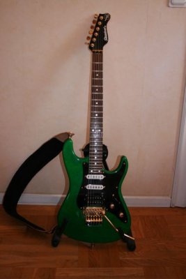 Mine is green transparent and has maple neck and rosewood fretboard, gold hardware, Kahler (Floyd Rose) tremolo, Kahler nut lock. Replaced the original EMG pickups with a Seymour Duncan JB Humbucker and two Seymoure Duncan STK-S1. I haven´t really used it on gigs since lately since I prefer my Fender Strat but it sounds better now when I replaced the pickups. It a wonderful instruments to play and it sounds great acoustic. A guy who then lived in LA brought the guitar over and I bought it from him. Exept from that guy I´m the only owner. He brought over two guitars, the other one was blue and a friend of mine bought it. He later sold it to a music shop in Värmland, Sweden 8-10 years ago. Would be great if it showed up here. Ii´m not sure about the serial number but it was pretty close to mine.