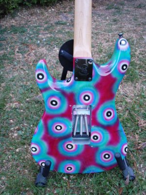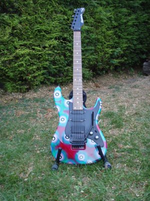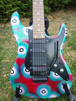 Standard Pro, 7/8 body, 24 fret, Custom paint job, EMG's, Kahler floyd trem, Black hardware. Plays nice but I'll probably swap the pick ups out. Someone added a tone pot and placed it incorrectly but it looks OK. .