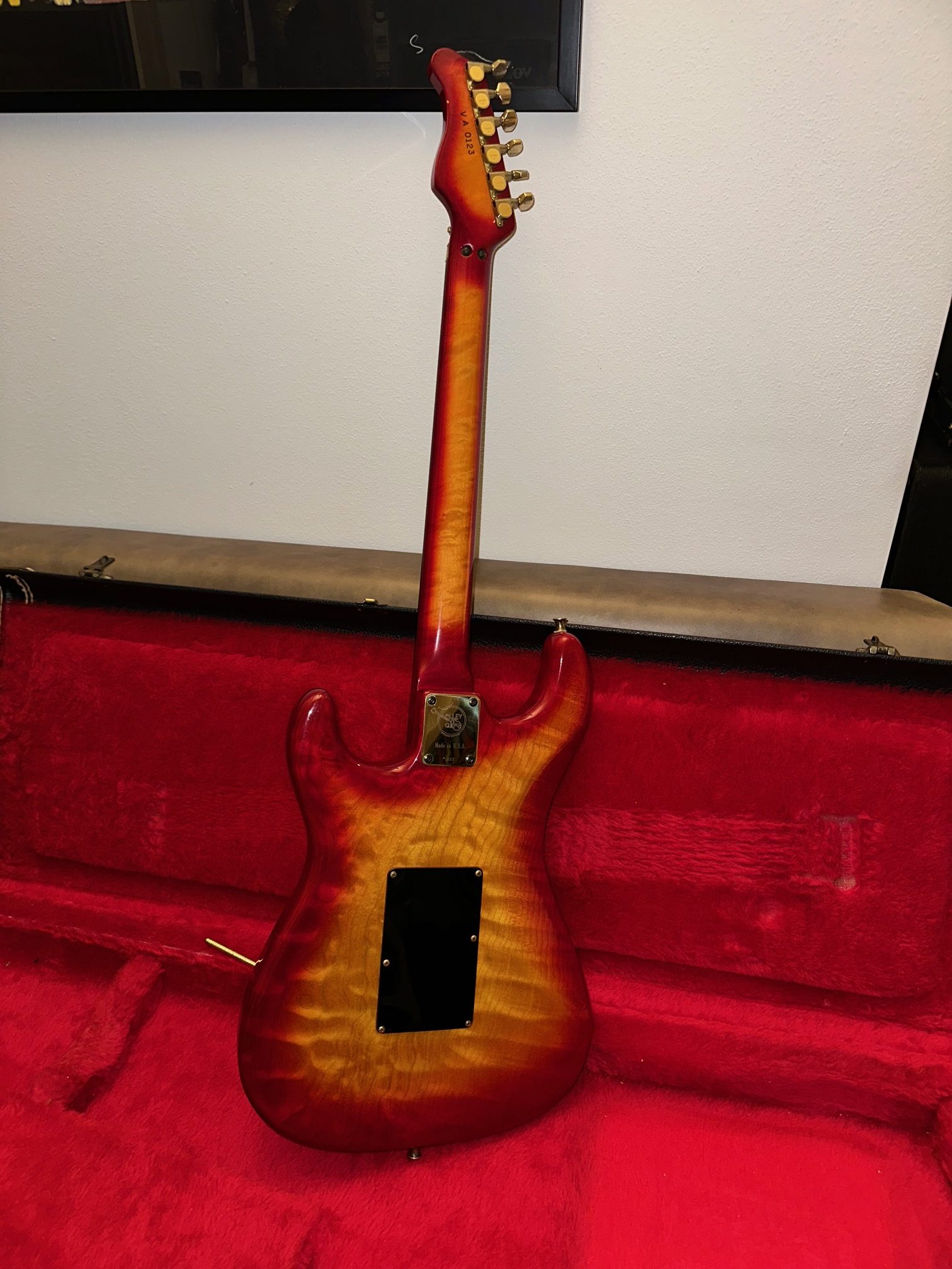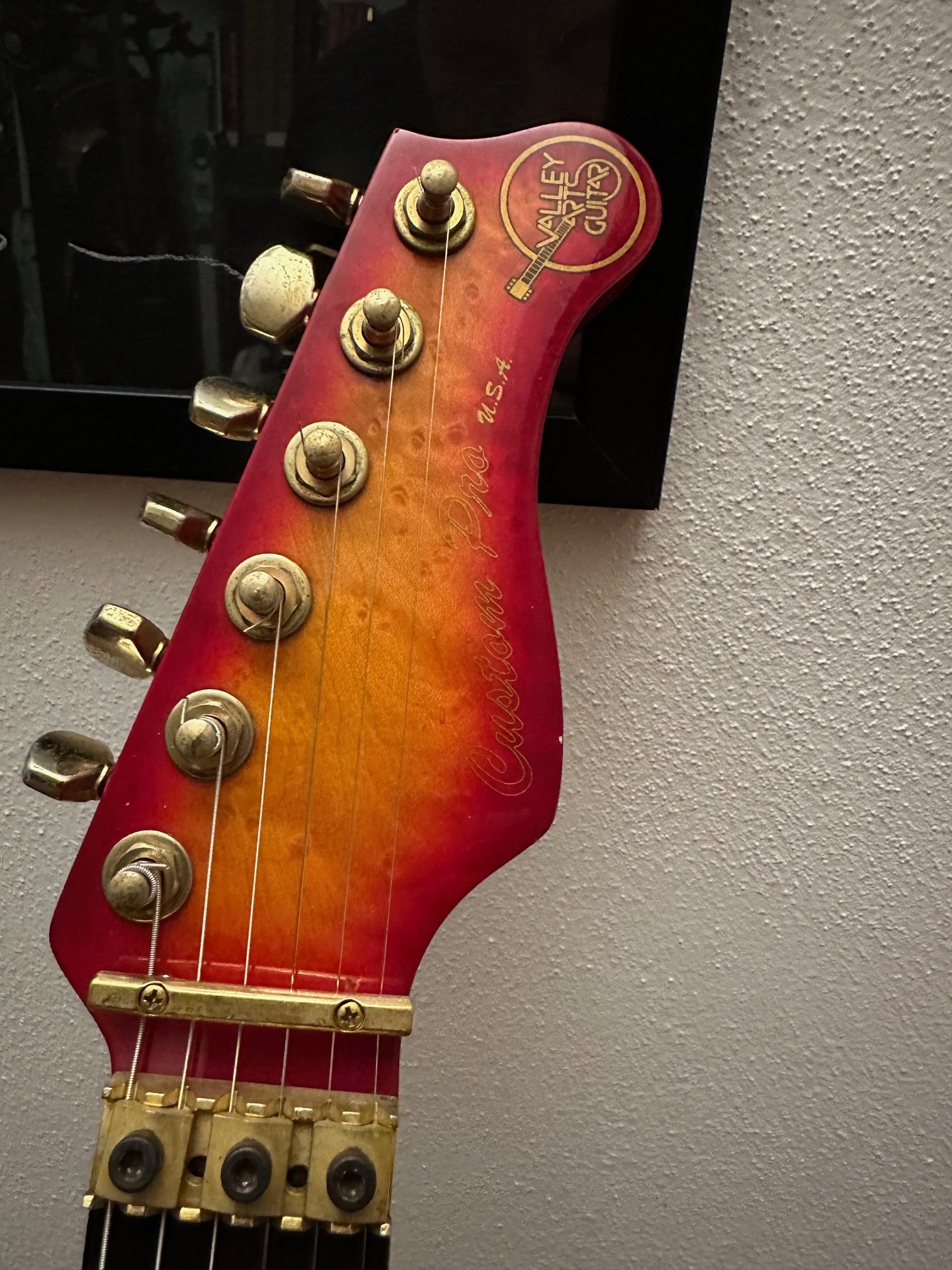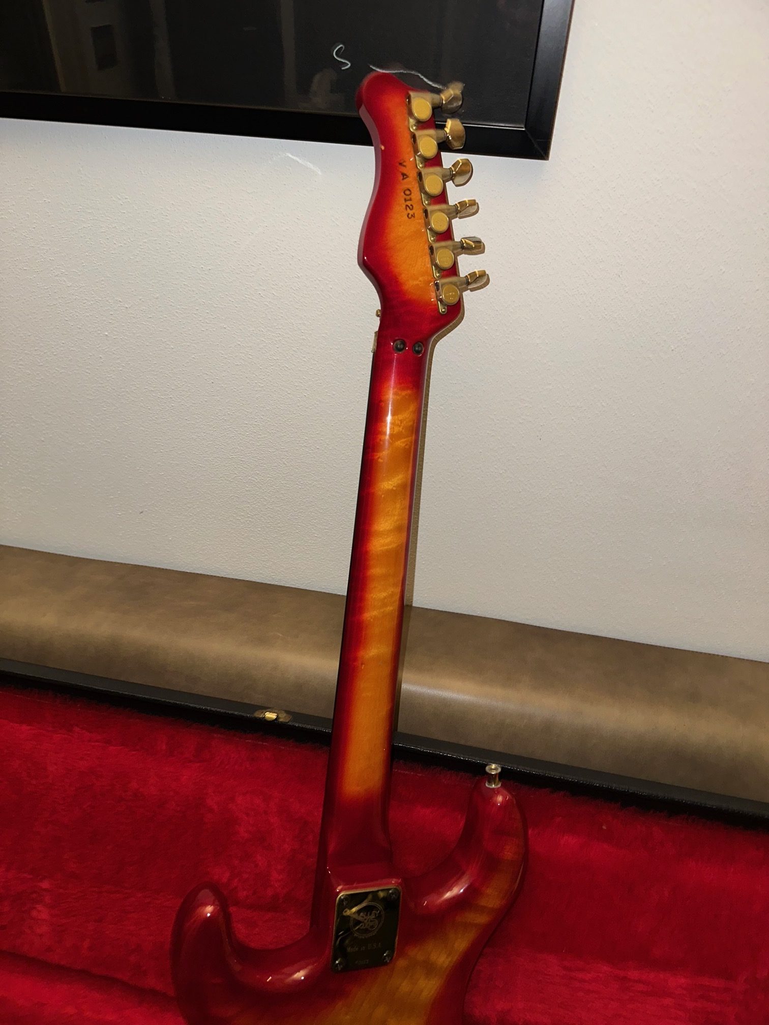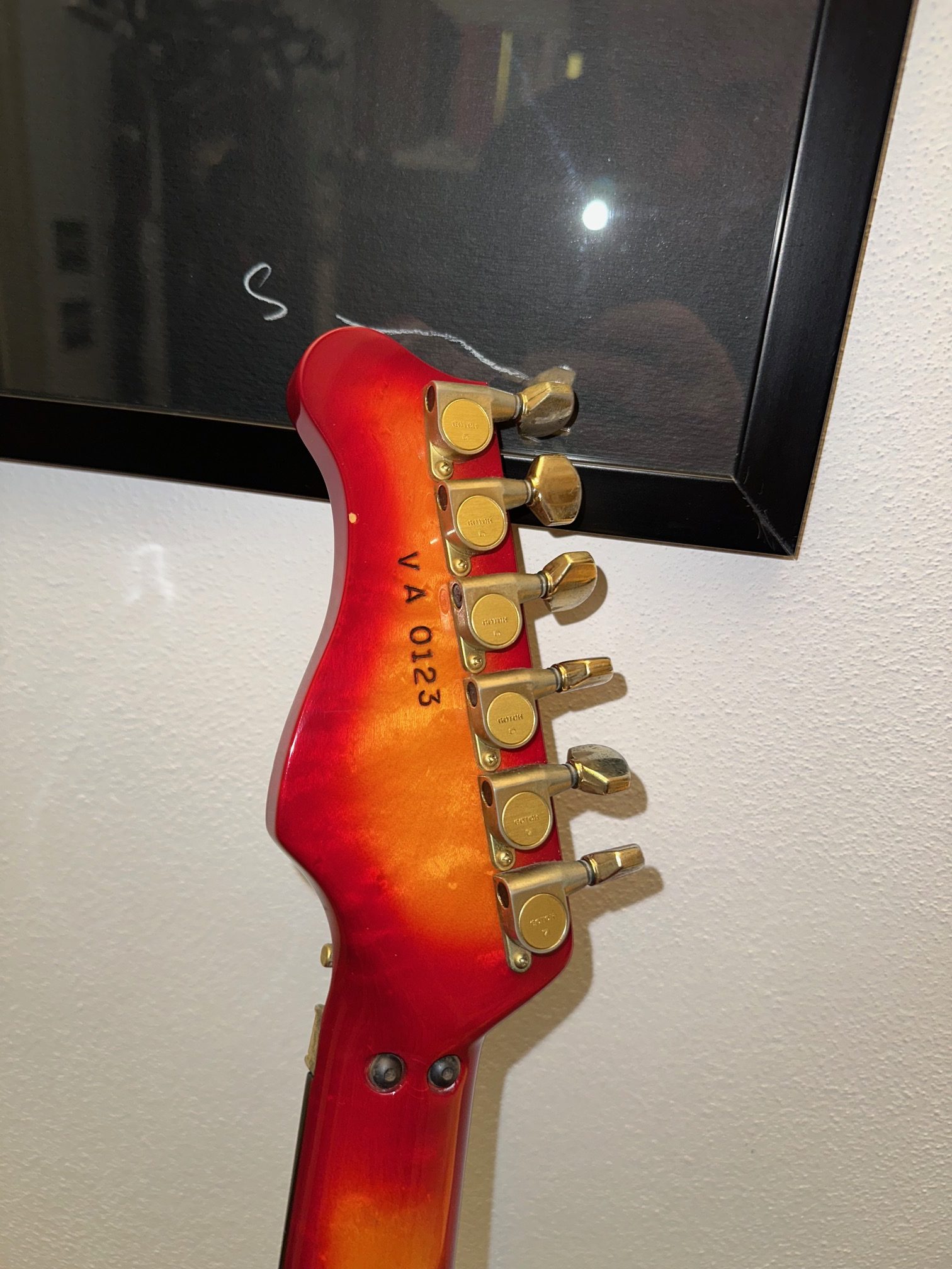 The Guitar is all original, and you can clearly see from the pictures, has the features of early valley arts. Is like the Steve Lukather one. Fireburst, quilted maple body, birdseye neck, gold parts, floyd rose not recessed, EMG 58 and I believe SA singles, single volume knob. I bought from a french guy named Arthur Vere, I don't know the provenance.