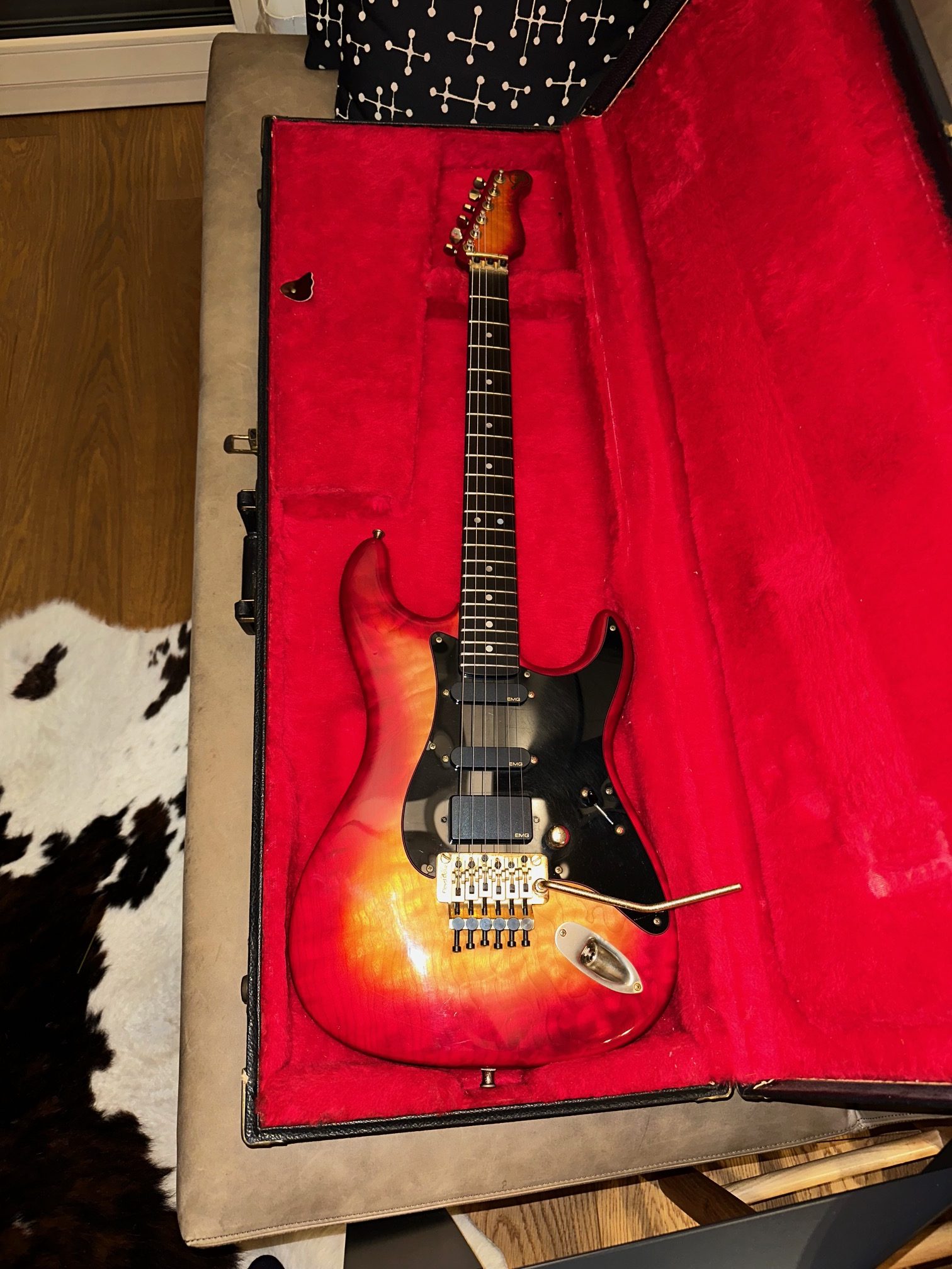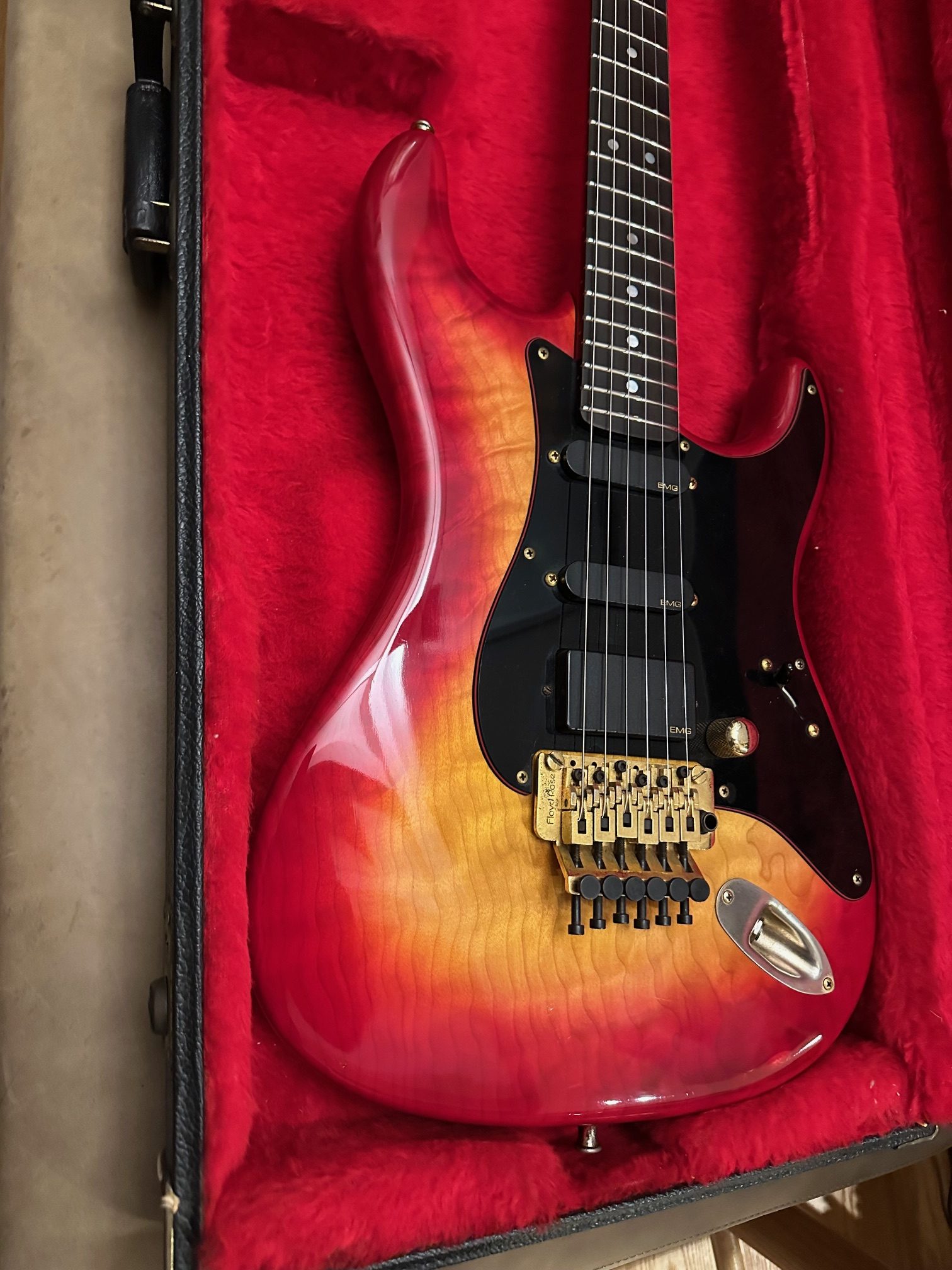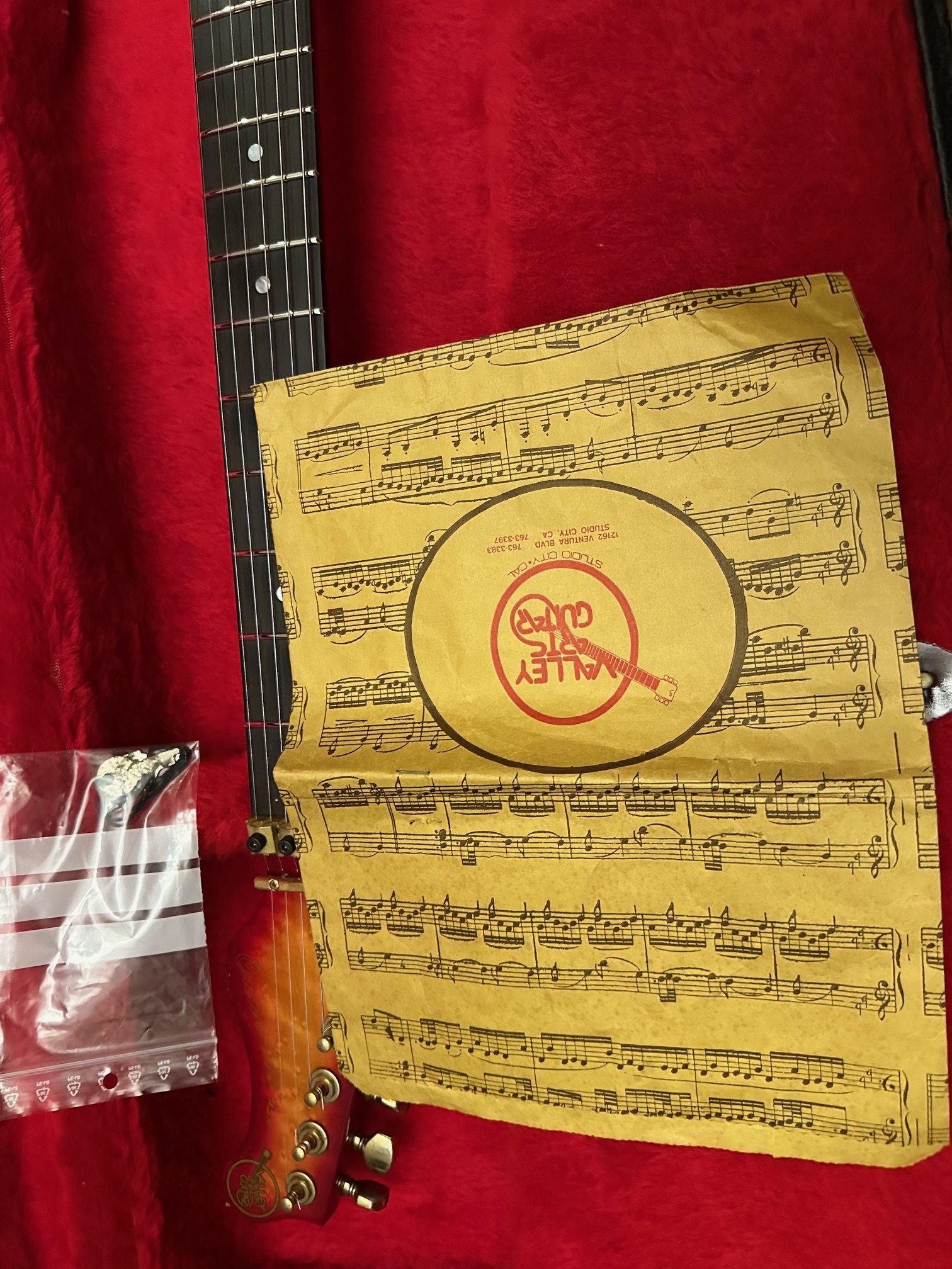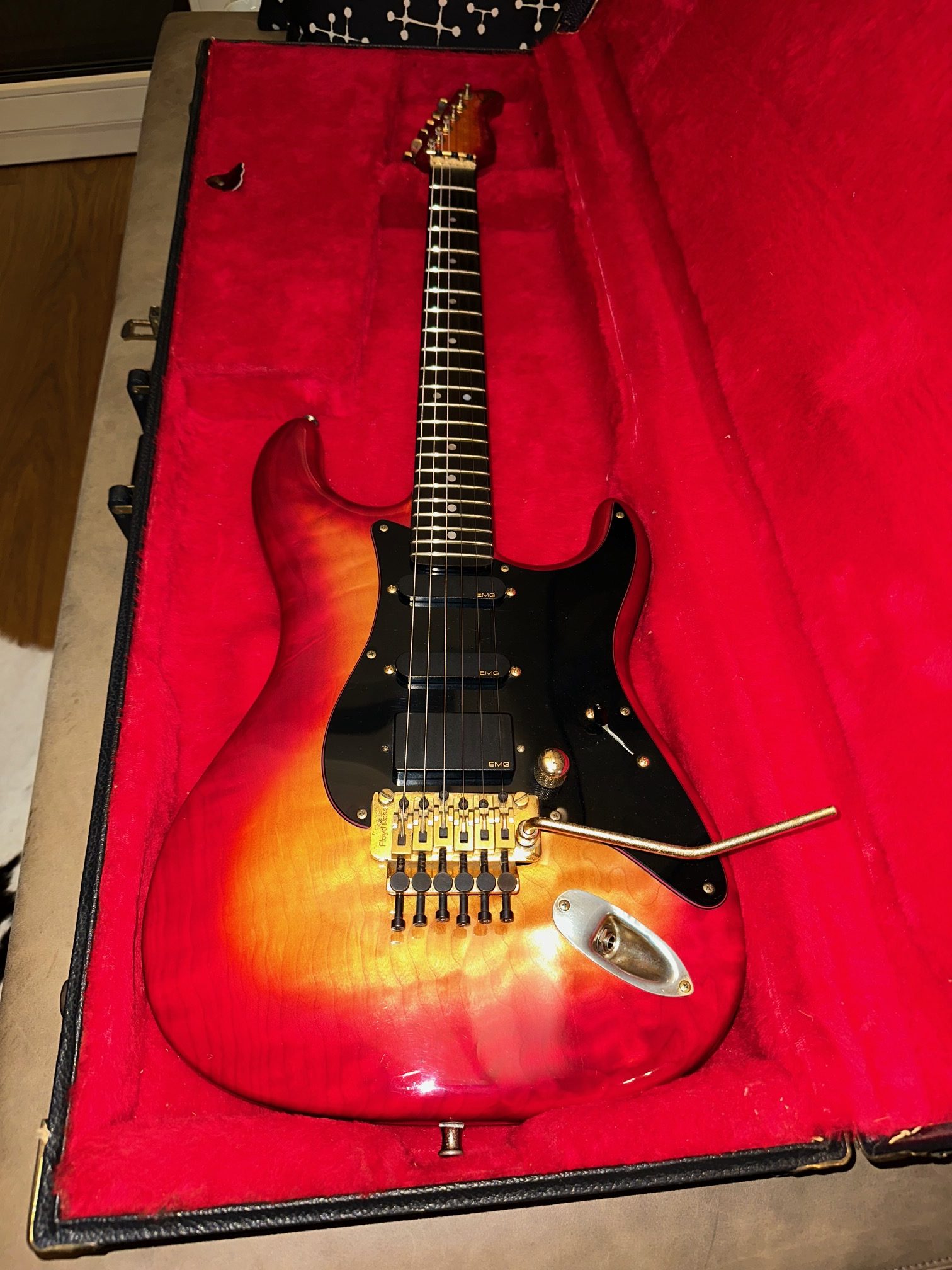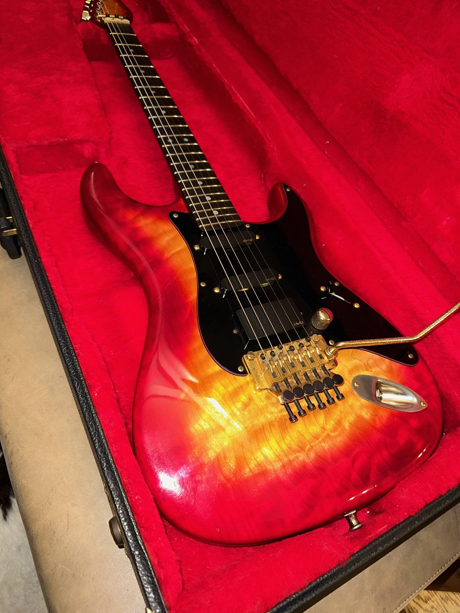 The Guitar is all original, and you can clearly see from the pictures, has the features of early valley arts. Is like the Steve Lukather one. Fireburst, quilted maple body, birdseye neck, gold parts, floyd rose not recessed, EMG 58 and I believe SA singles, single volume knob. I bought from a french guy named Arthur Vere, I don't know the provenance.