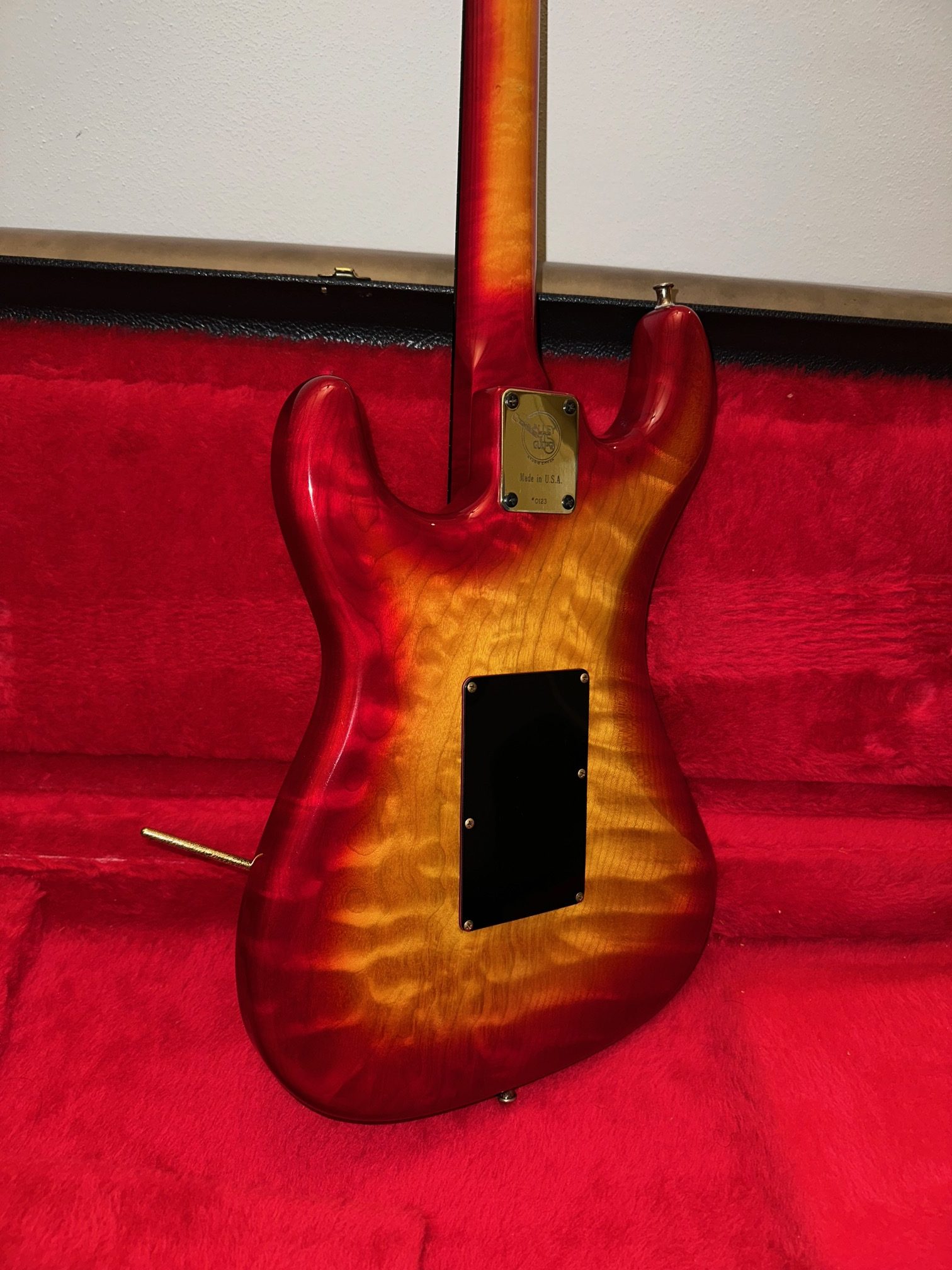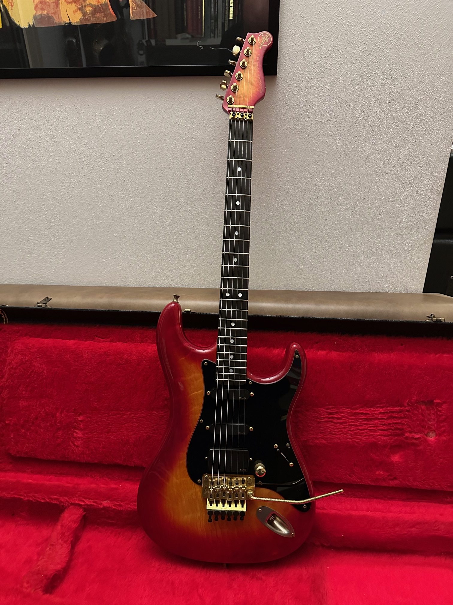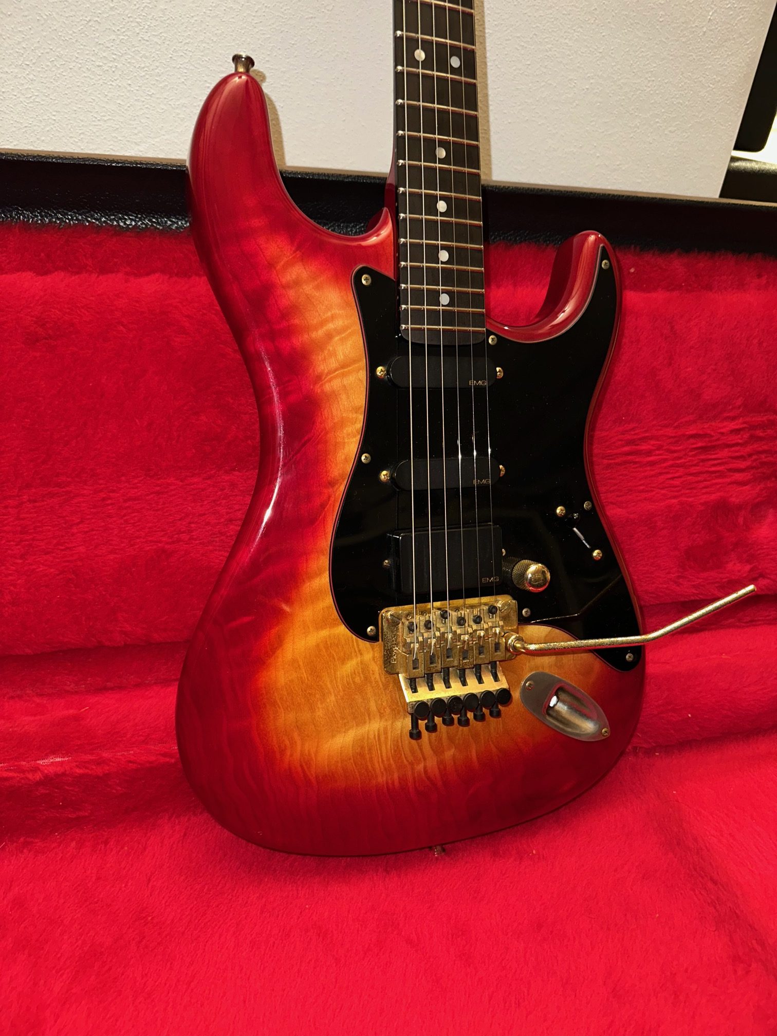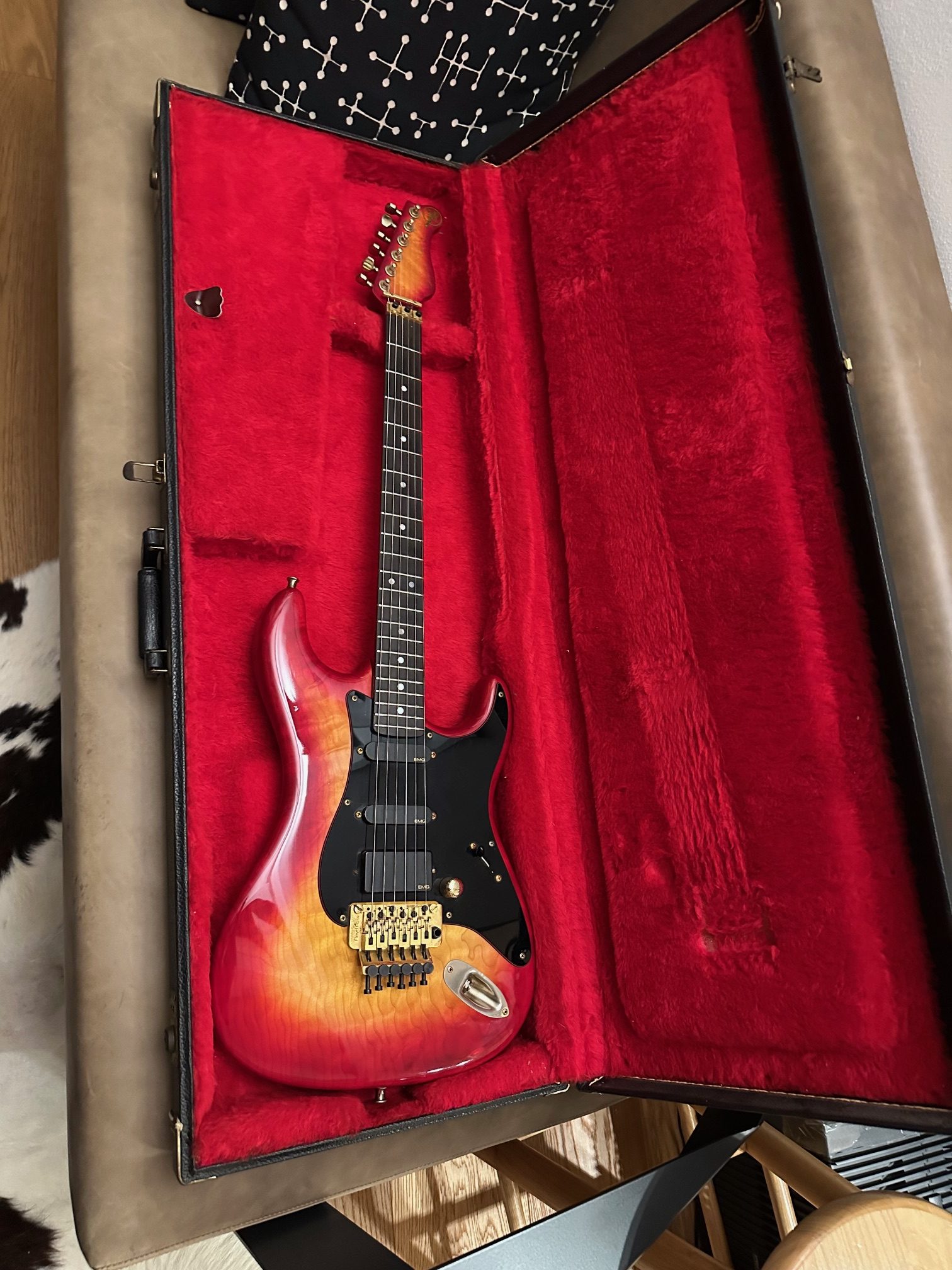 The Guitar is all original, and you can clearly see from the pictures, has the features of early valley arts. Is like the Steve Lukather one. Fireburst, quilted maple body, birdseye neck, gold parts, floyd rose not recessed, EMG 58 and I believe SA singles, single volume knob. I bought from a french guy named Arthur Vere, I don't know the provenance.