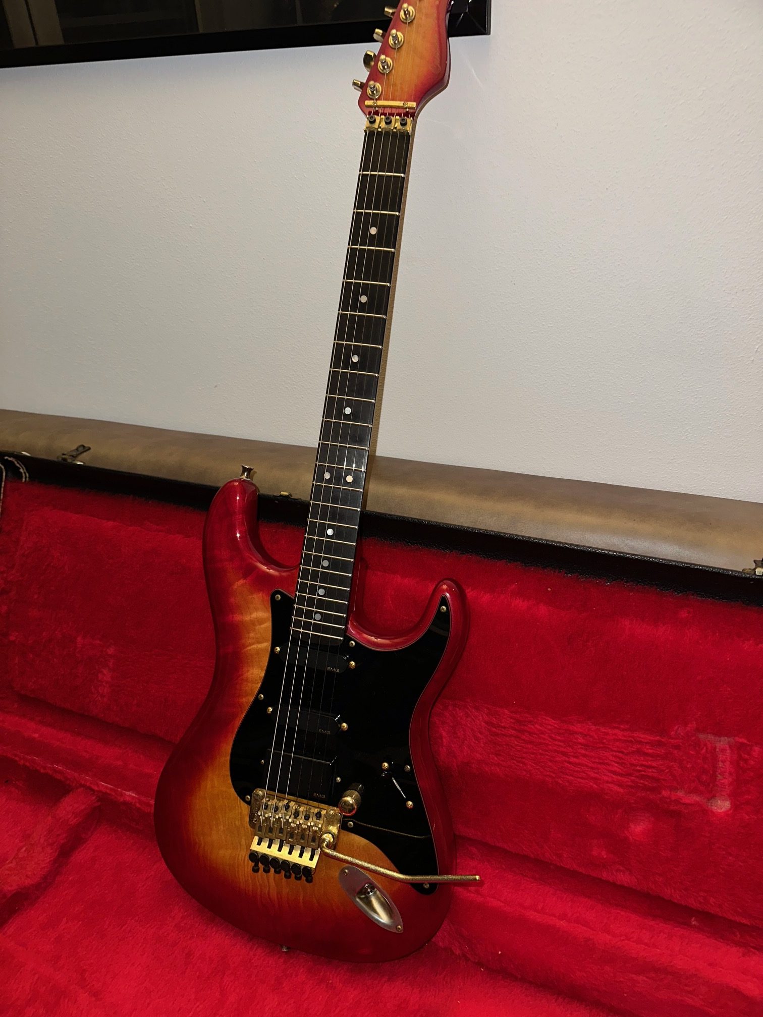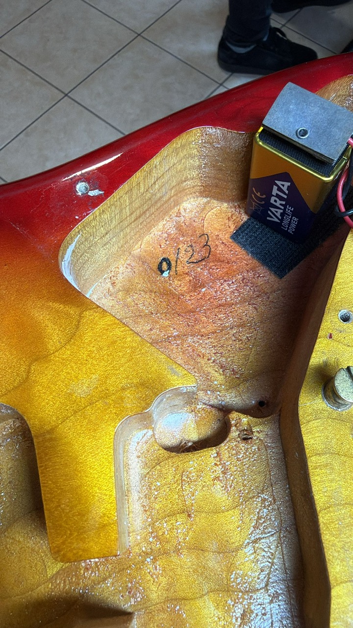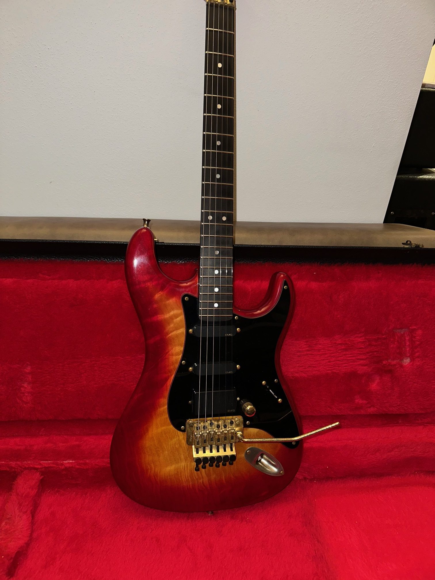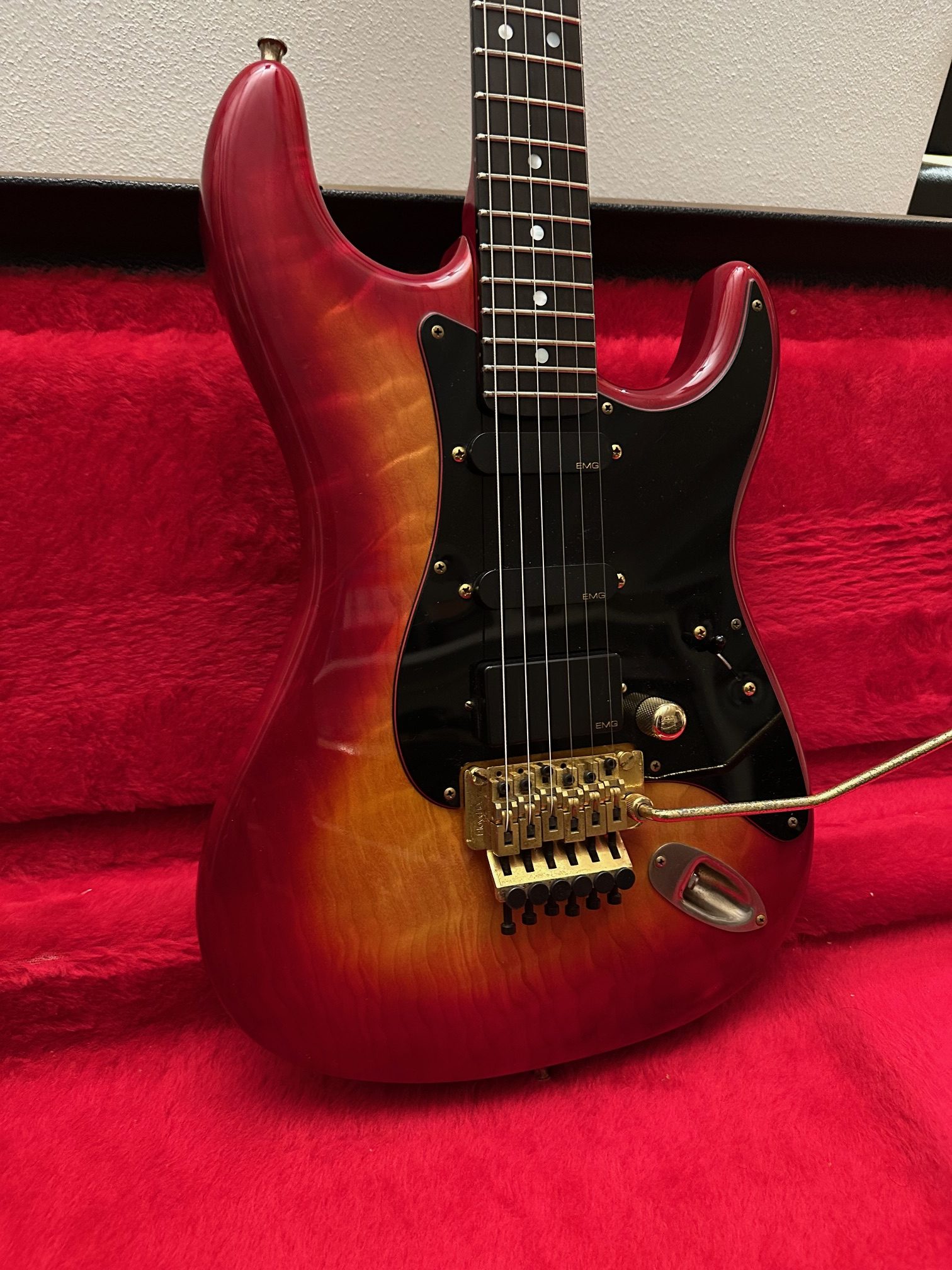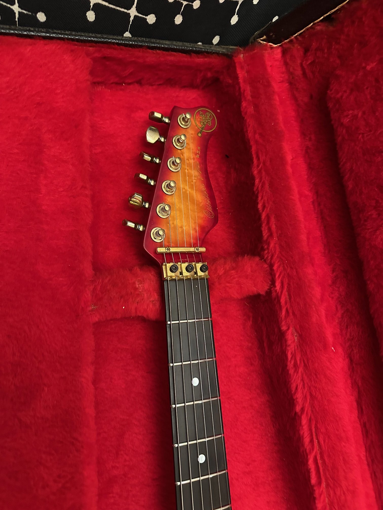 The Guitar is all original, and you can clearly see from the pictures, has the features of early valley arts. Is like the Steve Lukather one. Fireburst, quilted maple body, birdseye neck, gold parts, floyd rose not recessed, EMG 58 and I believe SA singles, single volume knob. I bought from a french guy named Arthur Vere, I don't know the provenance.