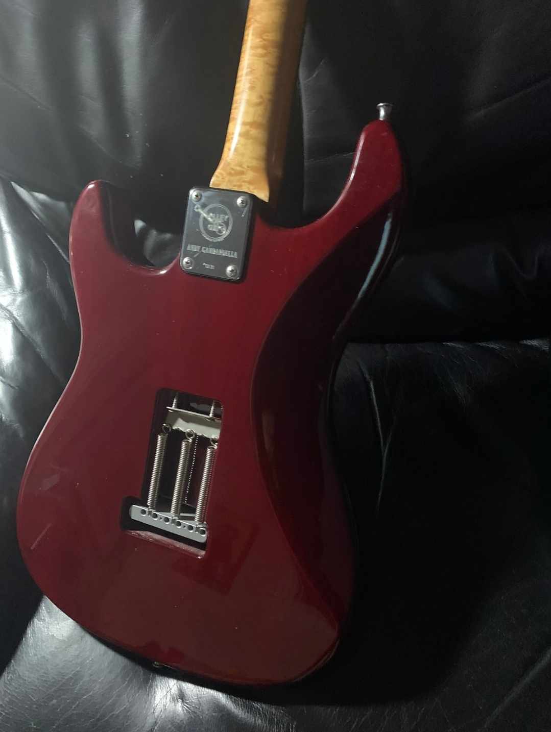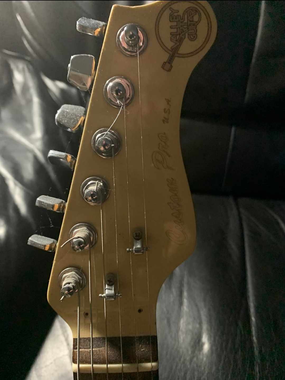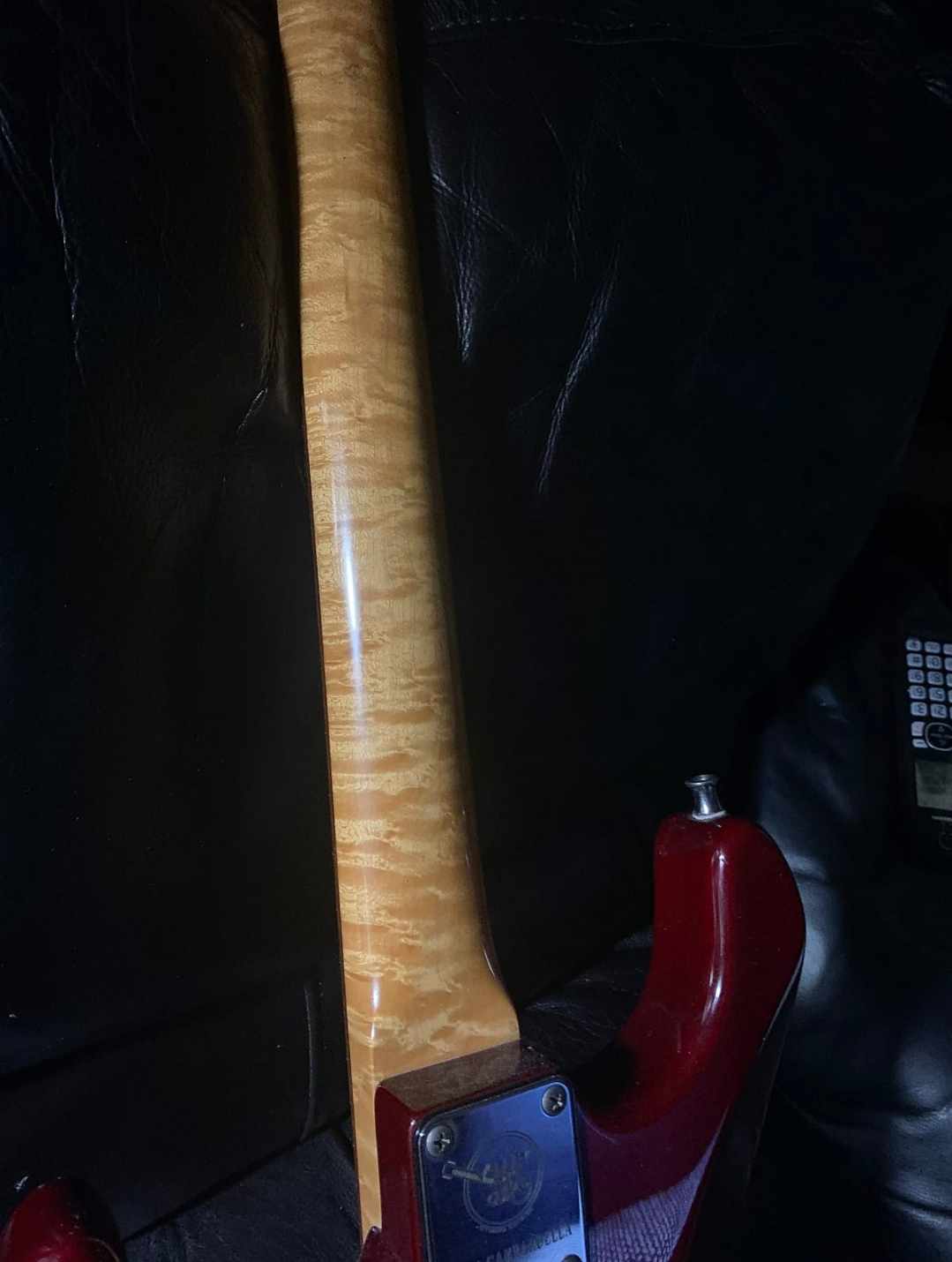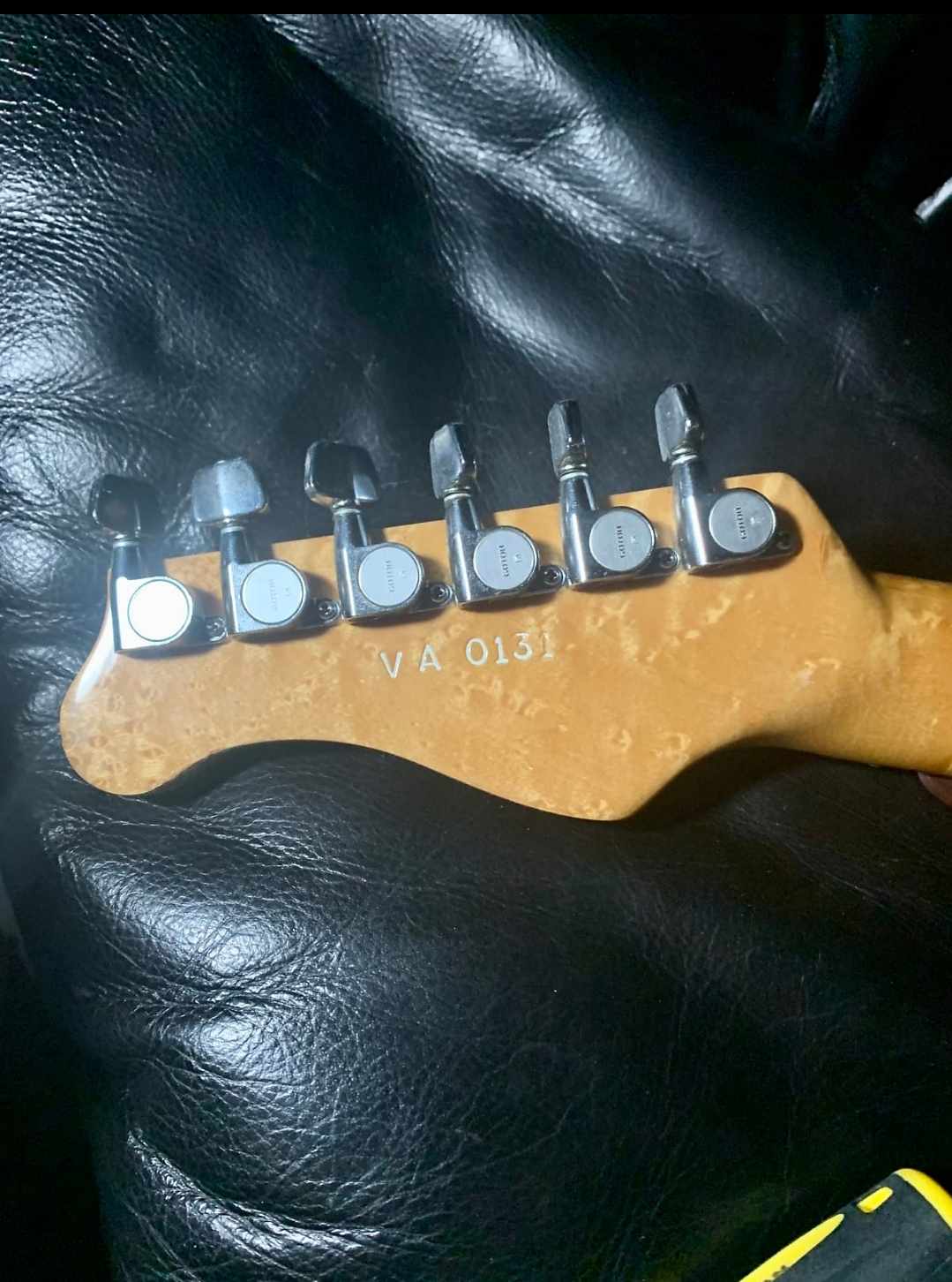 Stratocaster built by Mike McGuire for me. I am the original owner. Two small screw holes on face of headstock from a removed locking nut.