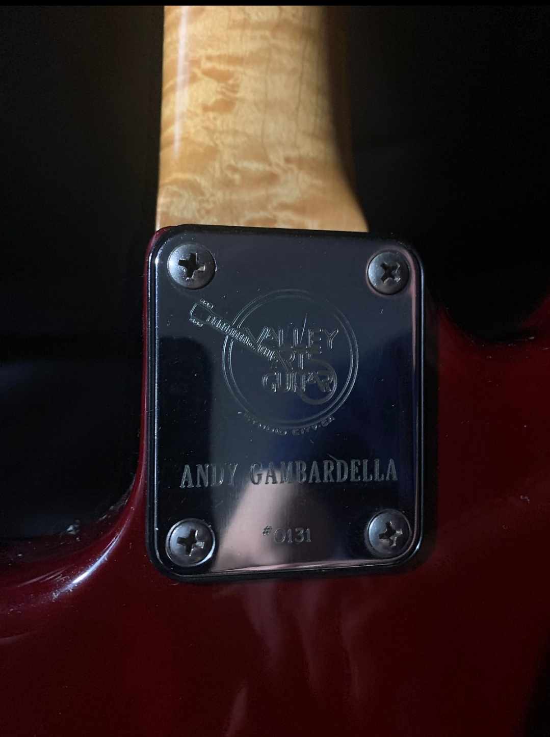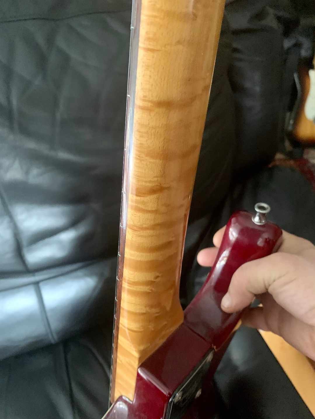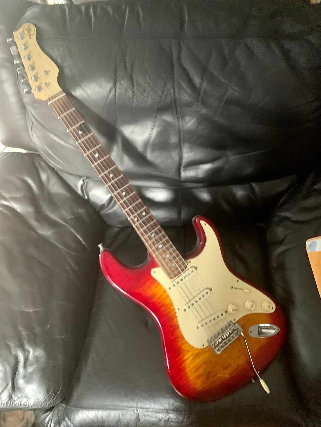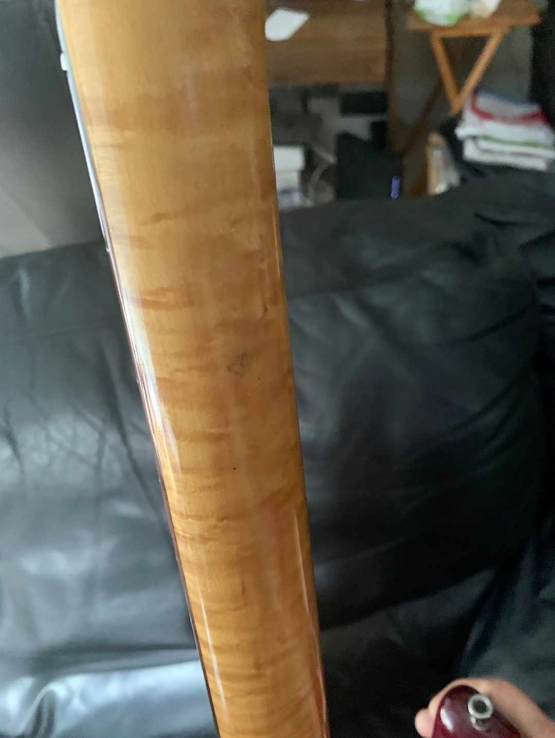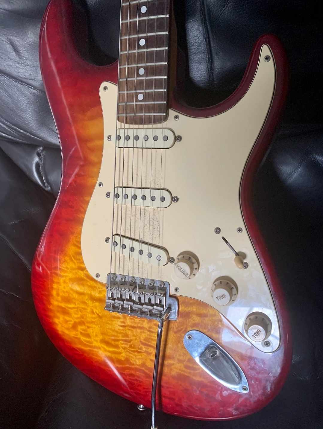 Stratocaster built by Mike McGuire for me. I am the original owner. Two small screw holes on face of headstock from a removed locking nut.