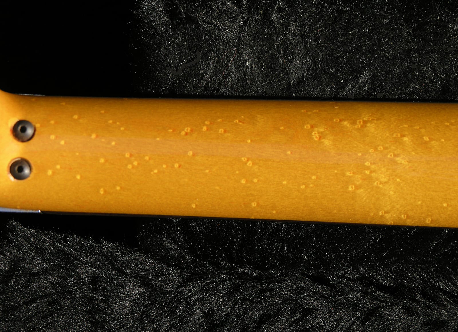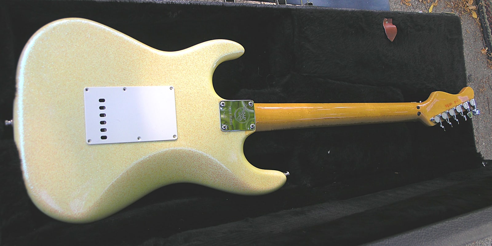 The body is smaller than a standard Stratocaster but the neck, pickguard and 25.5” scale length are all standard. The many coats of lemon ivory metal flake lacquer paint job is in decent shape and very “50s Hot Rod”, beautiful to behold as, it catches the light in a fantastic glow! The neck is also done in an amazing Birdseye Maple.