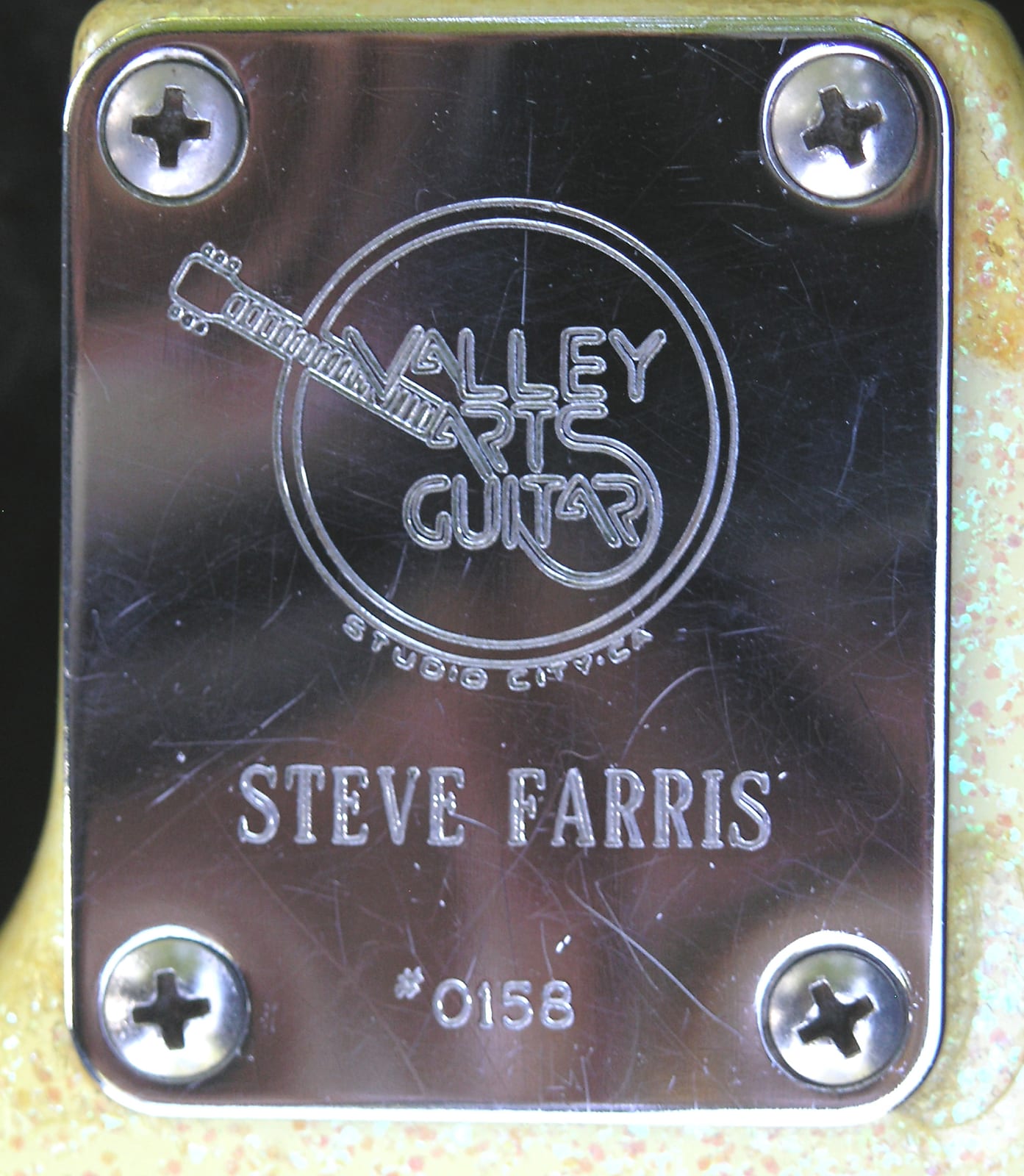 This is a one off, custom crafted early Valley Arts Guitar. It was custom made for guitarist, Steve Farris, from the Grammy winning combo Mr. Mister and bears his nameplate (see pix). It’s got # 0158 etched on the name plate and stamped on the back of the headstock.