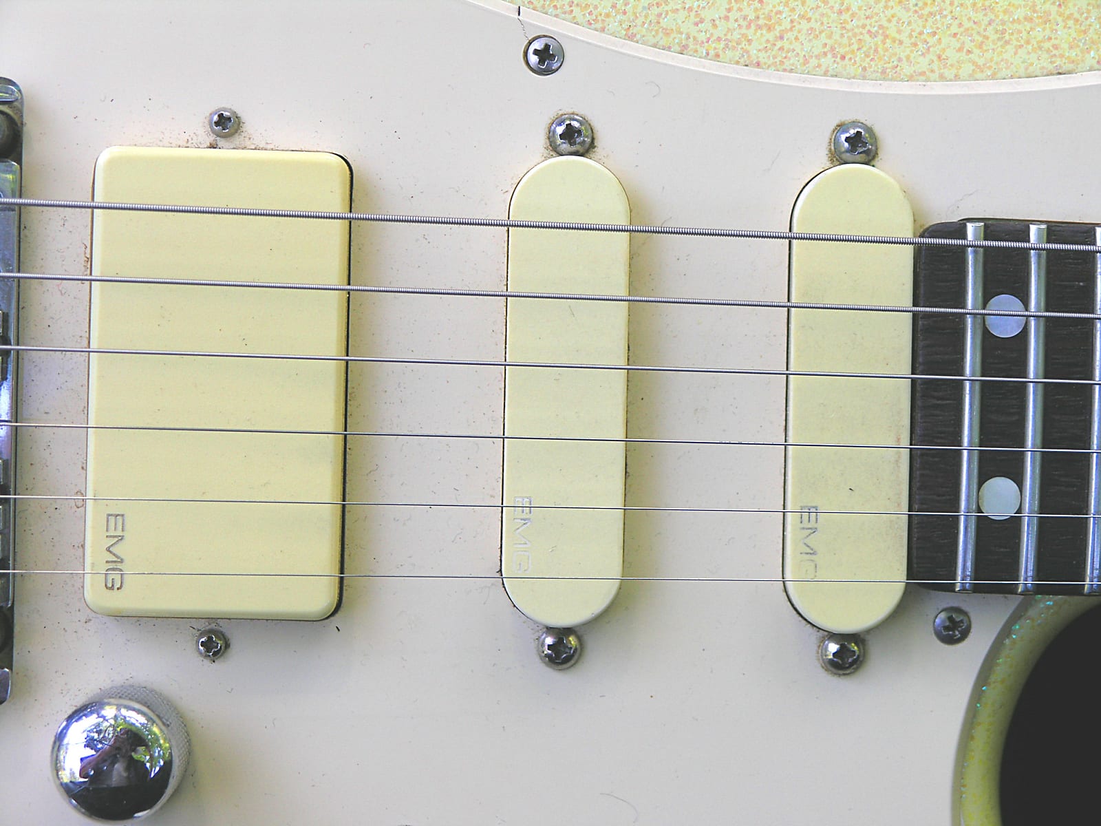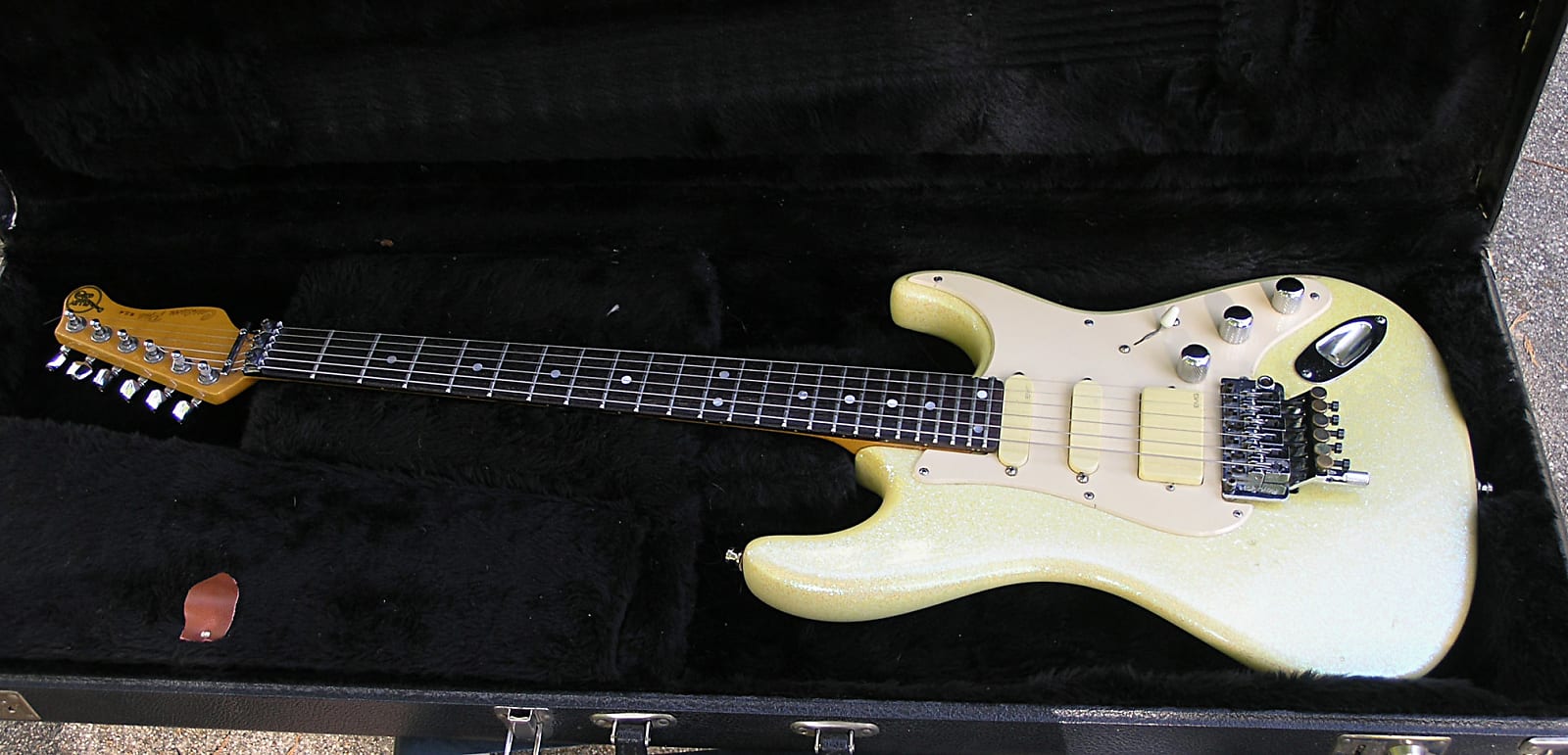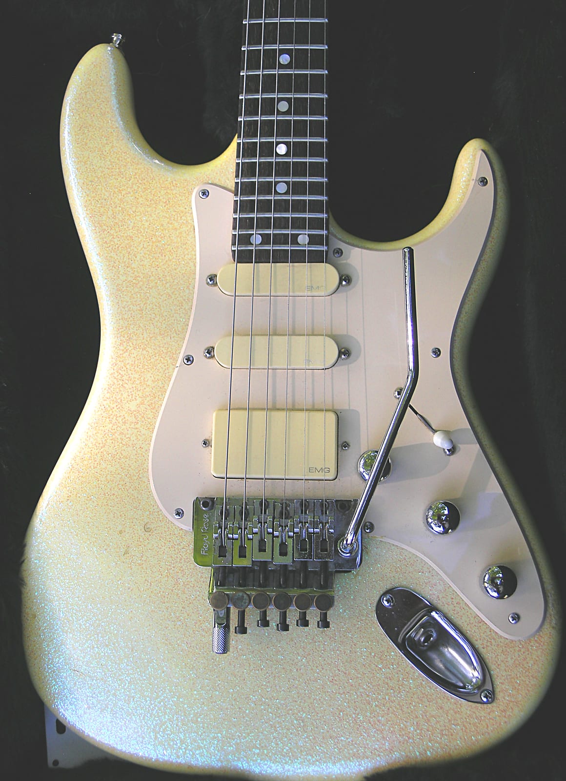 It was hand crafted at the original North Hollywood Shop. It’s a total touring guitar with all active EMG electronics (one Humbucker, 2 Single Coils and two EMG tone shaping knobs). The 9v battery sits inside the pickguard as its maintenance was handled by a road tech.