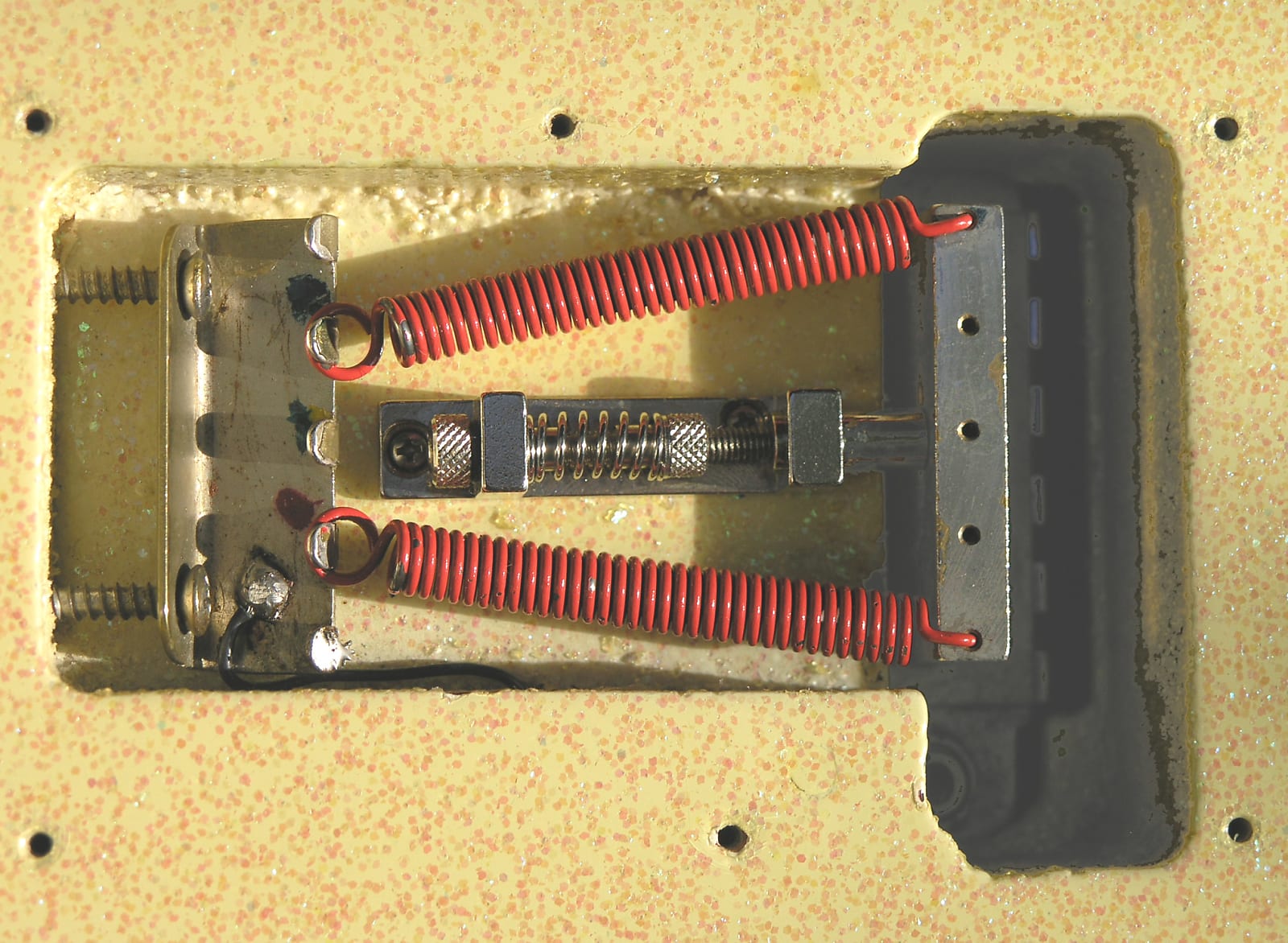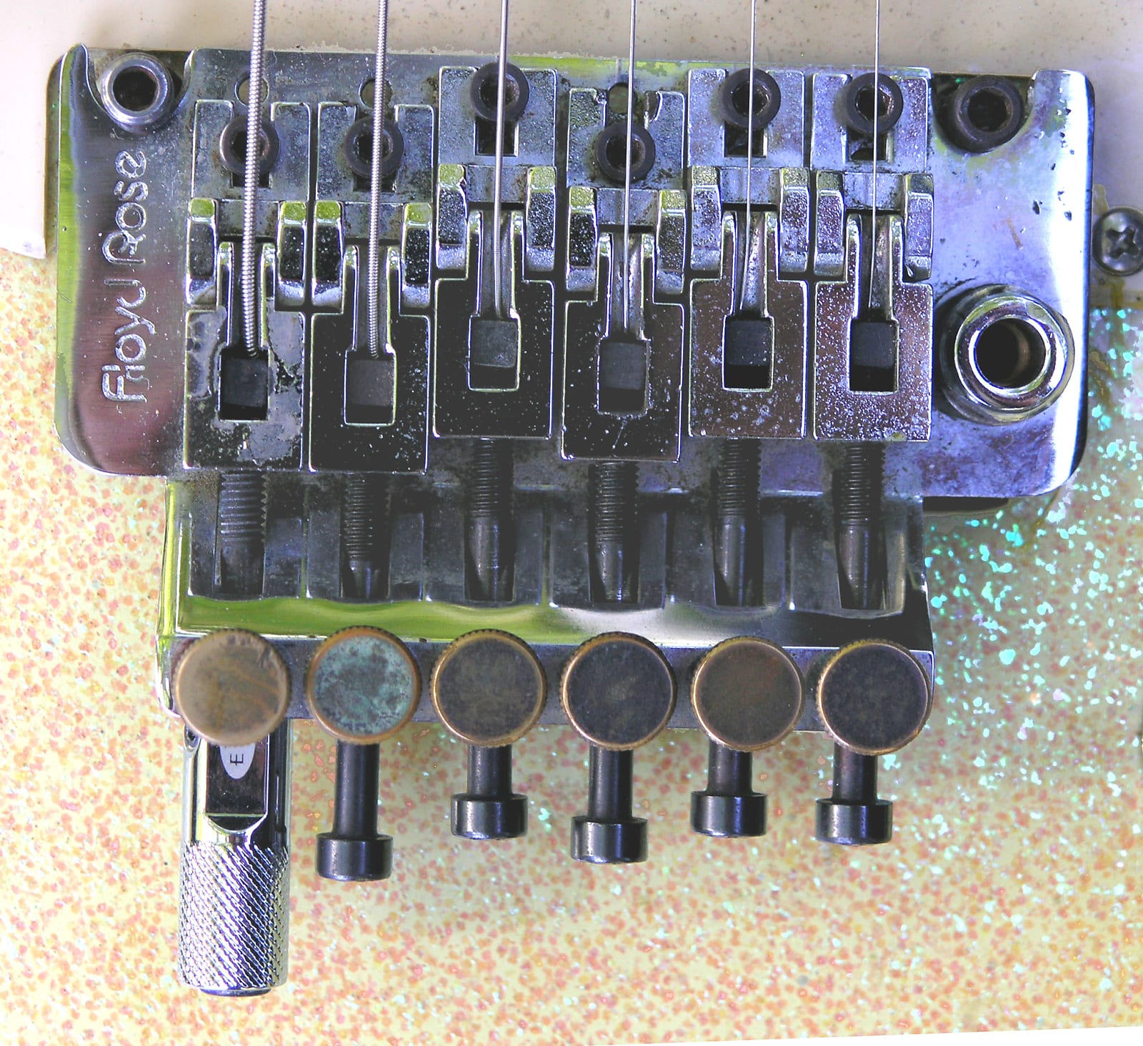 It has its original early Floyd Rose Tremolo that operates perfectly. It was upgraded with a cool trem-stop and special Floyd Rose springs. It also has an Eddie Van Halen Fender Drop-D installed.