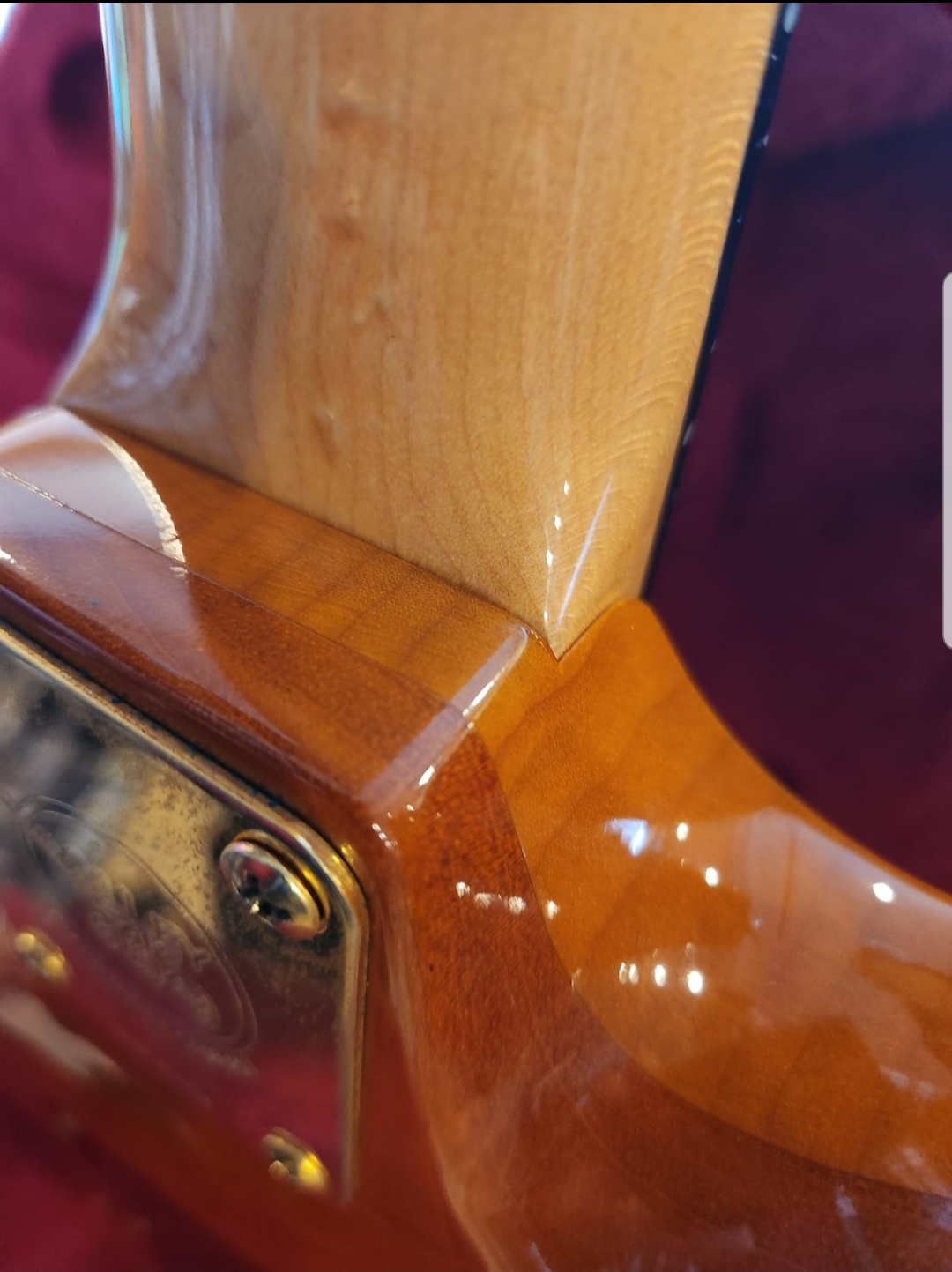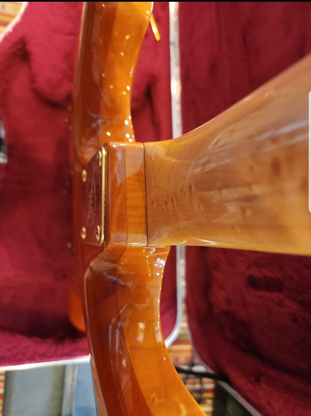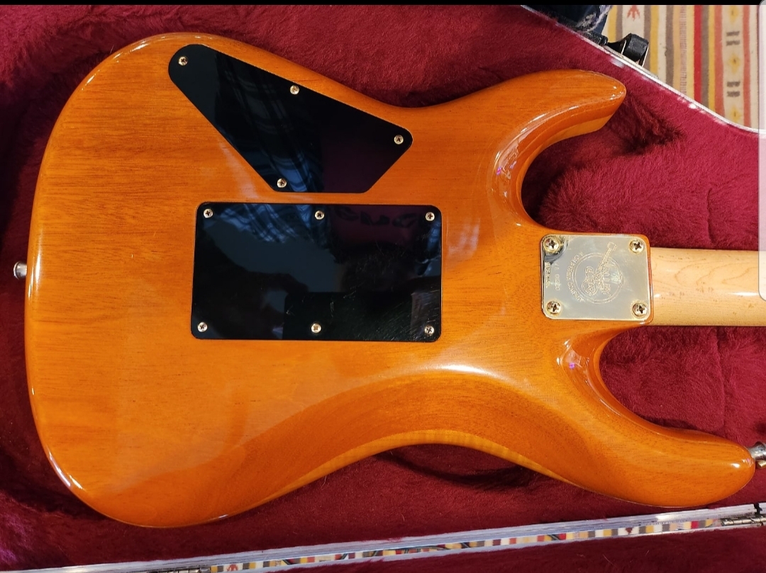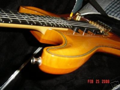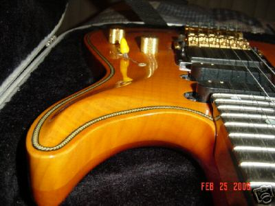 THE BODY - 3/4 inch Flame Maple CARVED Top w/ HERRINGBONE Inlay. Tremolo, Jackplate, Knob and Toggle cavity's are all recessed. Truly one of a kind with the highest degree of workmanship. Finished in Amber which compliments the highly figured flame top. One a scale of 1 to 10, It's an 11. Truly stunning. Beautiful slab of Mahagony on rear completes the package. The neck joints have NO finish cracks or distress of any kind and the body has no dings, dents or dissapointments.