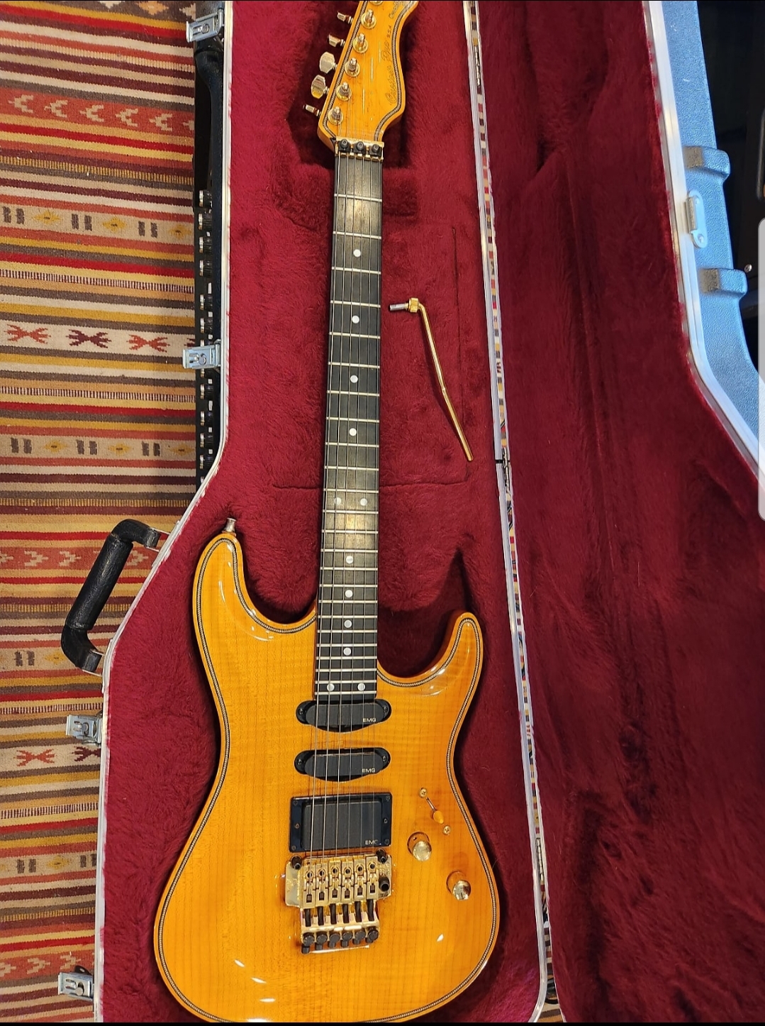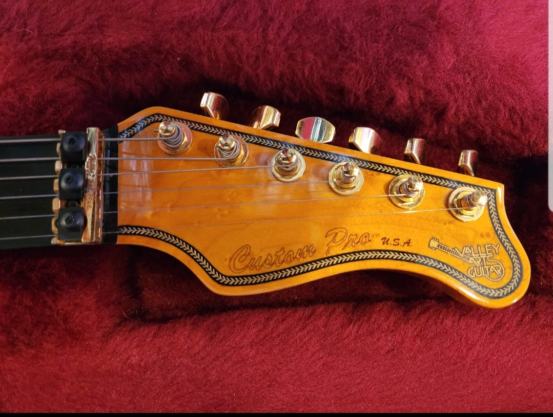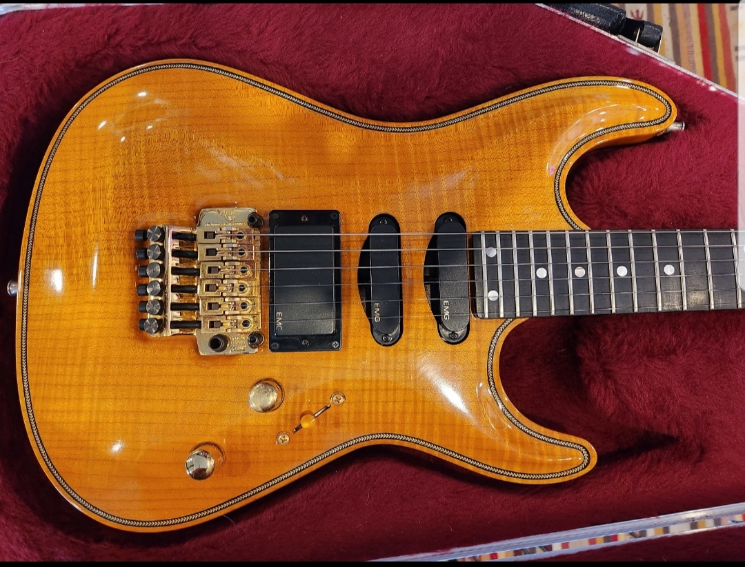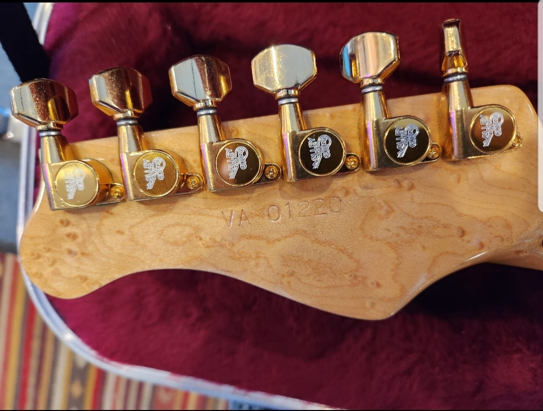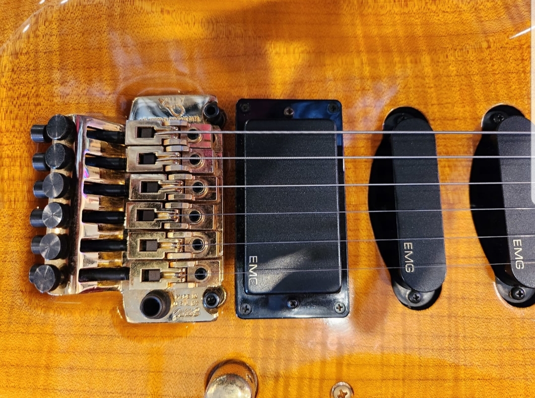 THE HARDWARE - Vally Arts liscensed Kahler Tremolo. Floyd Rose style. Pickups are 2 EMG SA Singles and an EMG 85 Humbucker. 1 Volume, 1 Tone with a 5 way blade style toggle for all the tones. All hardware on this is Gold with little to no signs of wear.