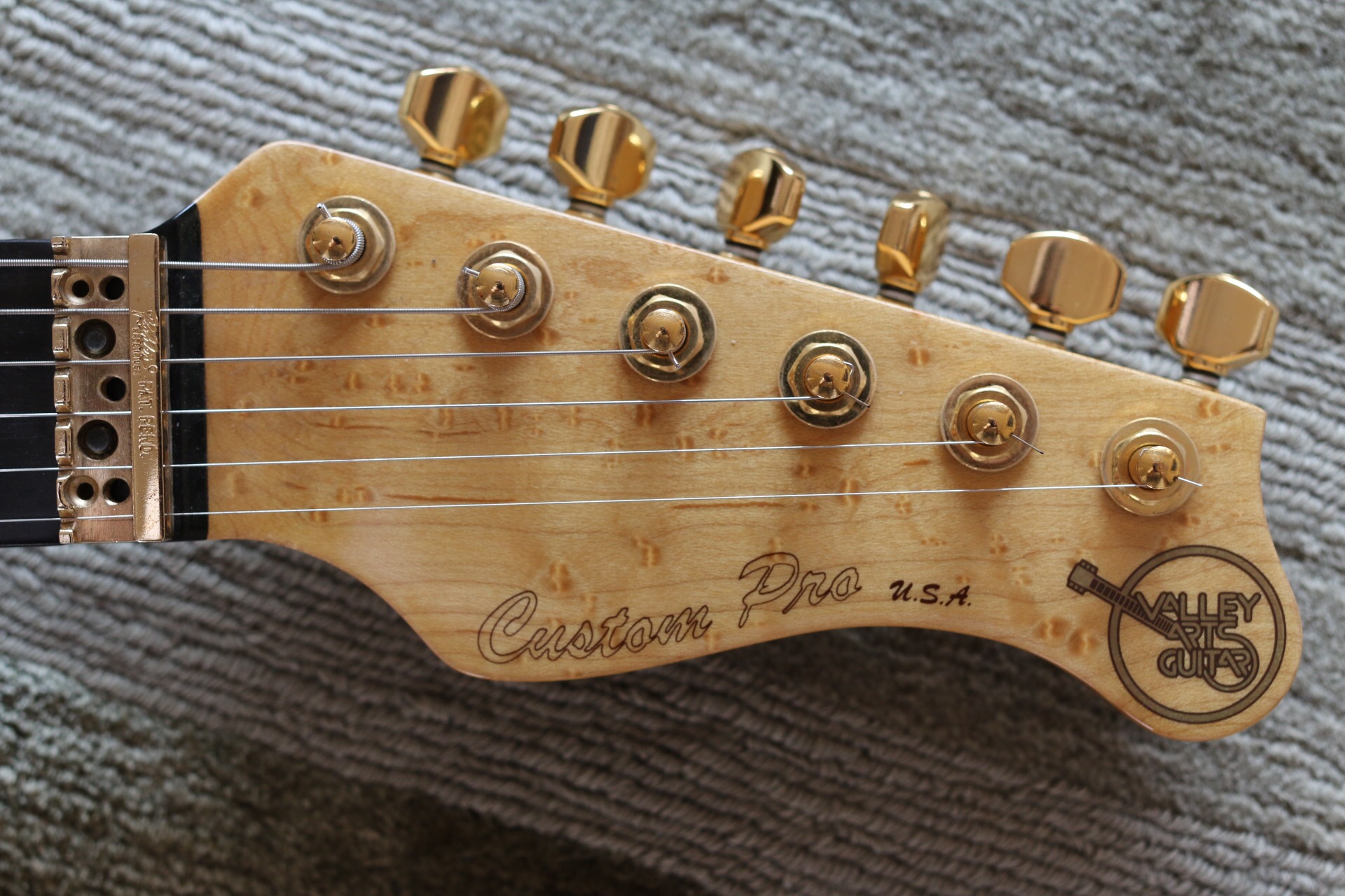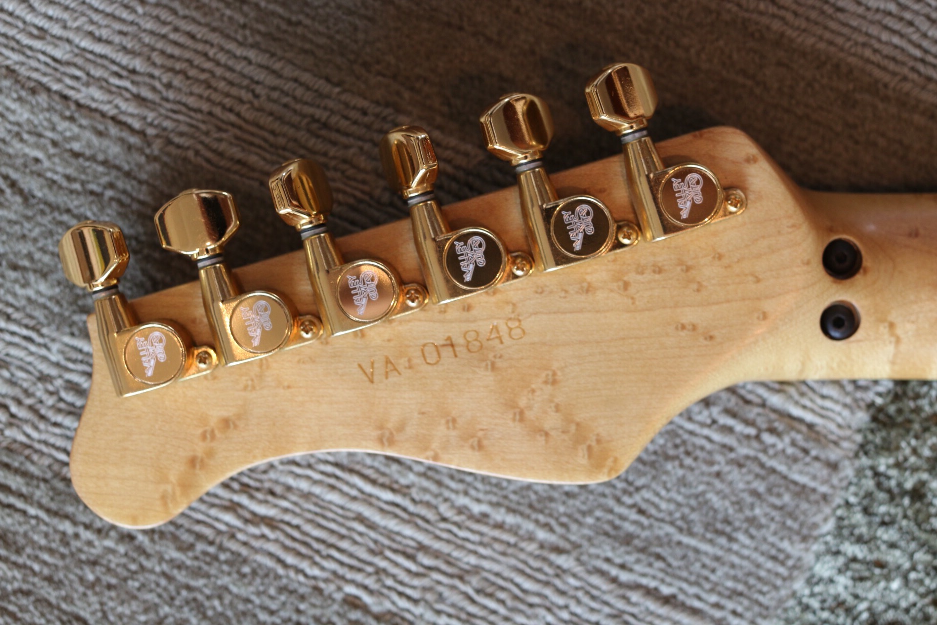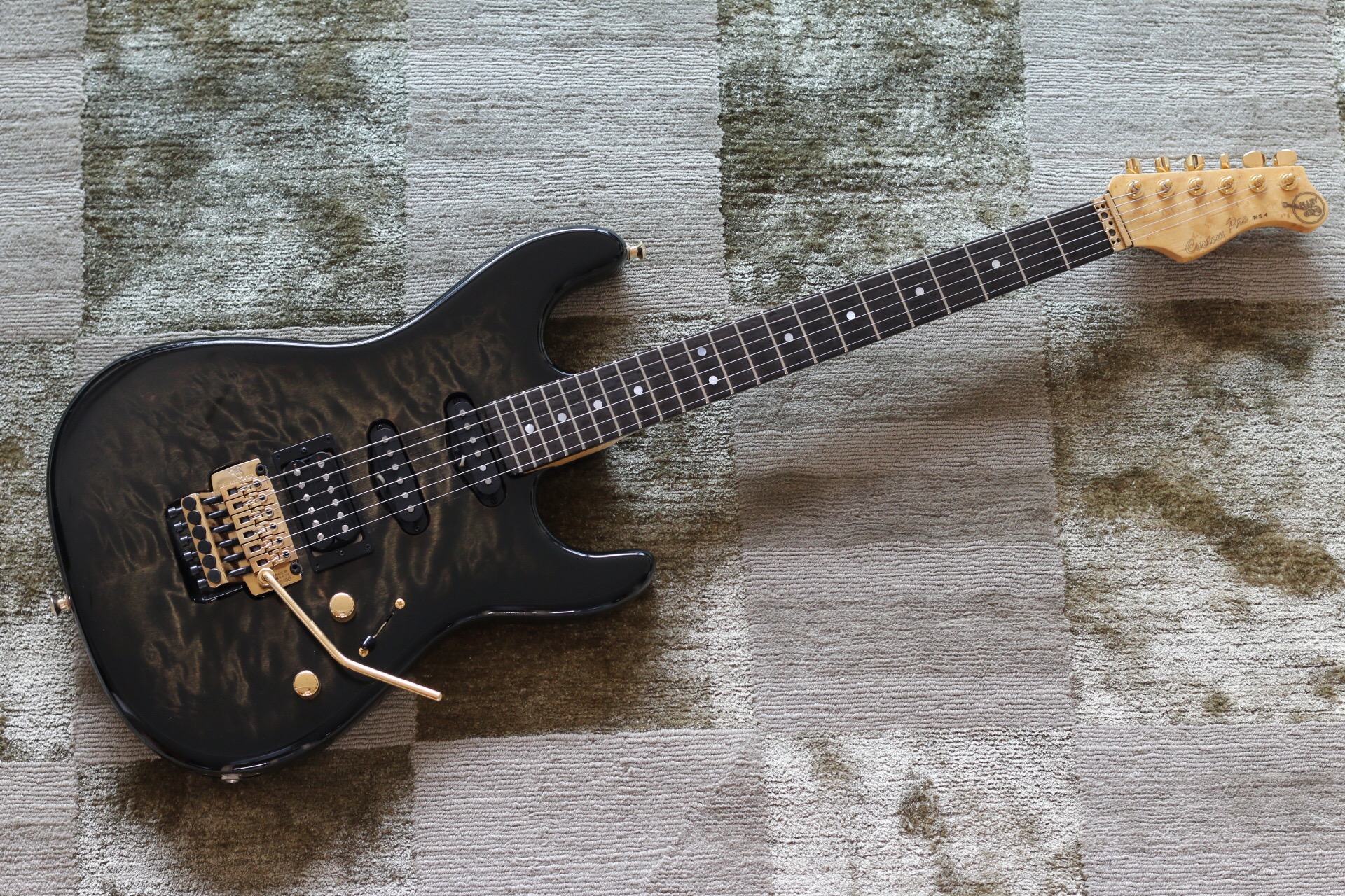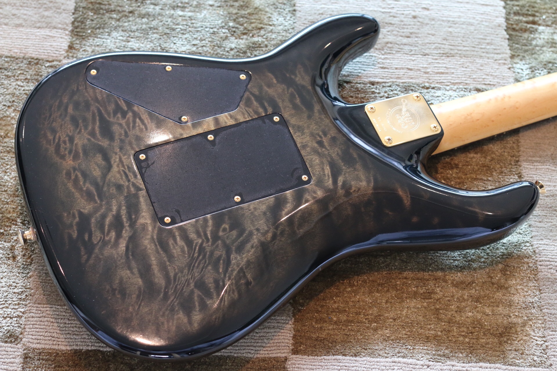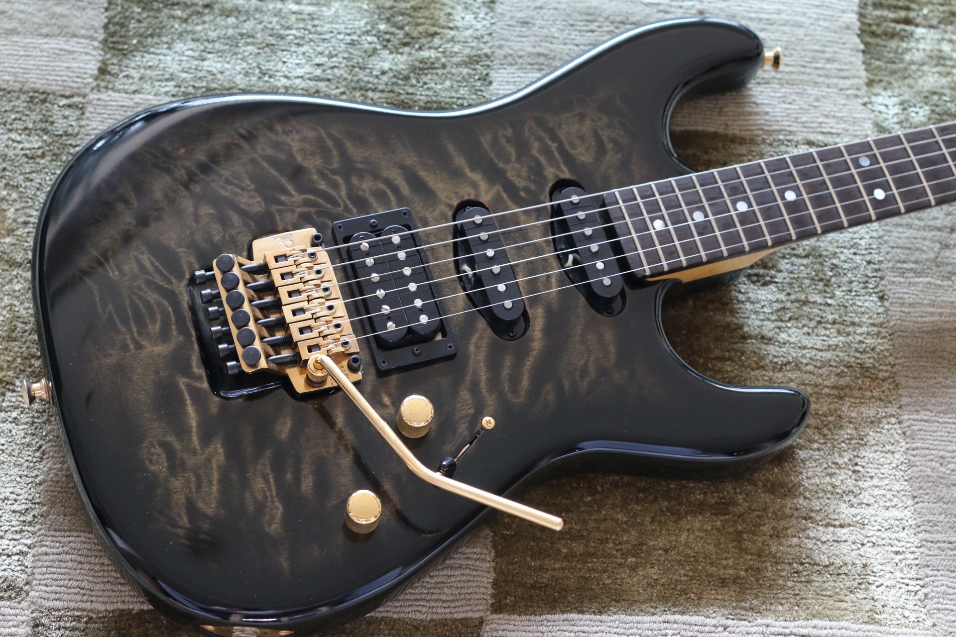 Body: 2-piece solid quilted maple. Neck: birdseye maple. Fingerboard: ebony. Pickups: Seymour Duncans. Finish: Brown Leopard Stripe. All Original. Was a display model at Perfect Pitch Music Co. (Oklahoma City) and kept unused by the store owners Floyd and Judy Haynes after their store closed in 1994. Bought in mint condition in 2010. Amazing tone and feel.