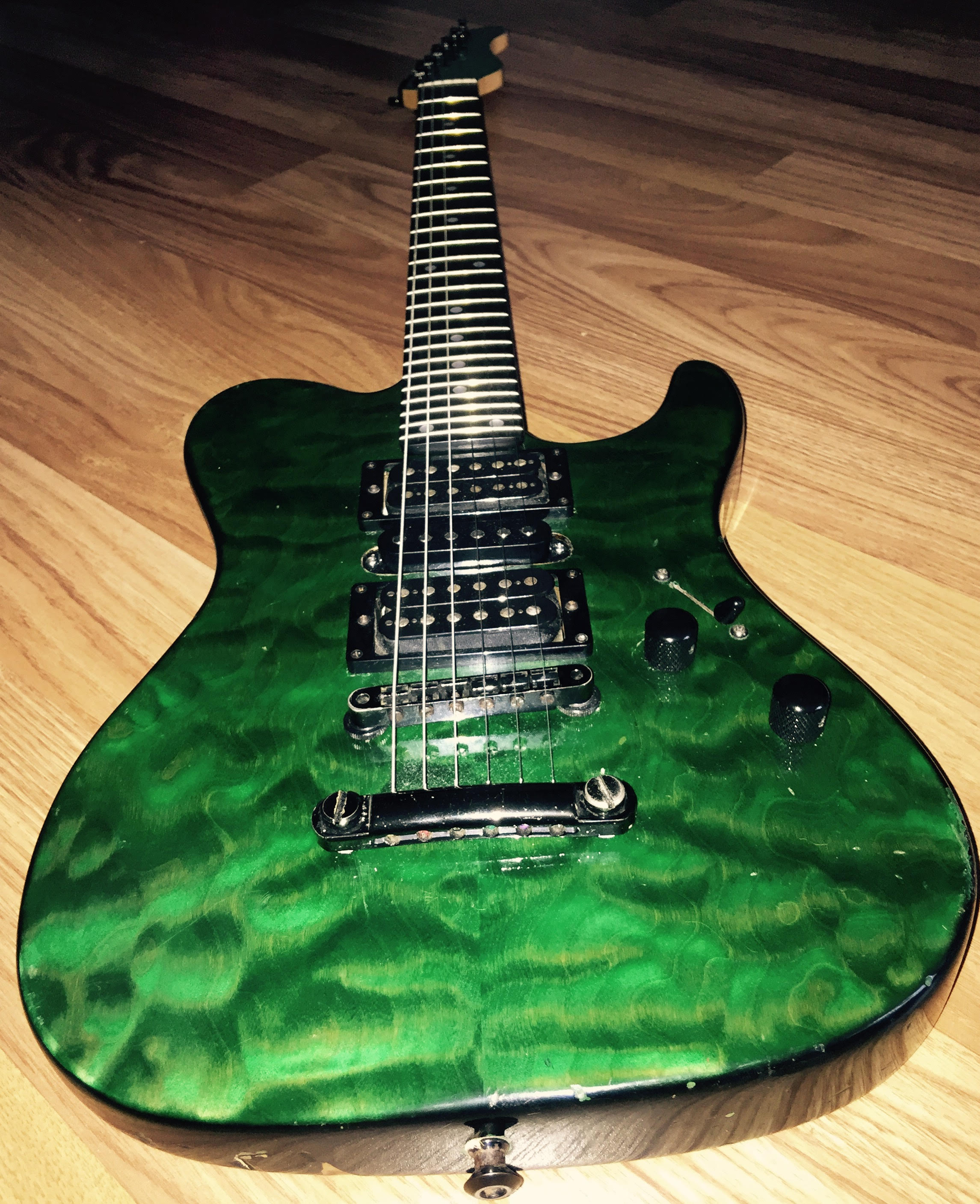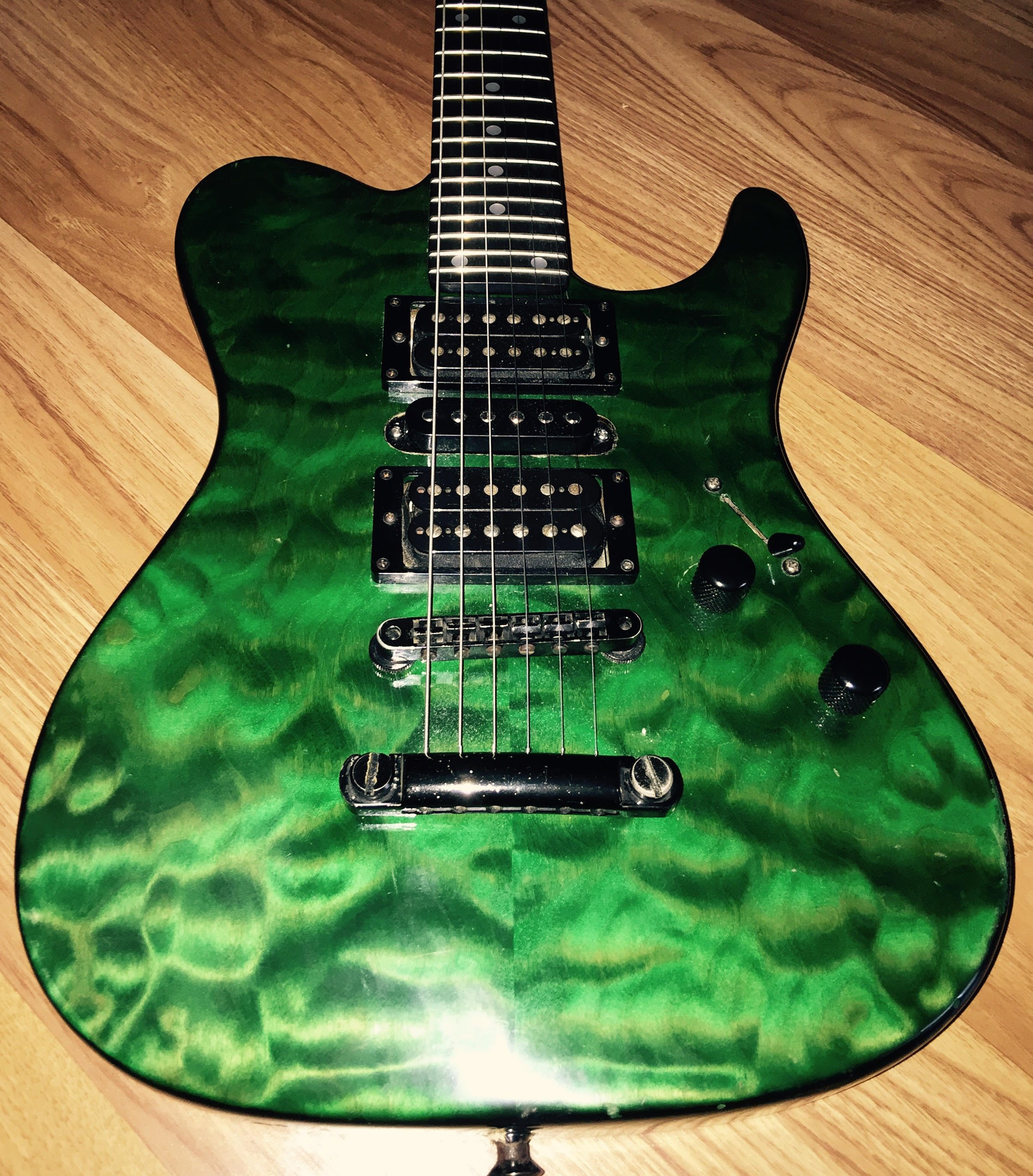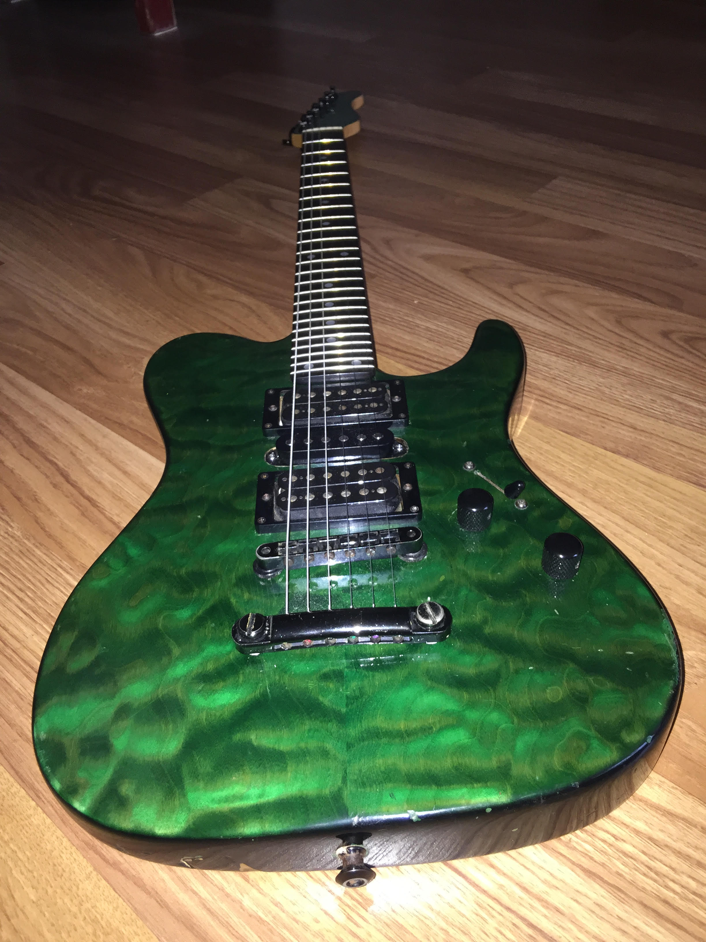 i bought it in 2016 from a small (house)dealer in Apeldoorn called RJV Guitars.he said it came from Italy .before i bought it i contacted Martin Miranda because it was a 7/8 guitar ,24 frets with 2 hum-buckers and a single coil in middle .never saw one with that configuration but he said that sometimes things where done to guitars specifically for the customer the guitar is very well used has a lot of ding and dongs all over.the custom pro gold logo has also faded over the years(but is still visible under good light circumstances ). the only modification is that i (always)removed the string trees for a straight string pull from the nut.the pick-ups are from Seymour Duncan. , ebony fretboard ,quilted maple bent top in transgreen.