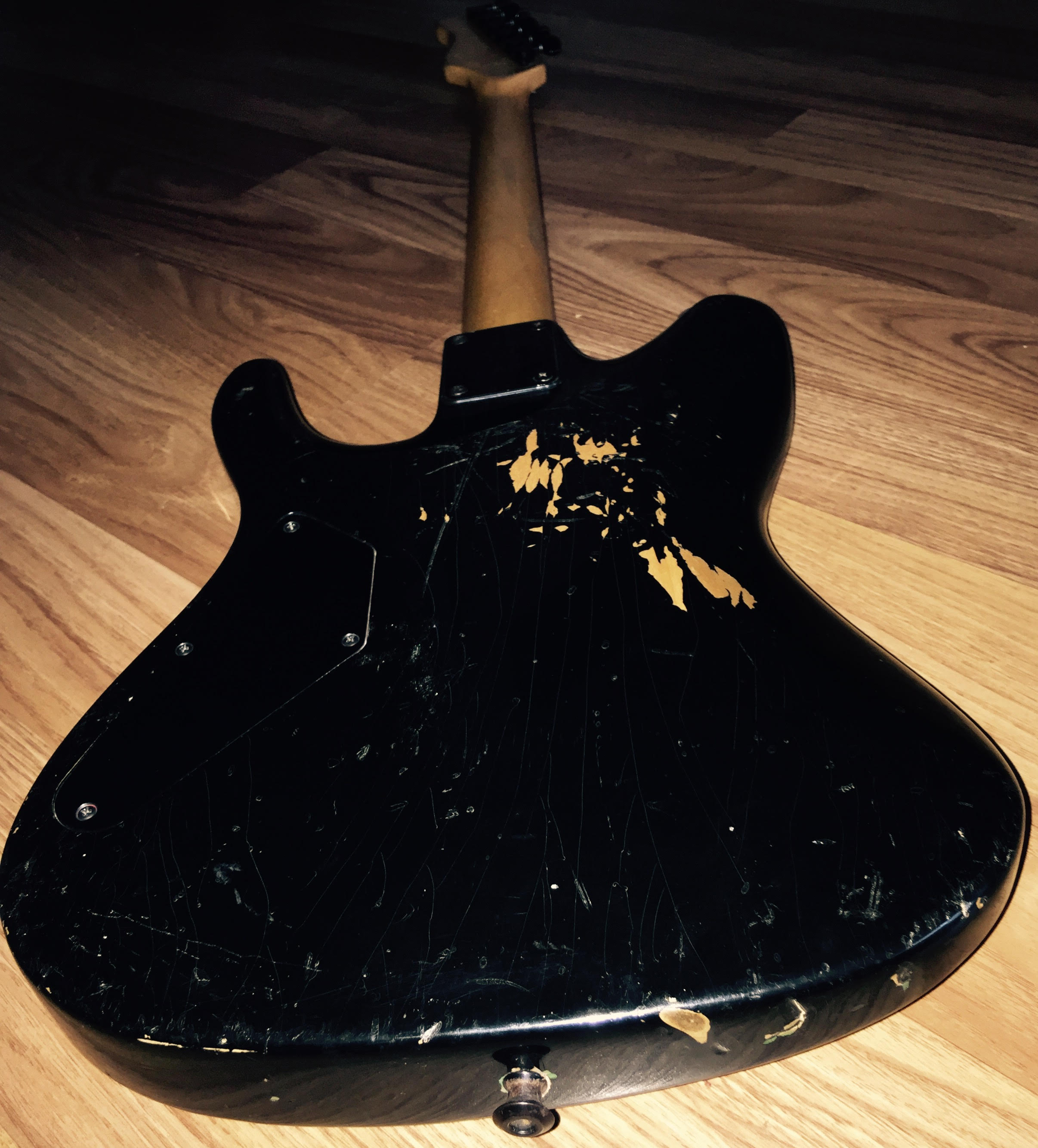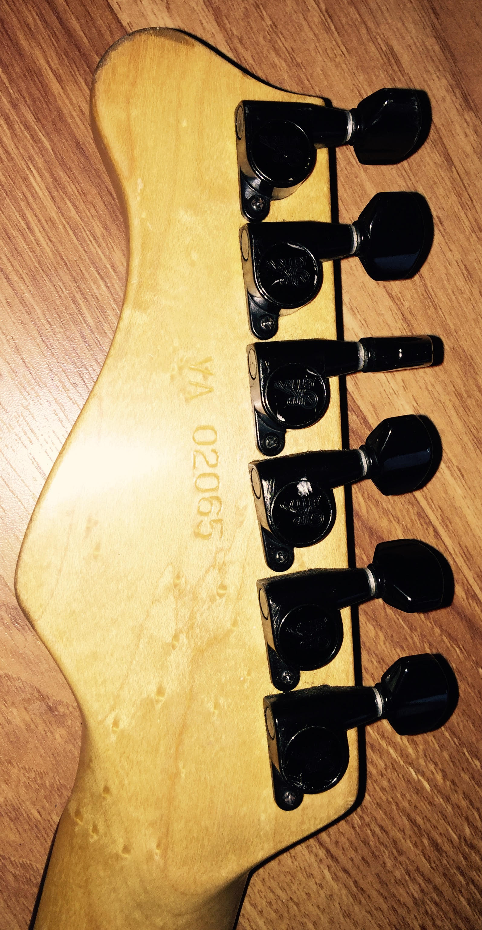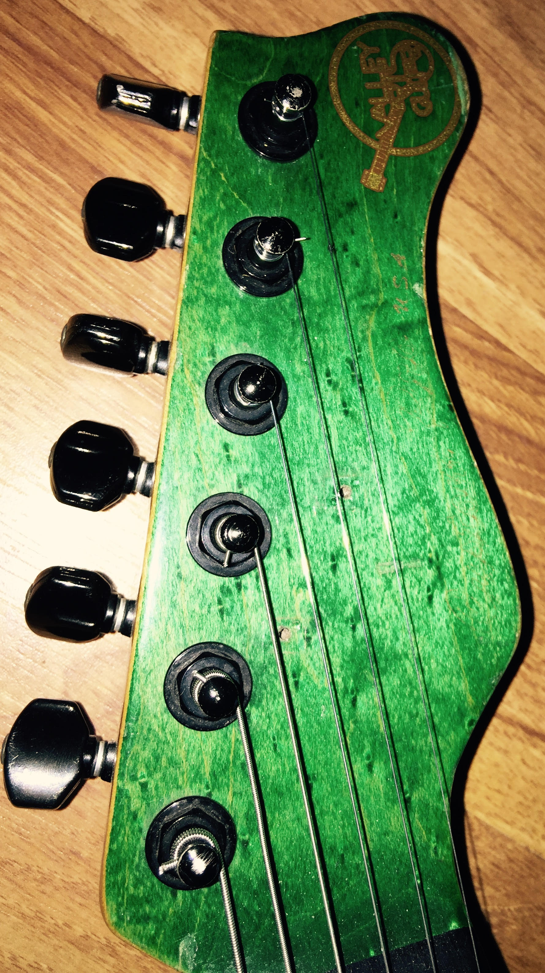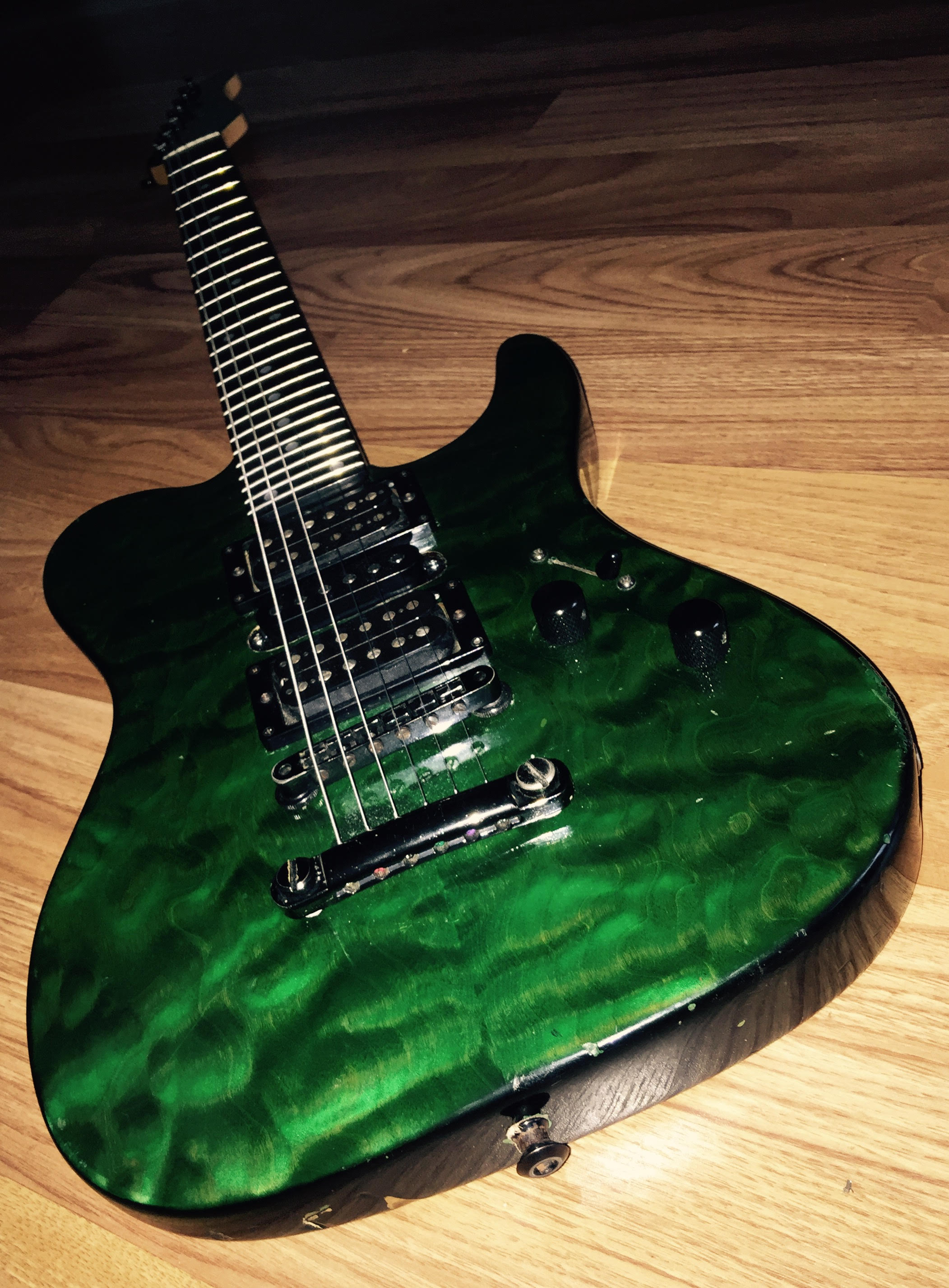 i bought it in 2016 from a small (house)dealer in Apeldoorn called RJV Guitars.he said it came from Italy .before i bought it i contacted Martin Miranda because it was a 7/8 guitar ,24 frets with 2 hum-buckers and a single coil in middle .never saw one with that configuration but he said that sometimes things where done to guitars specifically for the customer the guitar is very well used has a lot of ding and dongs all over.the custom pro gold logo has also faded over the years(but is still visible under good light circumstances ). the only modification is that i (always)removed the string trees for a straight string pull from the nut.the pick-ups are from Seymour Duncan. , ebony fretboard ,quilted maple bent top in transgreen.
