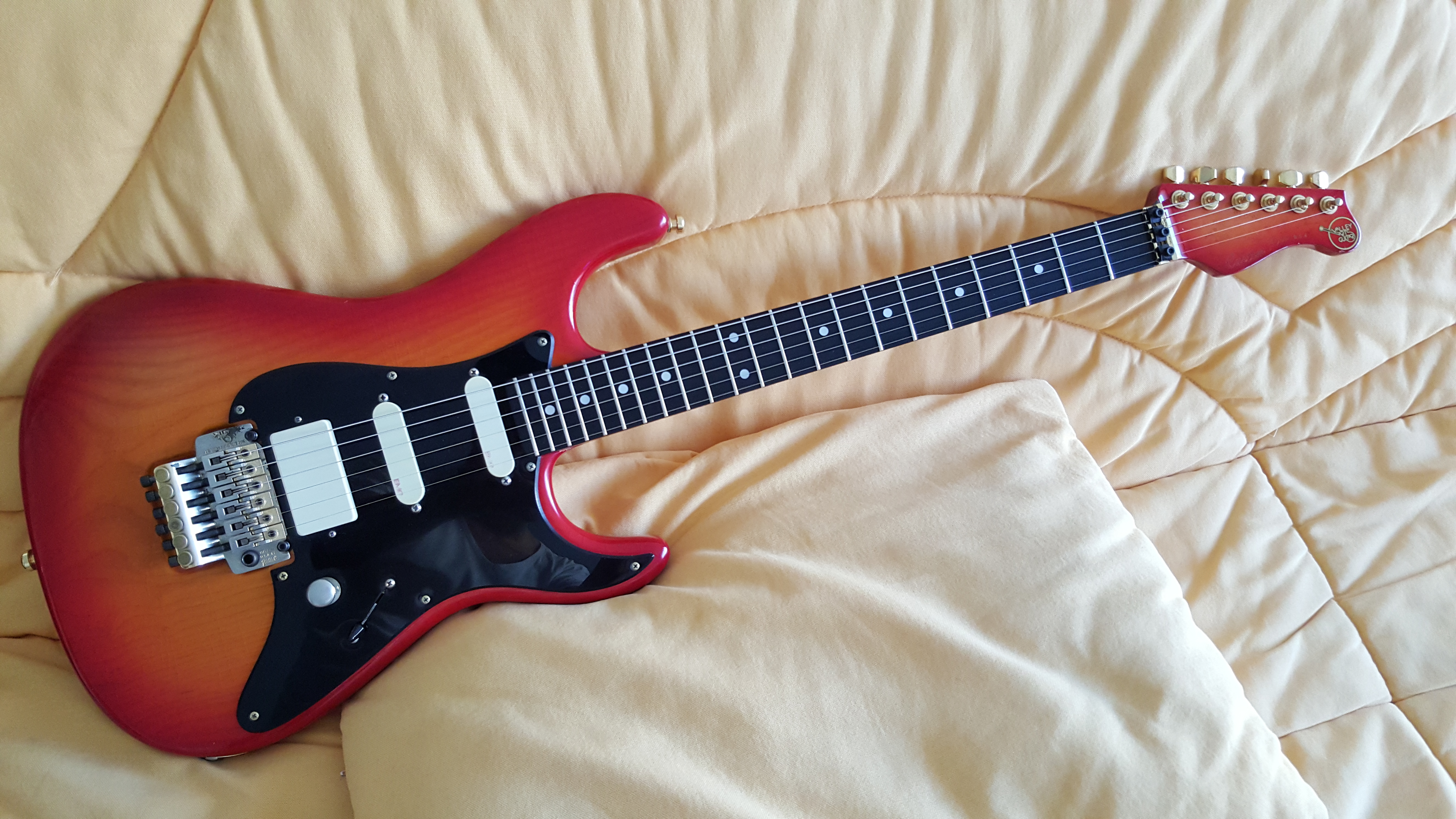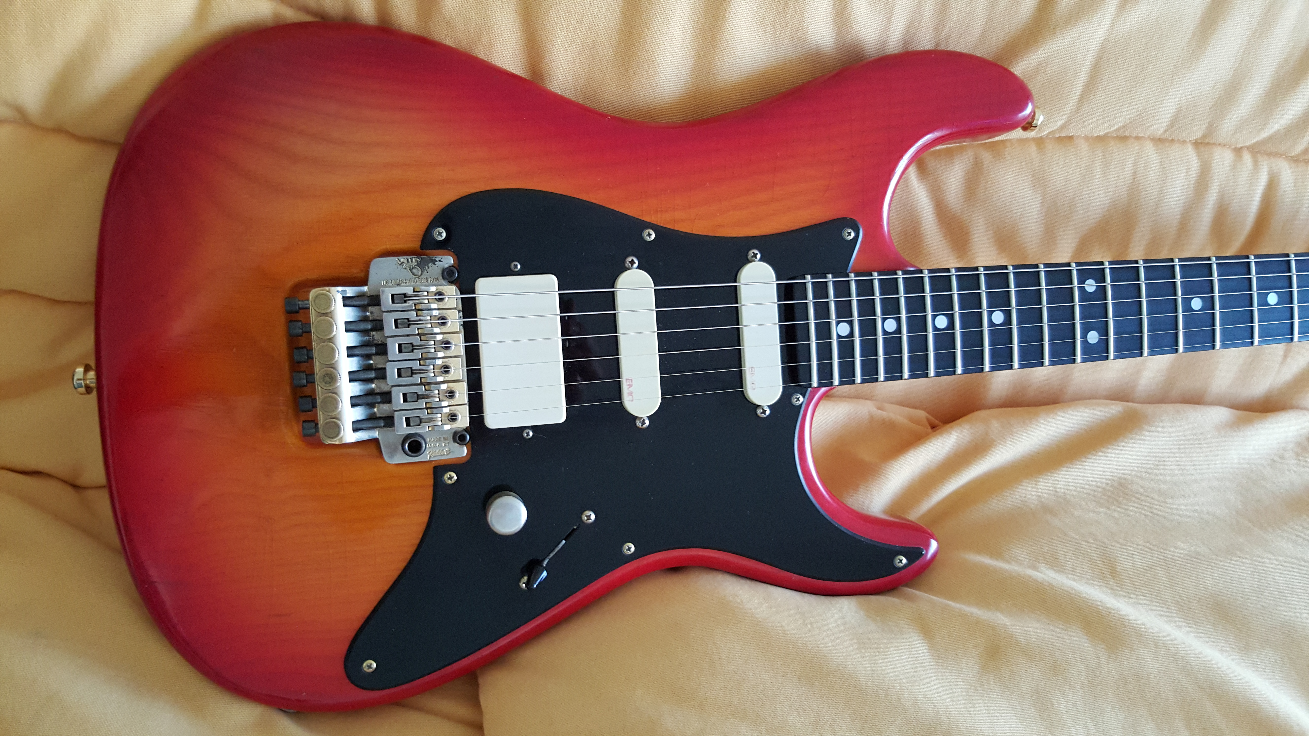 Swamp Ash body, beautiful birdseye maple neck, ebony fingerboard, EMG pickups, floyd rose kahler by VA. Everything is original. Fabulous sound: wide and rich, refined. The neck is confortable and faster, thinner than standard custom pro. it's my main guitar.