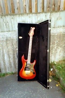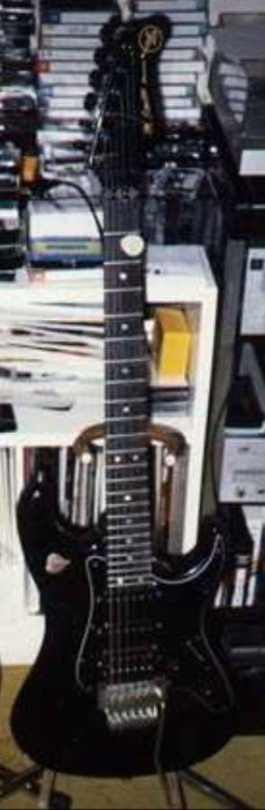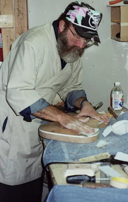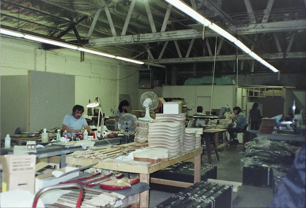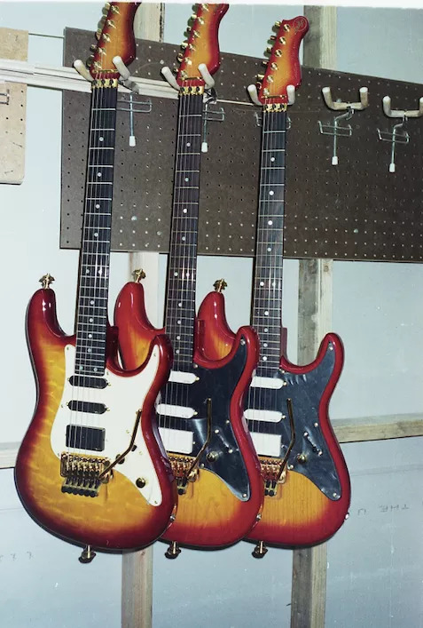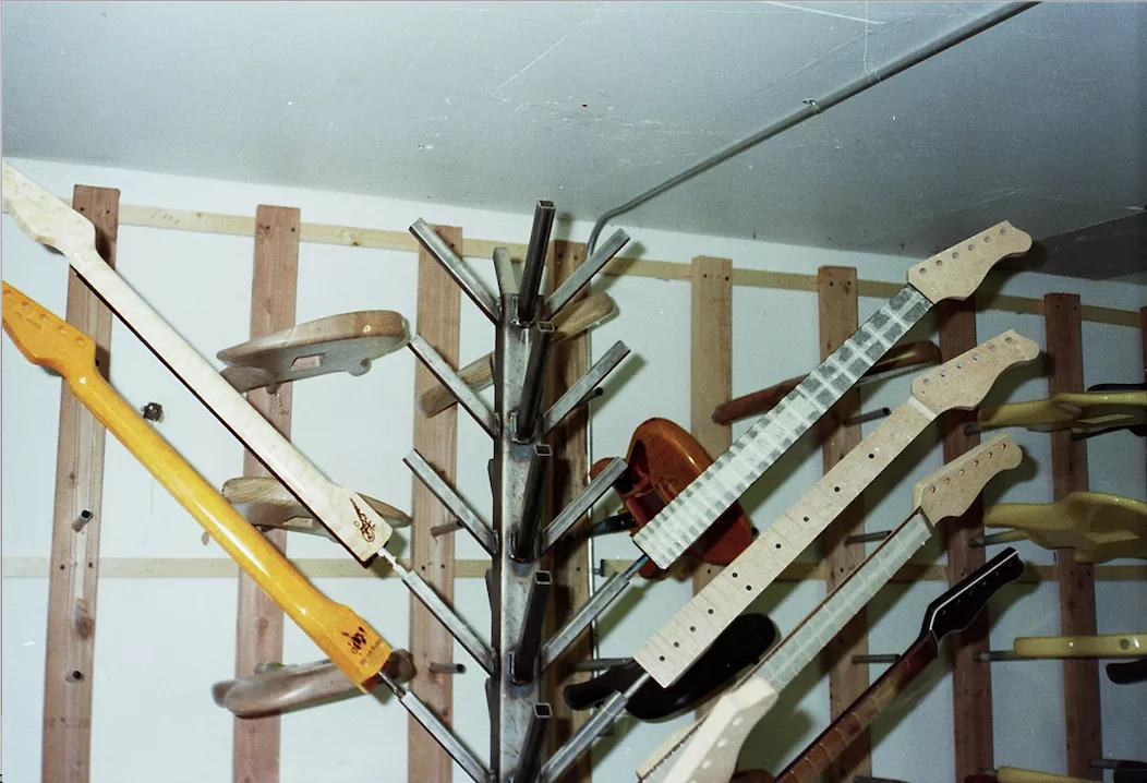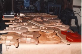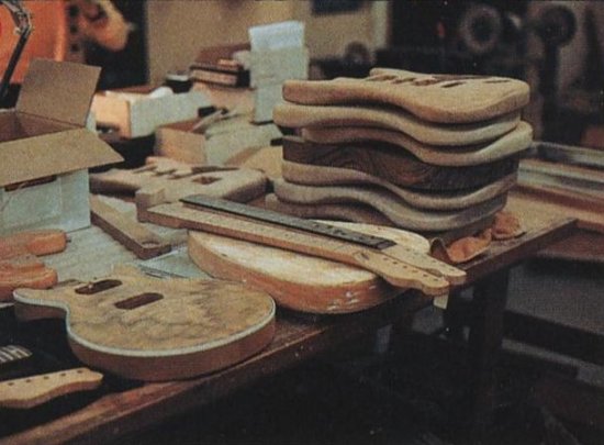 Now this is cool - photo taken from a japanese article of the VA workshop, notice the 'teardrop' guitar body (underneath the two guitar necks) on the bench. That is the VA John Crawford Bass body before it was built.
