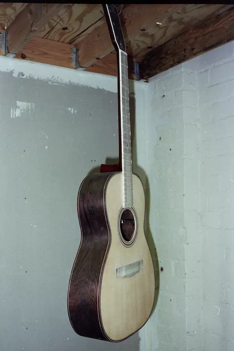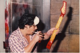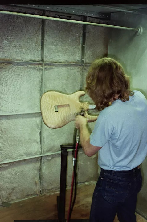 Some guitar bodies and necks on the floor and Regellio spraying neck for VA0192 (anyone got it? Here's a shot of your guitar being made!!!) - thanks Bill!